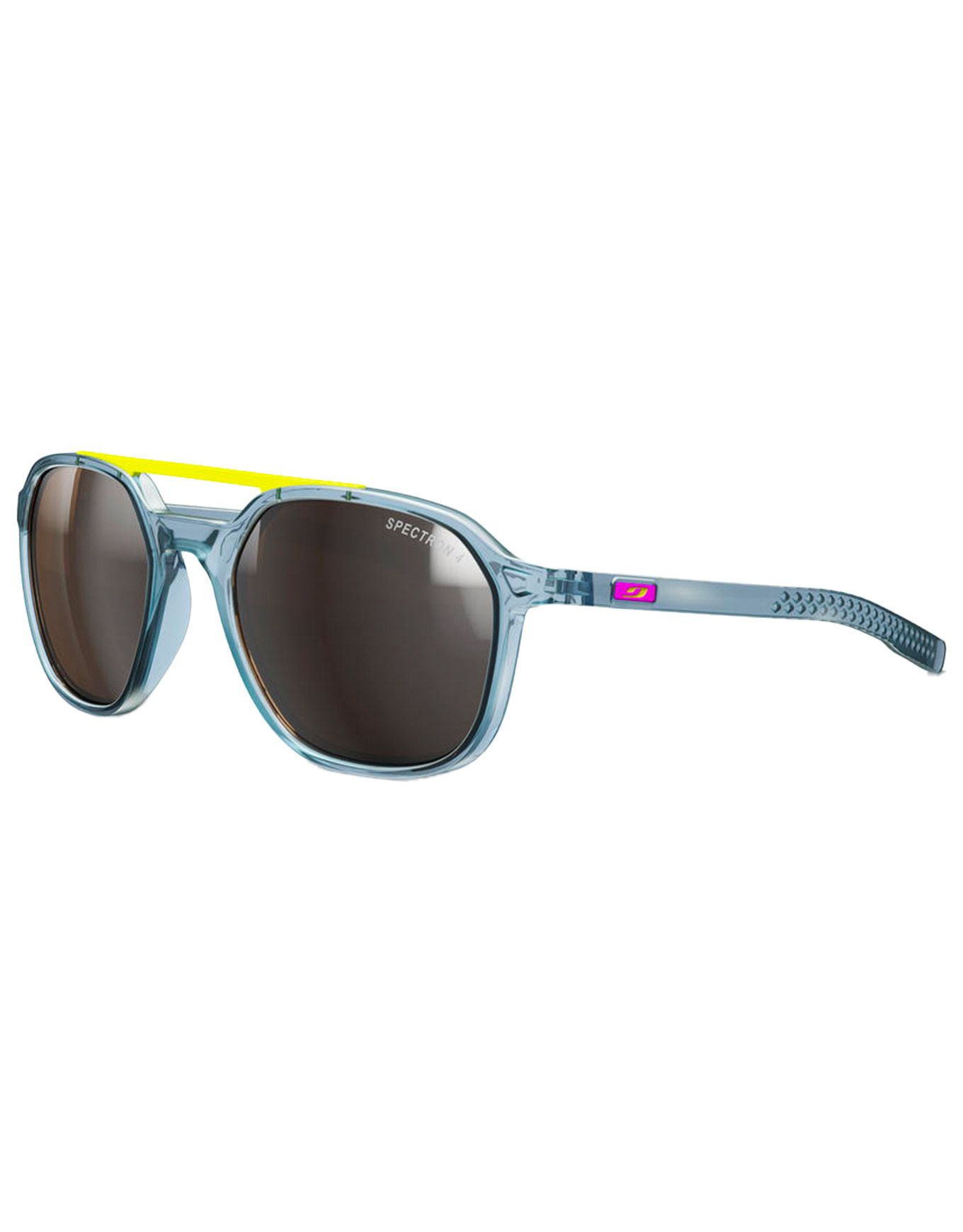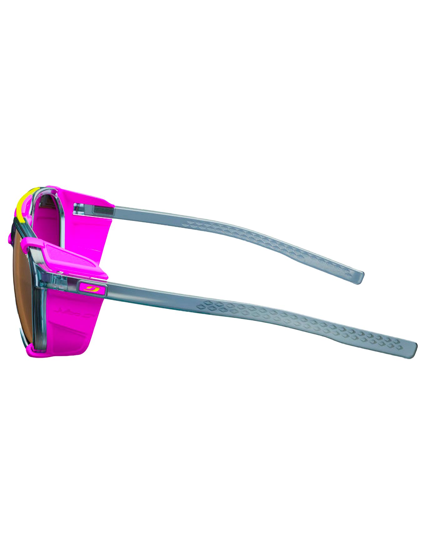 Les lunettes de soleil Julbo Slack Cover Spectron 4 Bleu/Rose Fluo offrent un écran total en altitude grâce à leurs coques latérales et frontales amovibles, verres catégorie 4 antireflet et branches galbées pour maintien sportif.