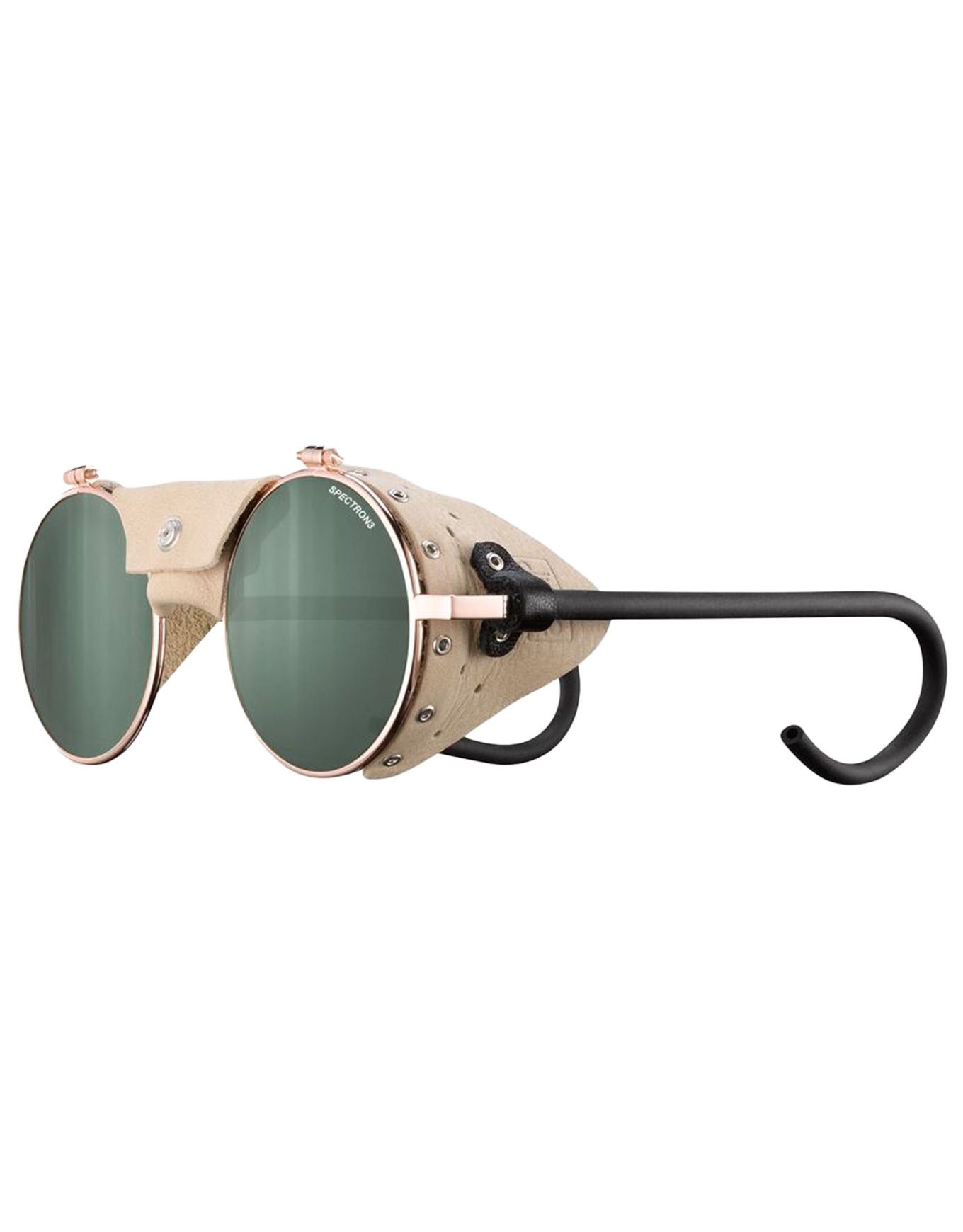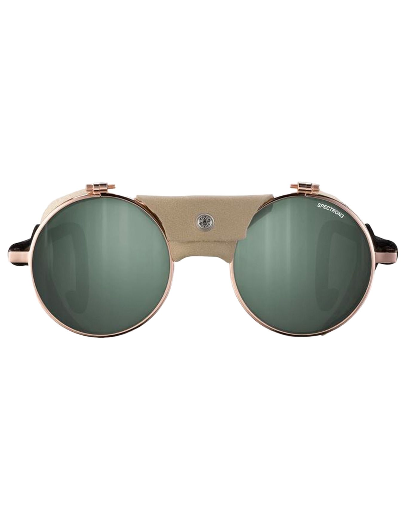 Les lunettes de soleil Julbo Vermont Classic Or Rose/Beige Spectron 3 associent la monture glacier en métal emblématique, coques latérales et nez en cuir pour une protection solaire maximale en haute montagne. Verres Spectron 3 catégorie 3, branches courbées à embouts flexibles et technologie RX Ready pour prescription personnalisée.