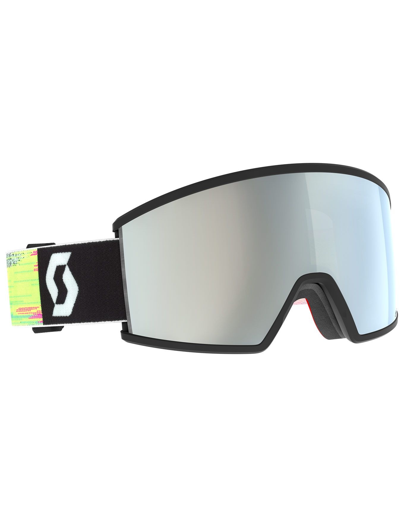 Masque de ski Scott Ambit Black/Neon Yellow AMP White Chrome S2 offrant un large champ de vision grâce à sa lentile miroir catégorie 2, traitement anti-buée NoFog™, mousse faciale NoSweat triple couche et sangle silicone antidérapante.