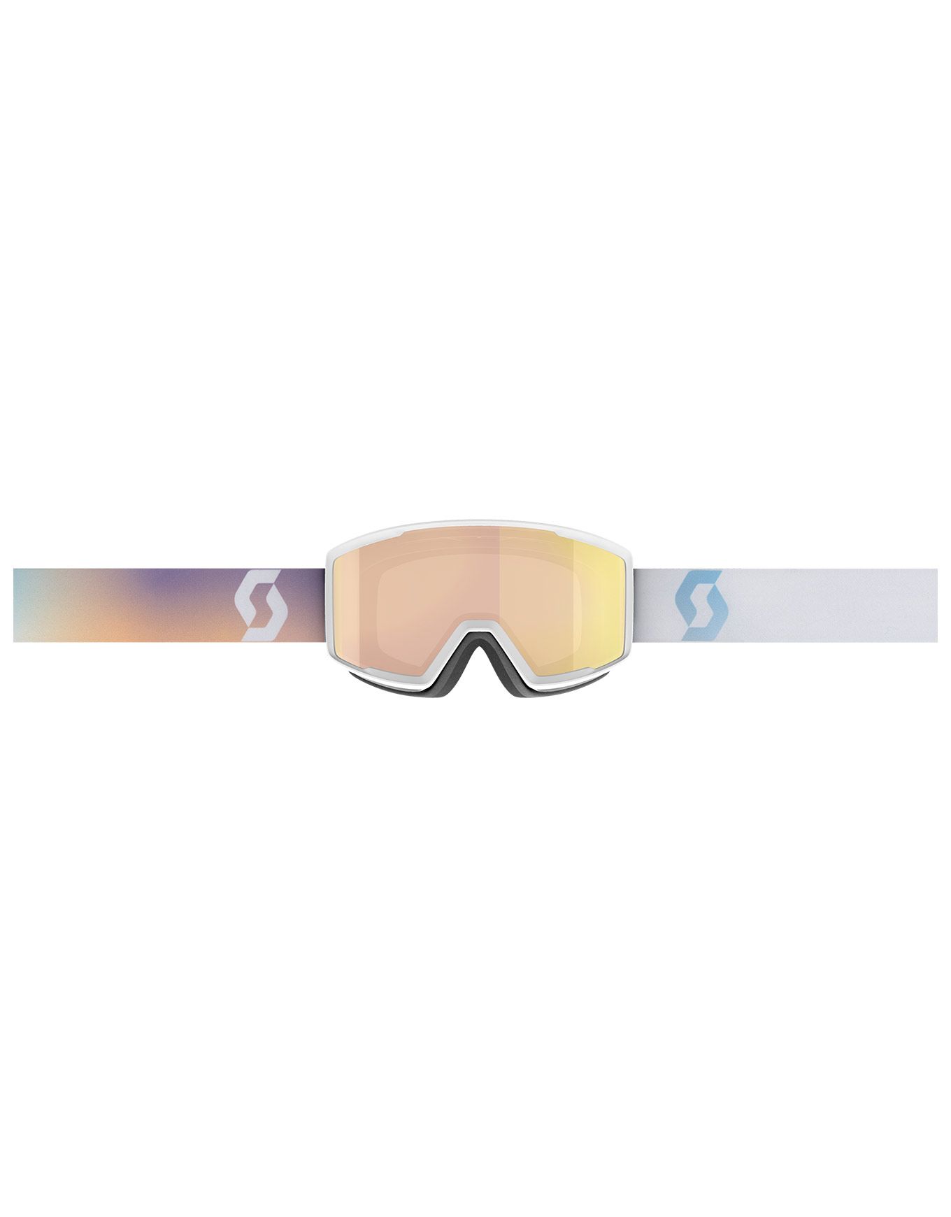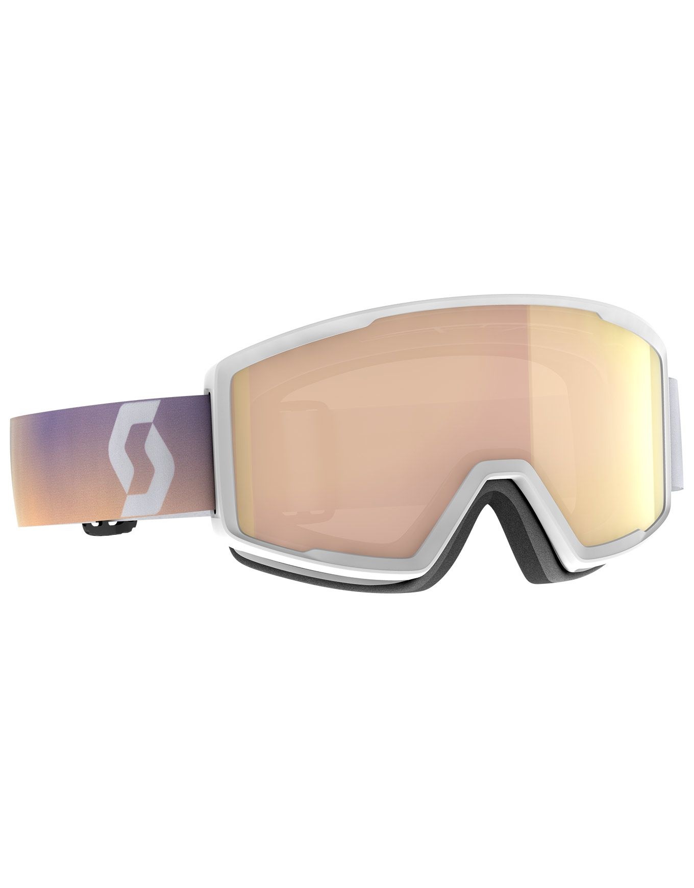 Masque de ski Scott Factor Pro White/Soft Pink AMP Rose Chrome S2 conçu pour visages fins à moyens, doté d’un écran cylindrique catégorie 2, technologie Amplifier et double mousse pour confort et vision nette par temps couvert.