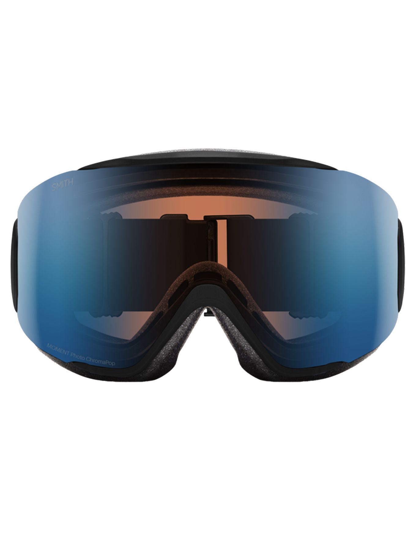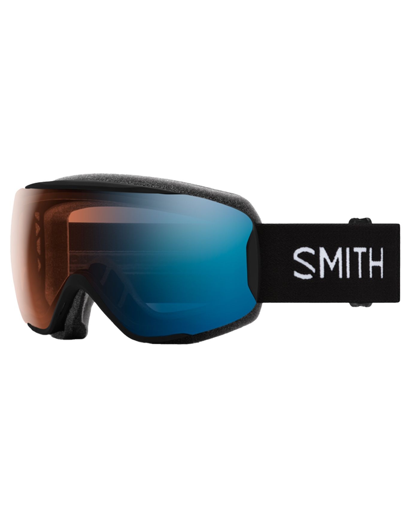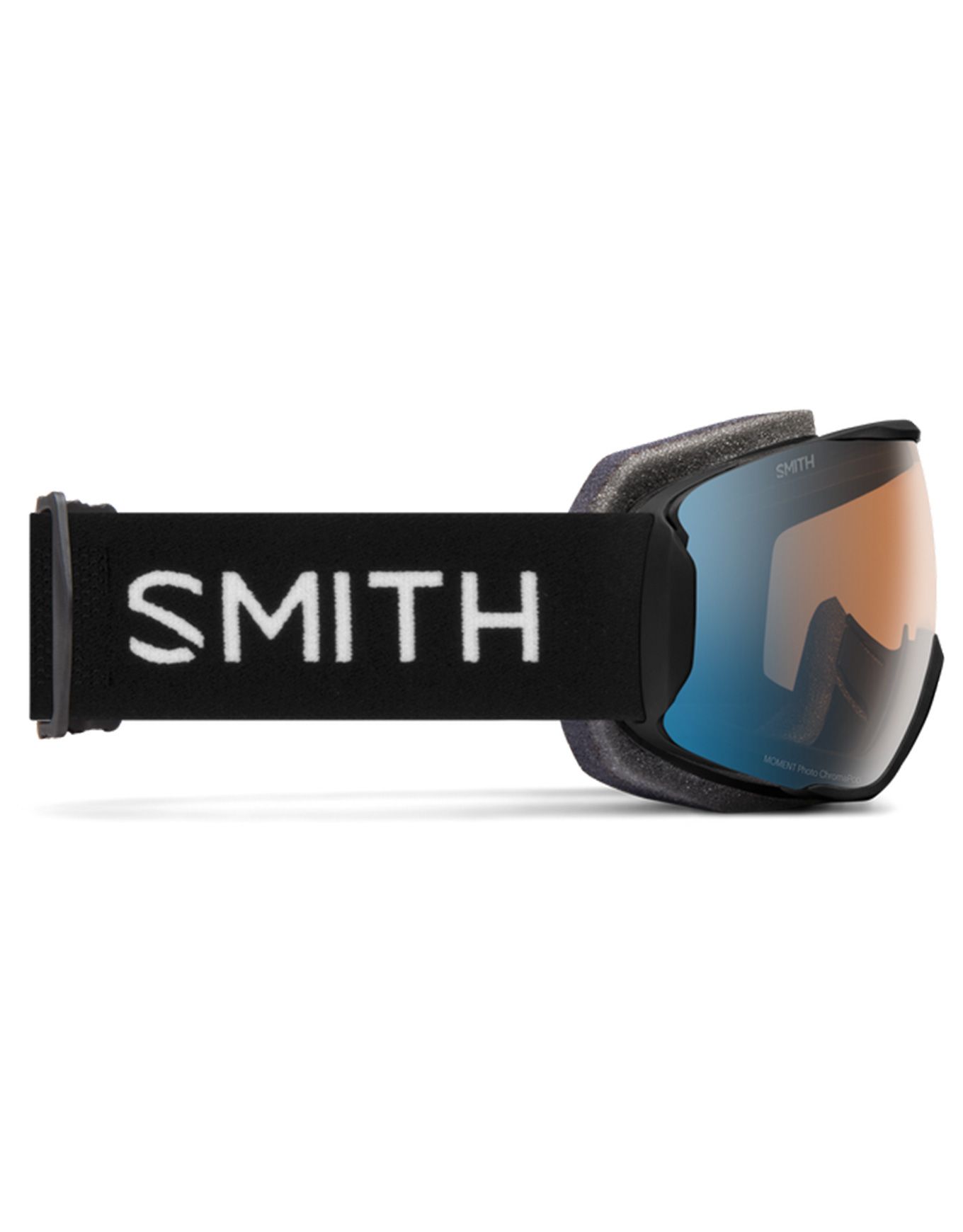 Masque de ski Smith Moment Black Chromapop Pro Photochromic Blue Mirror pour femme, écran sphérique 1-3 auto-adaptatif, anti-buée Fog-X, monture Responsive Fit™ et mousse DriWix pour vision claire et confort sur piste ou hors-piste.