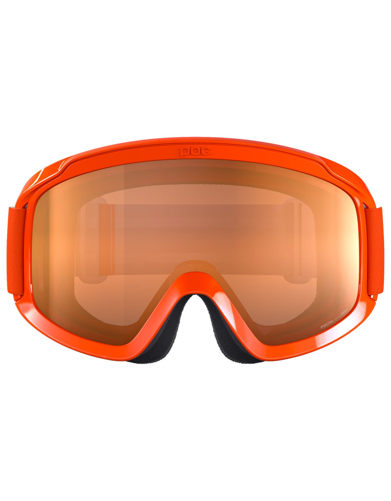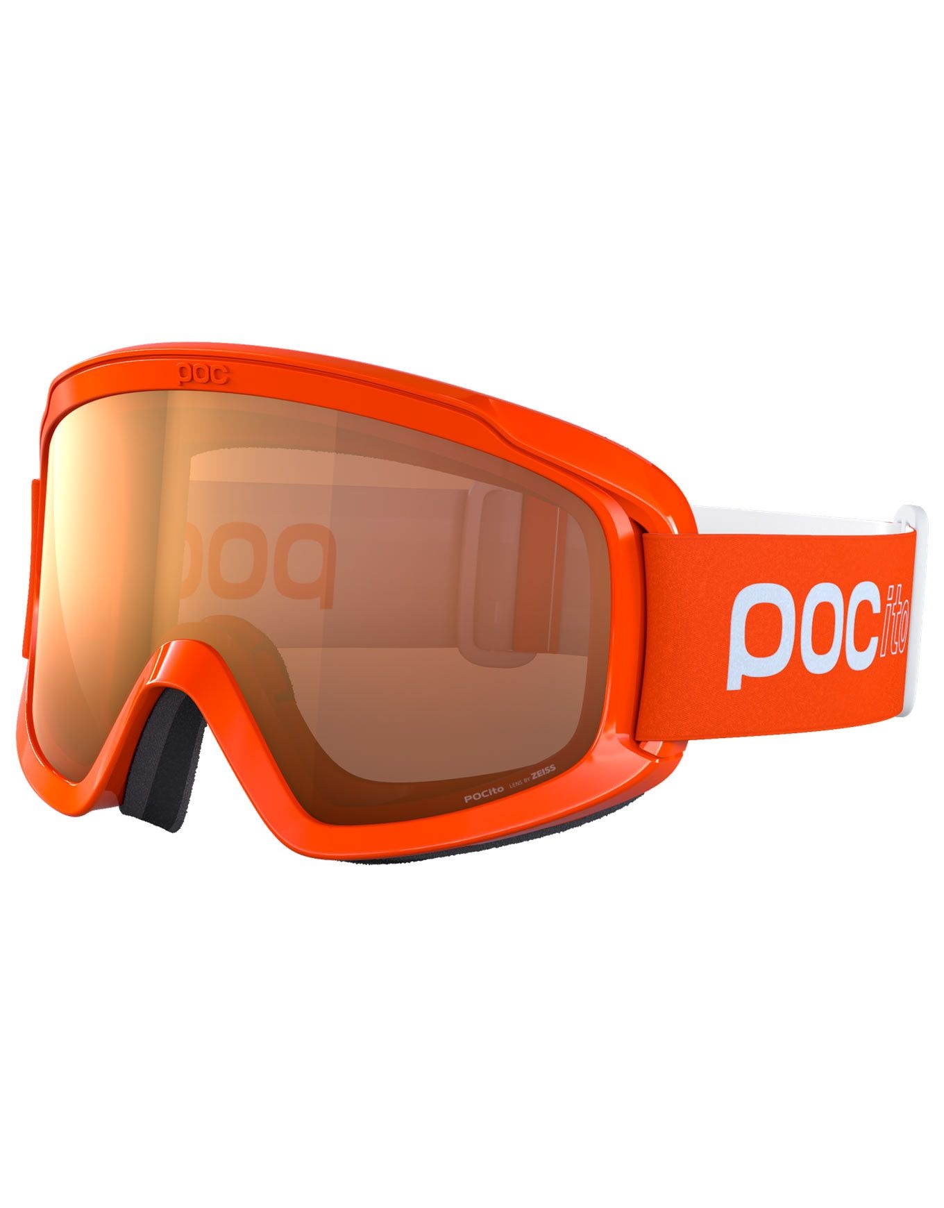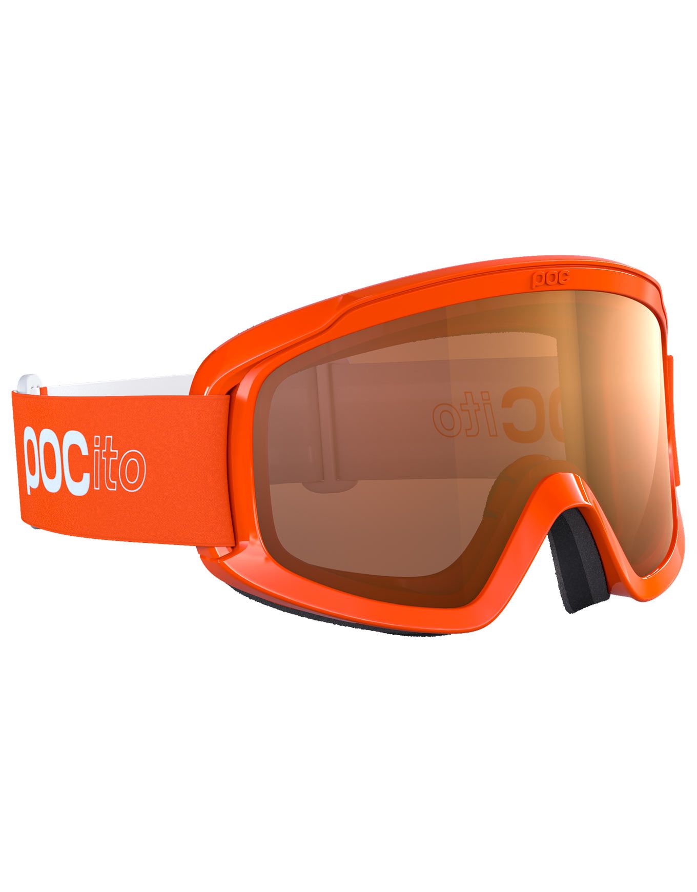 Masque de ski POC POCito Opsin Fluorescent Orange conçu pour enfants dès 3 ans avec monture souple polyuréthane, double lentille anti-rayures et anti-buée, mousse triple couche et patchs réfléchissants pour une visibilité accrue sur les pistes.