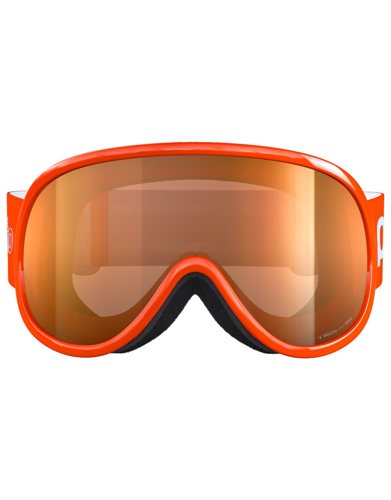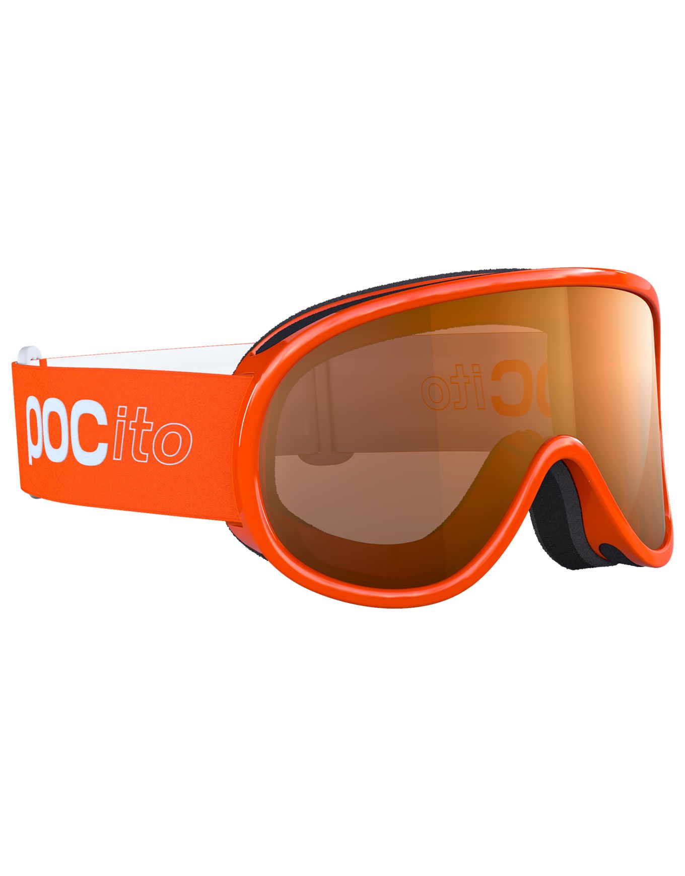 Le masque de ski POC Pocito Retina Fluorescent Orange est spécialement dimensionné pour les enfants : monture souple en polyuréthane, double lentille anti-buée et anti-rayures, sangle silicone et patchs réfléchissants pour une visibilité accrue sur les pistes.