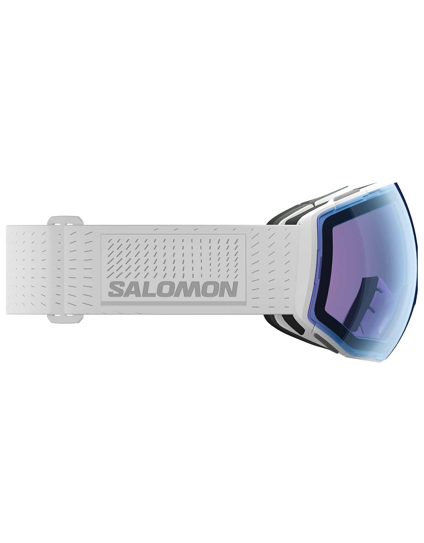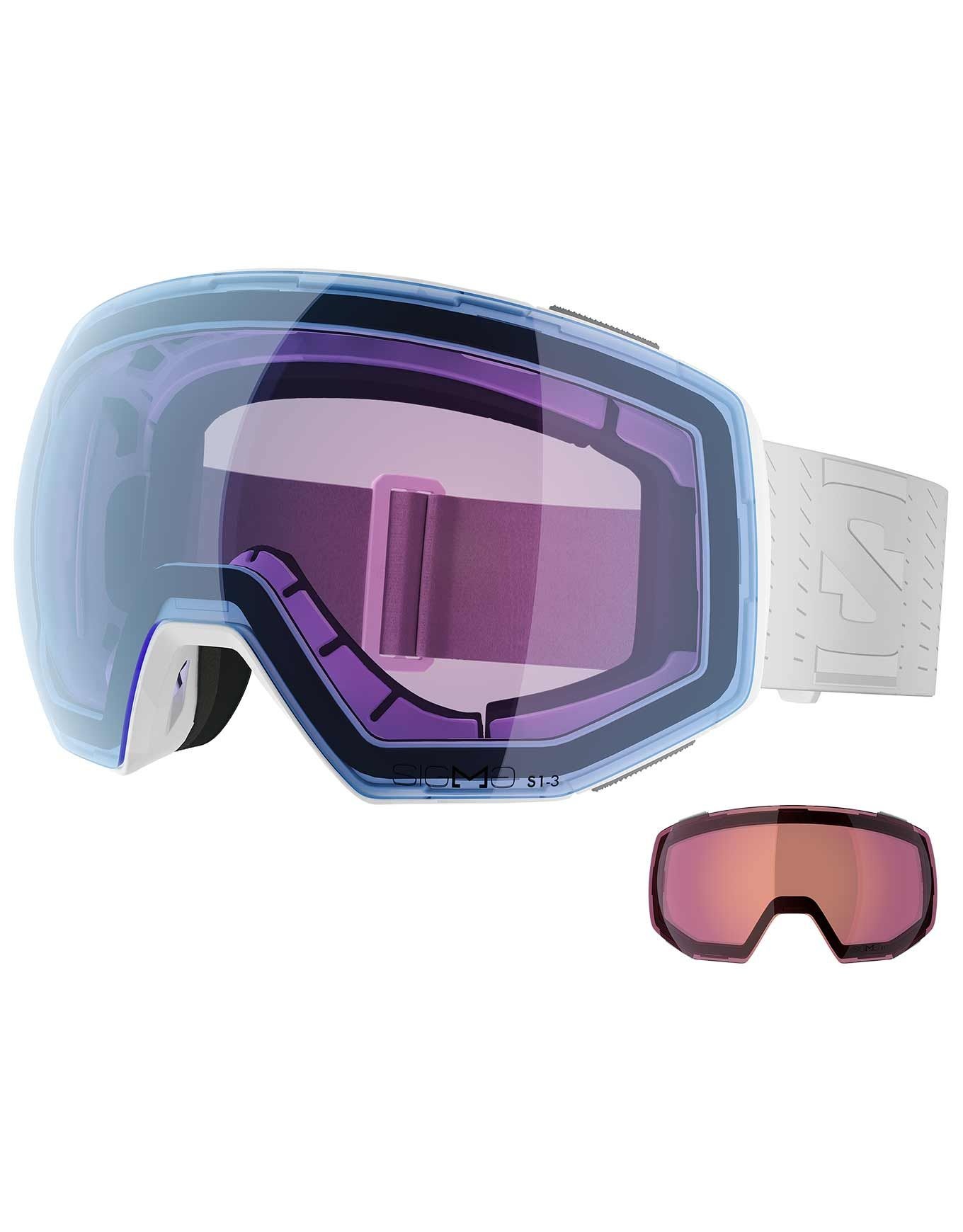 Masque de ski Salomon Radium Prime Sigma Photo White, sphérique pour larges visages, écran photochromique cat. 1-3 et technologie Sigma™ pour vision nette et contraste renforcé. Ventilation AirFlow, mousse triple épaisseur et Custom ID Fit assurent confort et anti-buée.