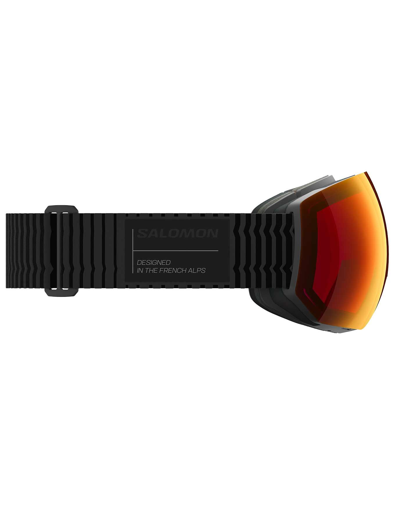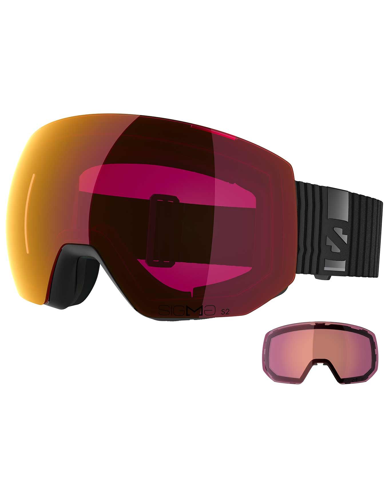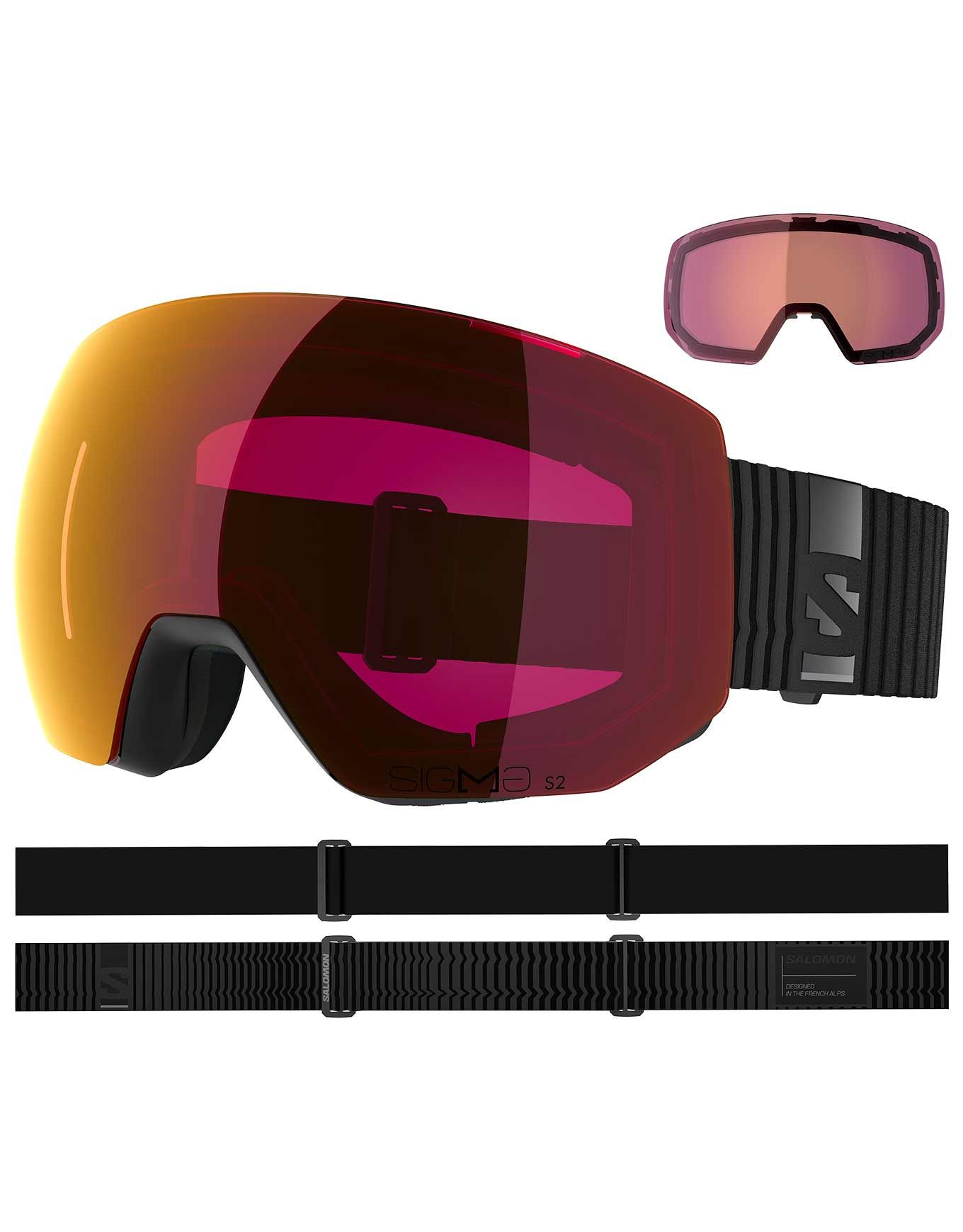Masque de ski Salomon Radium Pro Sigma Black, sphérique pour larges visages, double écran cat. 2/1 anti-buée AirFlow, mousse triple couche et Custom ID Fit pour un confort stable à vive allure.