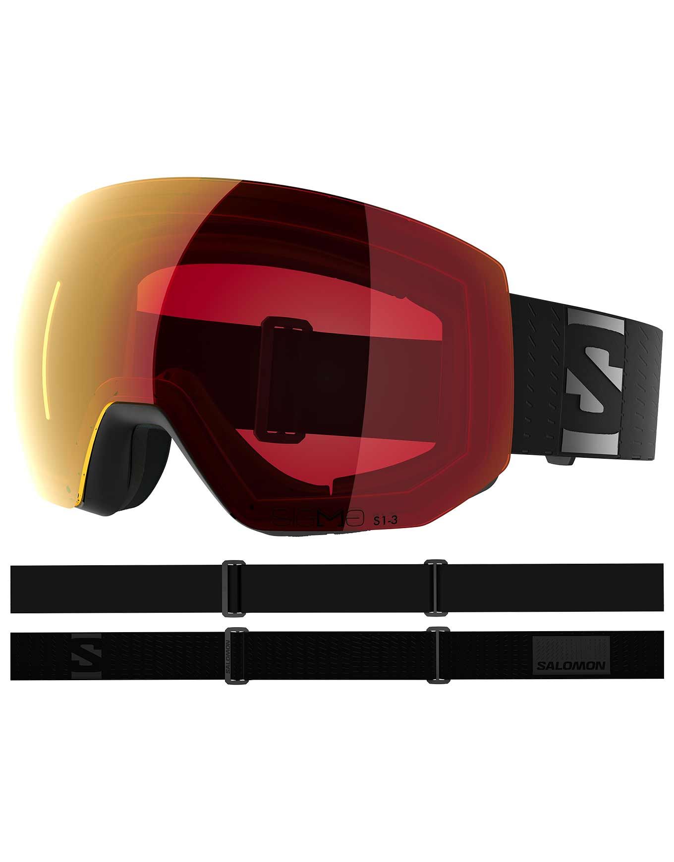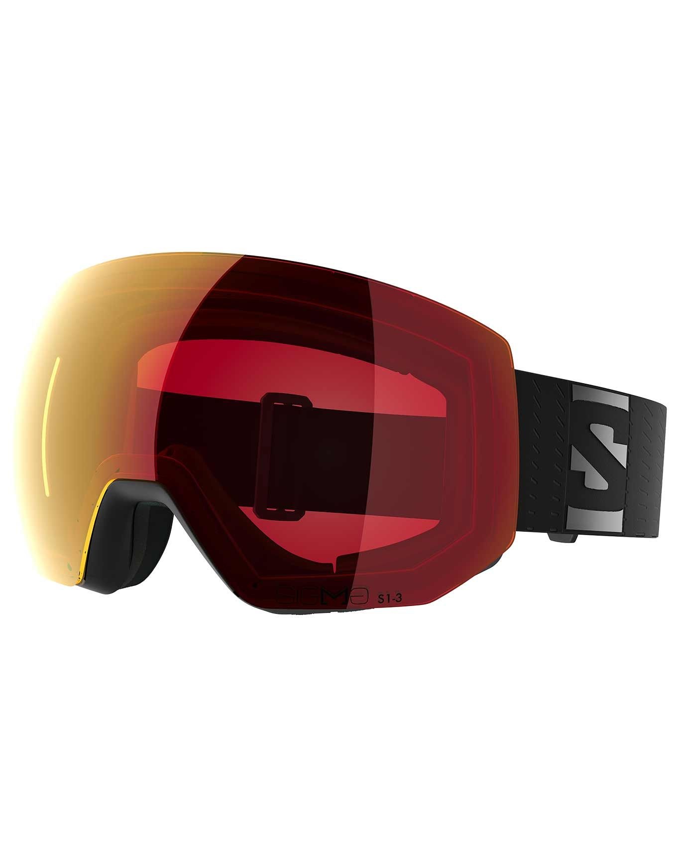 Masque de ski Salomon Radium Pro Sigma Photo Black, monture sphérique pour visages larges, écran photochromique cat. 1-3 et technologie Sigma™ maximisant vision et contraste, système AirFlow anti-buée et mousse triple épaisseur pour un confort adapté.