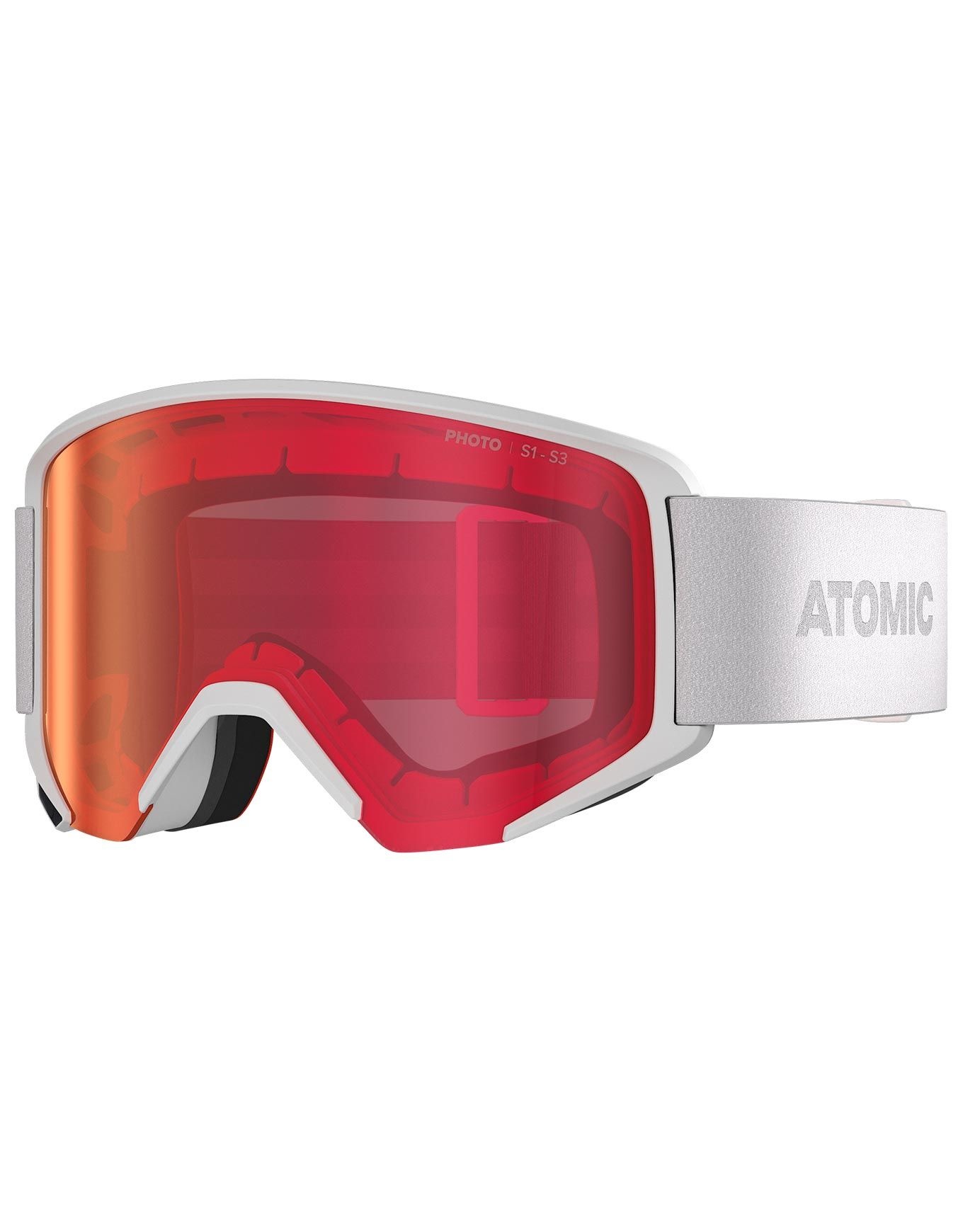 Masque de ski Atomic Savor L Photo White à écran photochromique Red Photo, traité hydrophobe, anti-rayures et anti-buée, mousse tri-couche Live Fit adaptative, monture élargie OTG Lite pour lunettes.