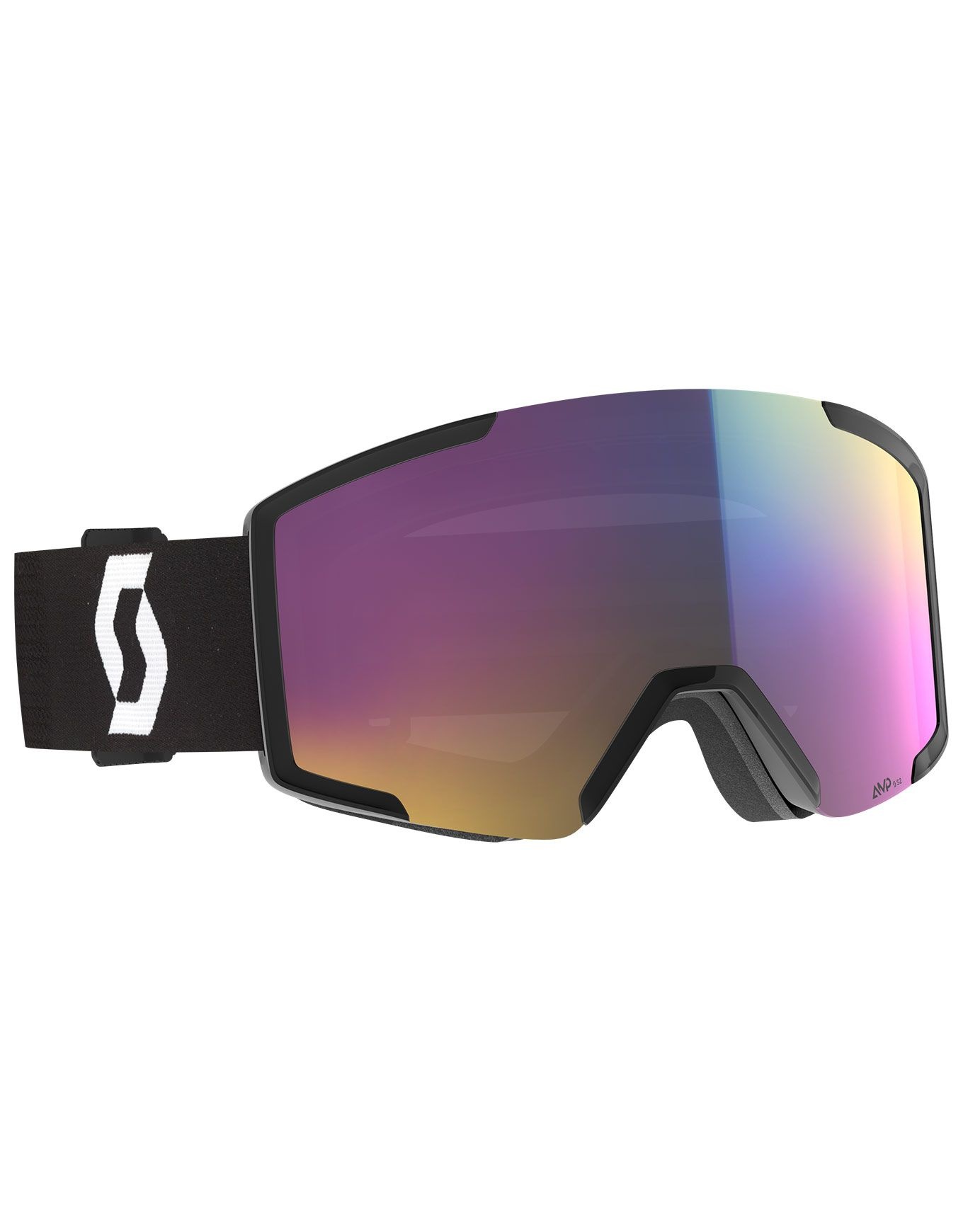 Le masque de ski Scott Shield Mineral Black/White AMP Teal Chrome S2 combine écran cylindrique catégorie 2, technologie Amplifier et mousse triple couche pour un confort fiable par temps changeant.