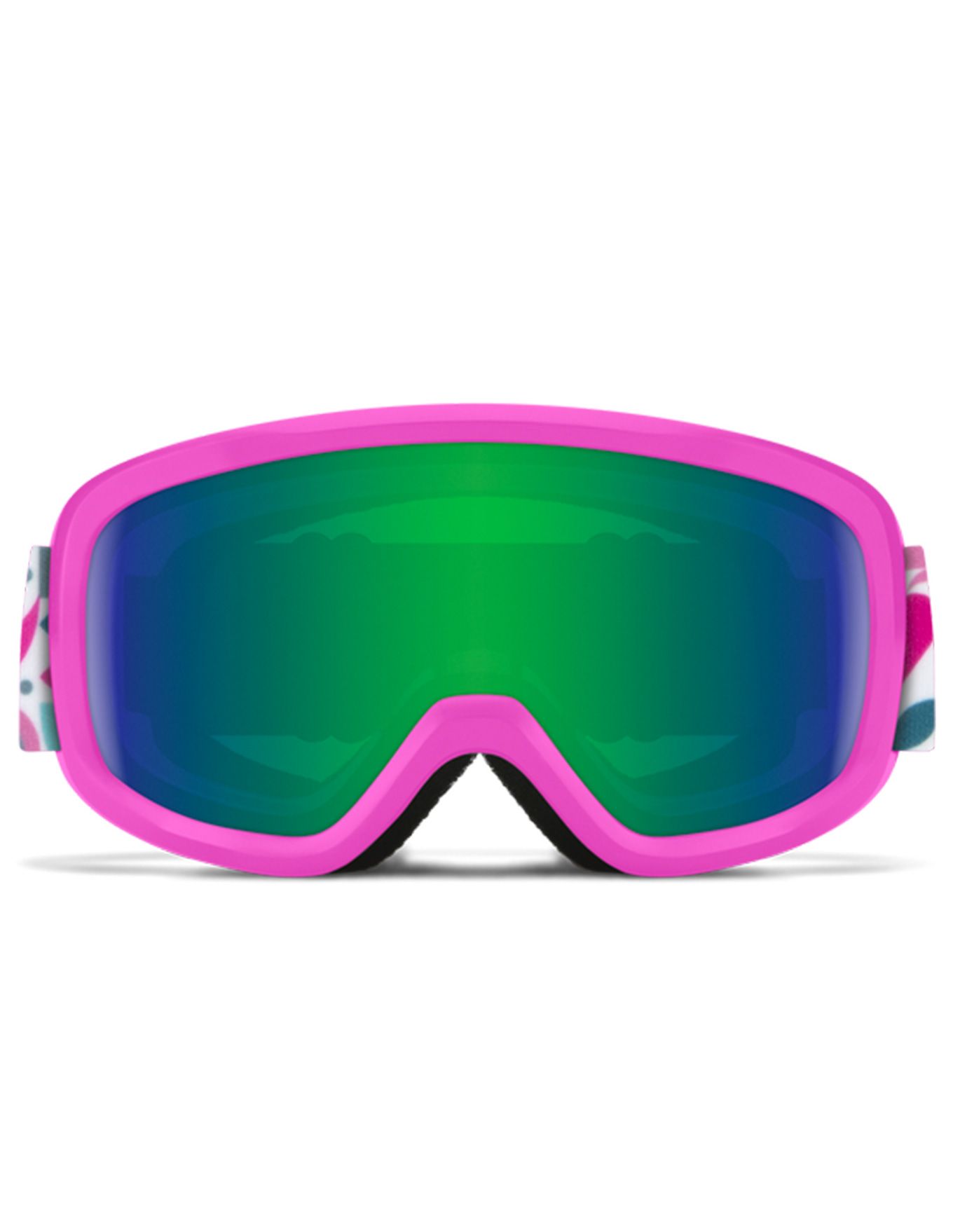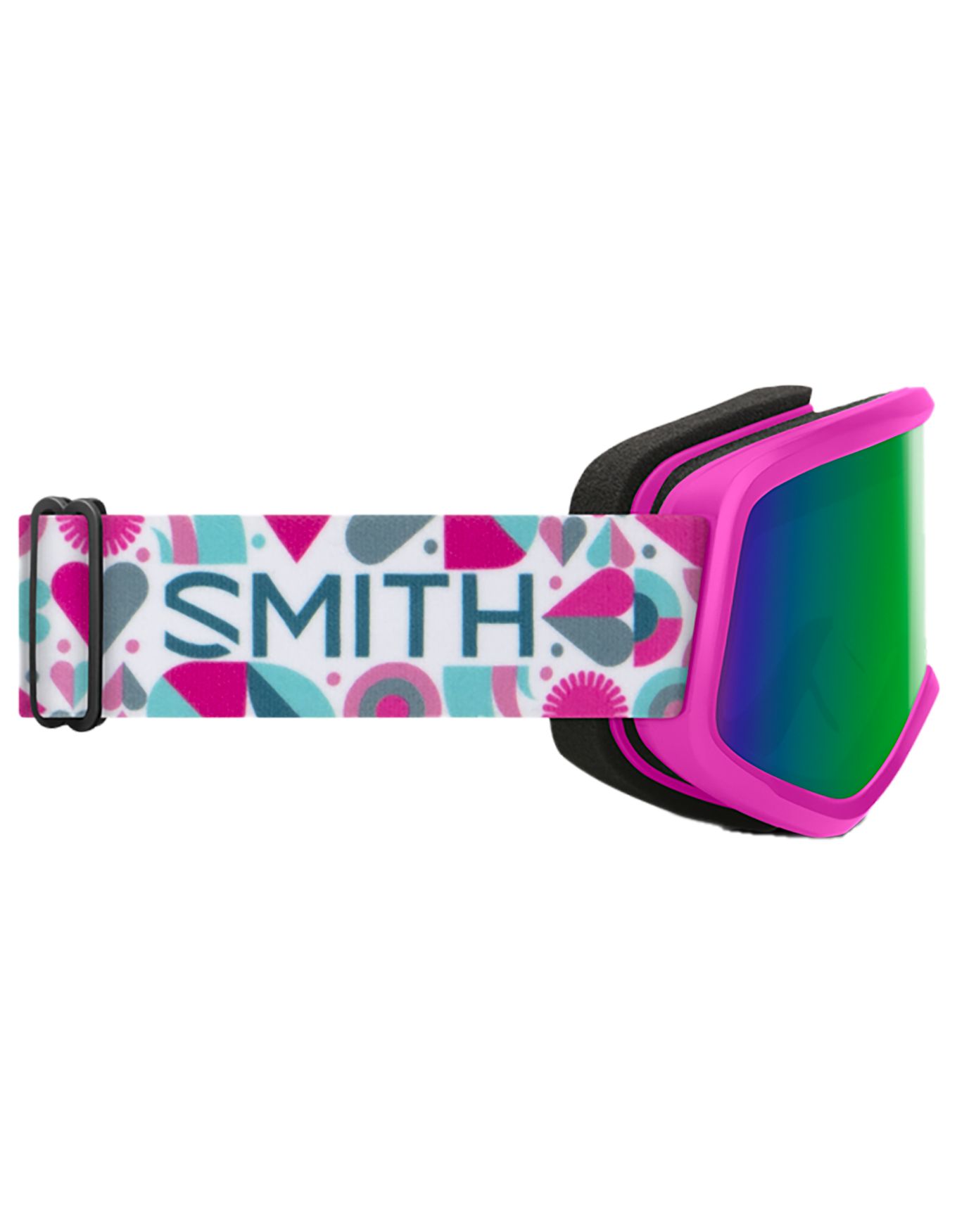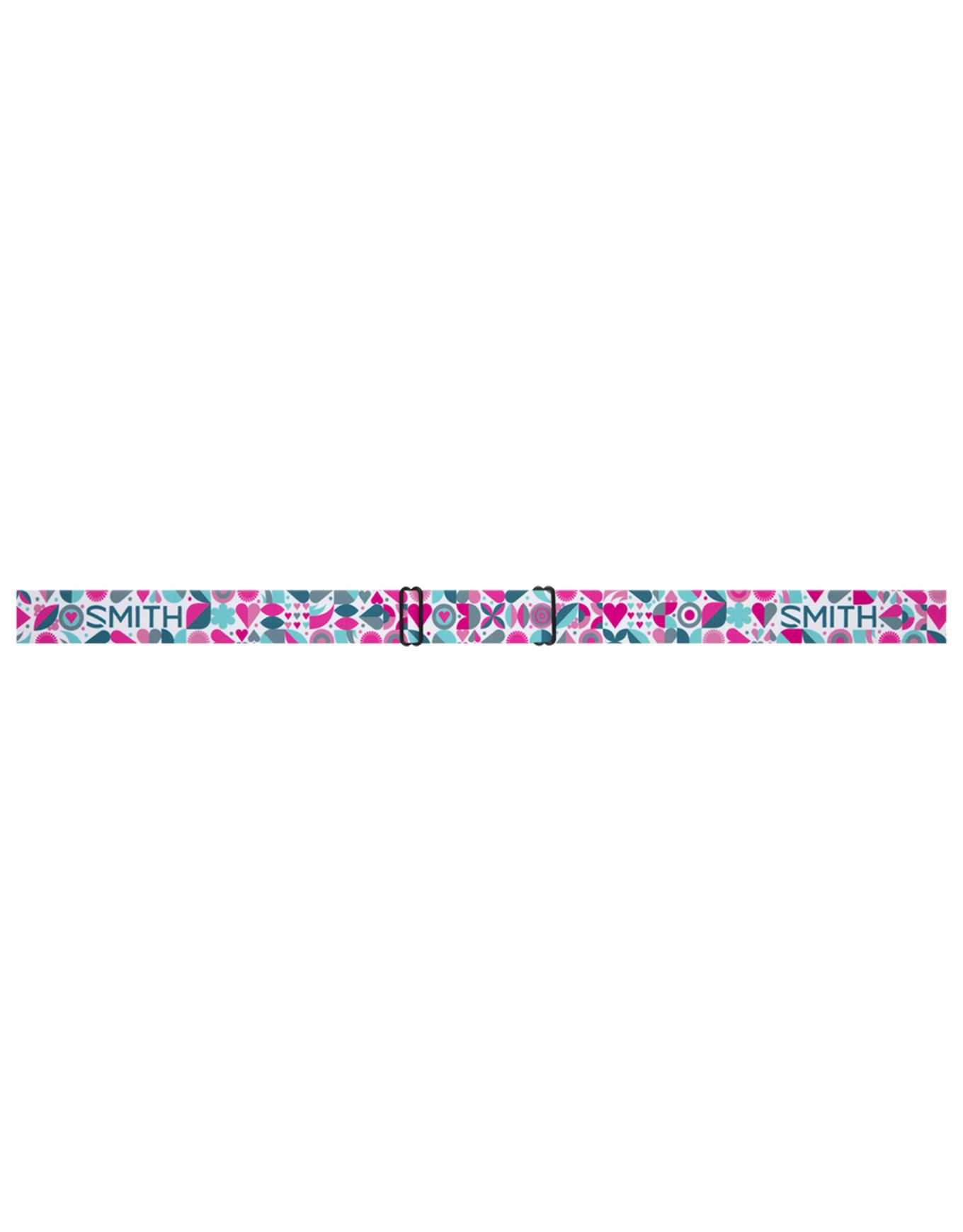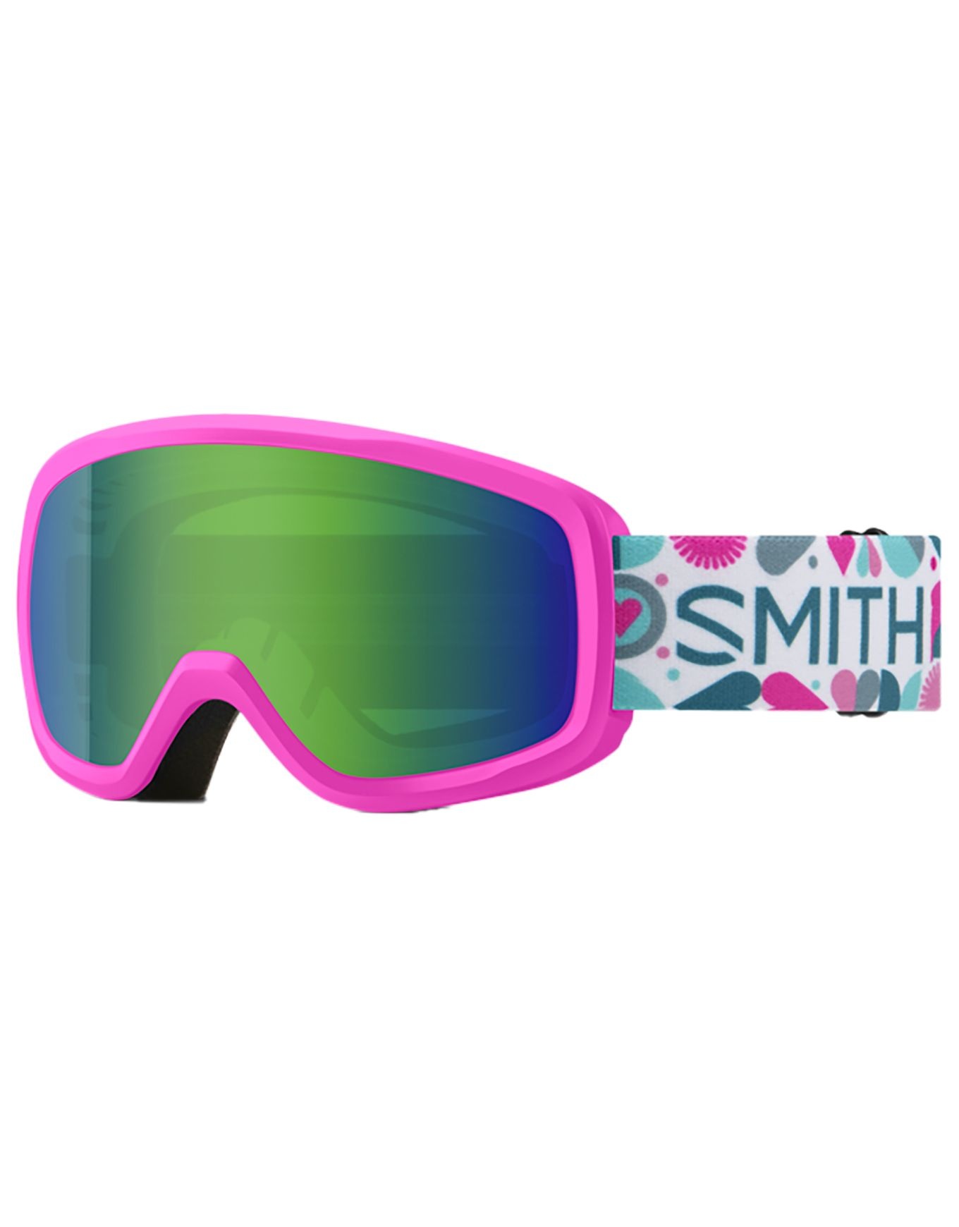 Masque de ski Smith Snowday Vivid Pink Hearts Green Sol-X Mirror enfant, écran sphérique Carbonic-X cat.3, antibuée Fog-X, compatible lunettes, mousse DriWix, intégration casque Smith.