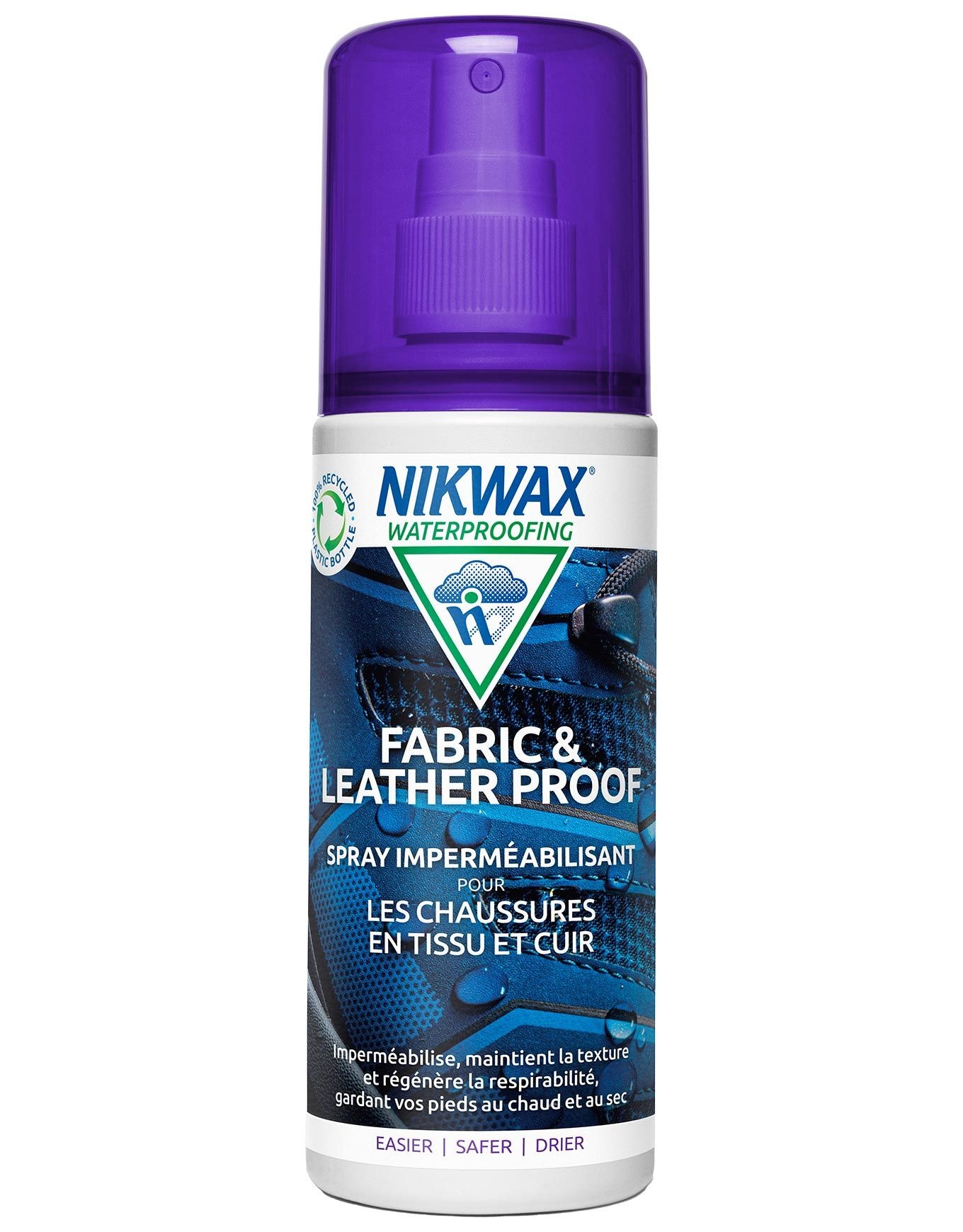 Le spray Nikwax Fabric & Leather Proof est un imperméabilisant aqueux prêt à l’emploi, conçu pour l’entretien des chaussures mêlant textile et cuir. Il forme un bouclier invisible qui repousse l’eau, préserve la souplesse, l’aspect initial et la respirabilité des modèles bi-matières (polyamide, Cordura, cuir…). Pourquoi la respirabilité est liée à la déperlance… La transpiration humidifie l’intérieur de la chaussure ; si la tige en tissu ou cuir s’imbibe, la vapeur ne s’échappe plus et vos pieds restent moites. Le traitement déperlant durable (DWR) doit donc être régulièrement réactivé avec Nikwax Fabric & Leather Proof™. Des chaussures imper-respirantes pour toute activité par temps humide… Randonneur, promeneur de chien, agriculteur ou arpenteur, chacun bénéficie d’un pied au sec quand l’extérieur est trempé. Quand vaporiser Nikwax Fabric & Leather Proof™… Dès que l’eau cesse de perler, nettoyez d’abord avec Nikwax Footwear Cleaning Gel®. Si la chaussure est récente ou déjà traitée, un simple lavage peut suffire ; sinon, appliquez Fabric & Leather Proof™ sur ouvrage encore humide. Comment ça marche… Une pulvérisation uniforme sur textile mouillé, suivi d’un séchage à l’air libre, dépose une membrane flexible autour de chaque fibre. L’eau est repoussée, la vapeur passe, vos pieds restent à l’aise. Respectueux de l’environnement… Formule aqueuse, sans solvant, sans COV, sans fluorocarbone, non inflammable et sûre pour vous comme pour la planète. Recommandé par les pros… Utilisé et approuvé par les spécialistes de l’outdoor ; témoignages disponibles sur notre site. Mode d’emploi… 1. Décrasser avec un chiffon humide puis laver au Footwear Cleaning Gel™. 2. Bien agiter la bouteille. 3. Vaporiser généreusement à 5 cm sur chaussures mouillées. 4. Après 2 min, essuyer l’excédent et laisser sécher à l’air ambiant, bourrée de papier si besoin. 5. Tenir éloigné de toute source de chaleur. Tester au préalable sur une zone dissimulée : tissus ou daim clairs peuvent foncer. Catégories associées : Entretien chaussures – Produits d’entretien