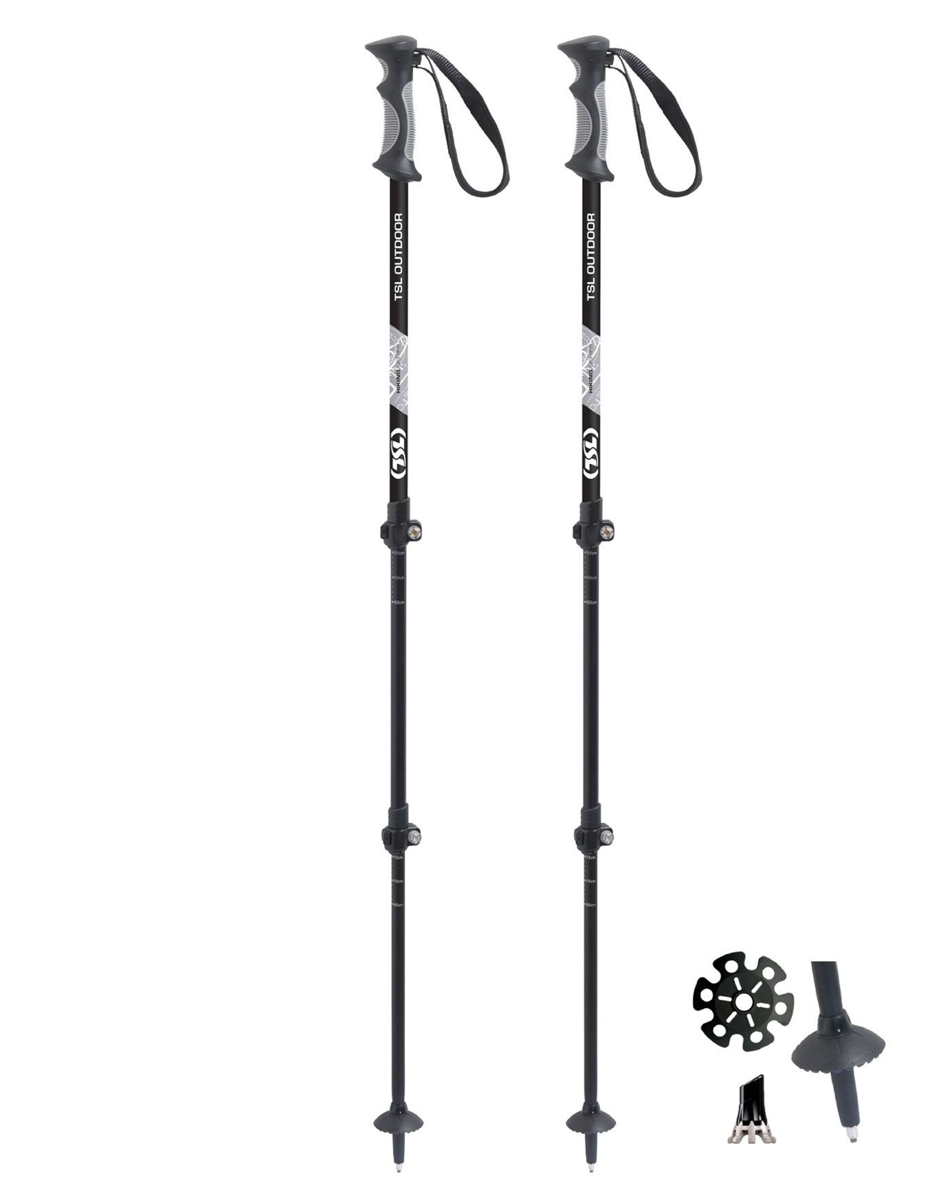 Les bâtons de randonnée TSL Outdoor Hiking Alu 3, en aluminium 3 brins réglables de 63 à 135 cm, offrent robustesse et dragonne ajustable pour un confort optimal en randonnée.