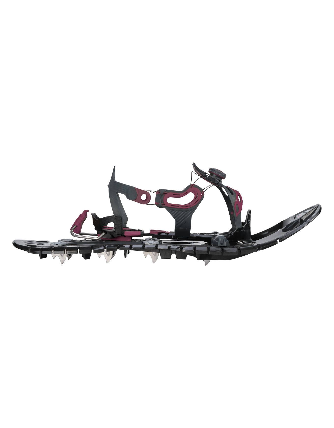 La démarche en canard est évitée grâce au châssis profilé en taille de guêpe, ce qui améliore l’efficacité de la propulsion. Une tension homogène et un maintien optimal sont assurés par le système de serrage BOA®, qui offre également la possibilité d’enfiler ou de retirer la raquette plus rapidement qu’avec une fixation classique.