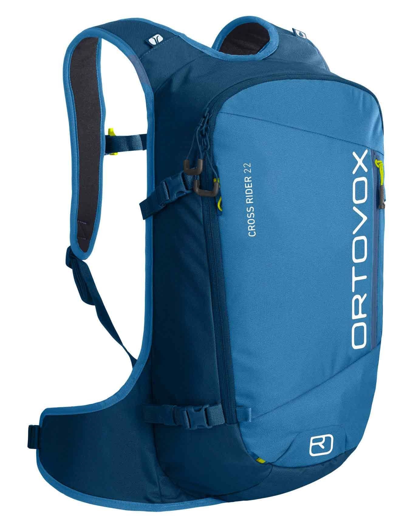 Sac à dos de ski Ortovox Cross Rider 22 Petrol Blue, ultra-léger et compact, pensé pour le ski de randonnée et le freerade : compartiment sécurité avalanche, fixations ski/snow/raquettes, porte-piolet/bâtons et dorsal préformé pour un maintien stable en backcountry.