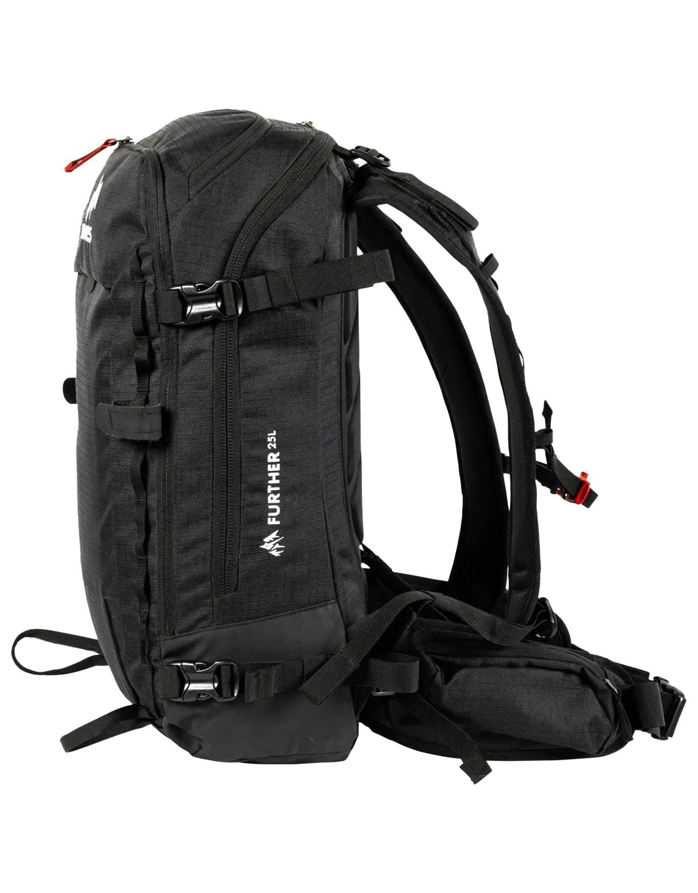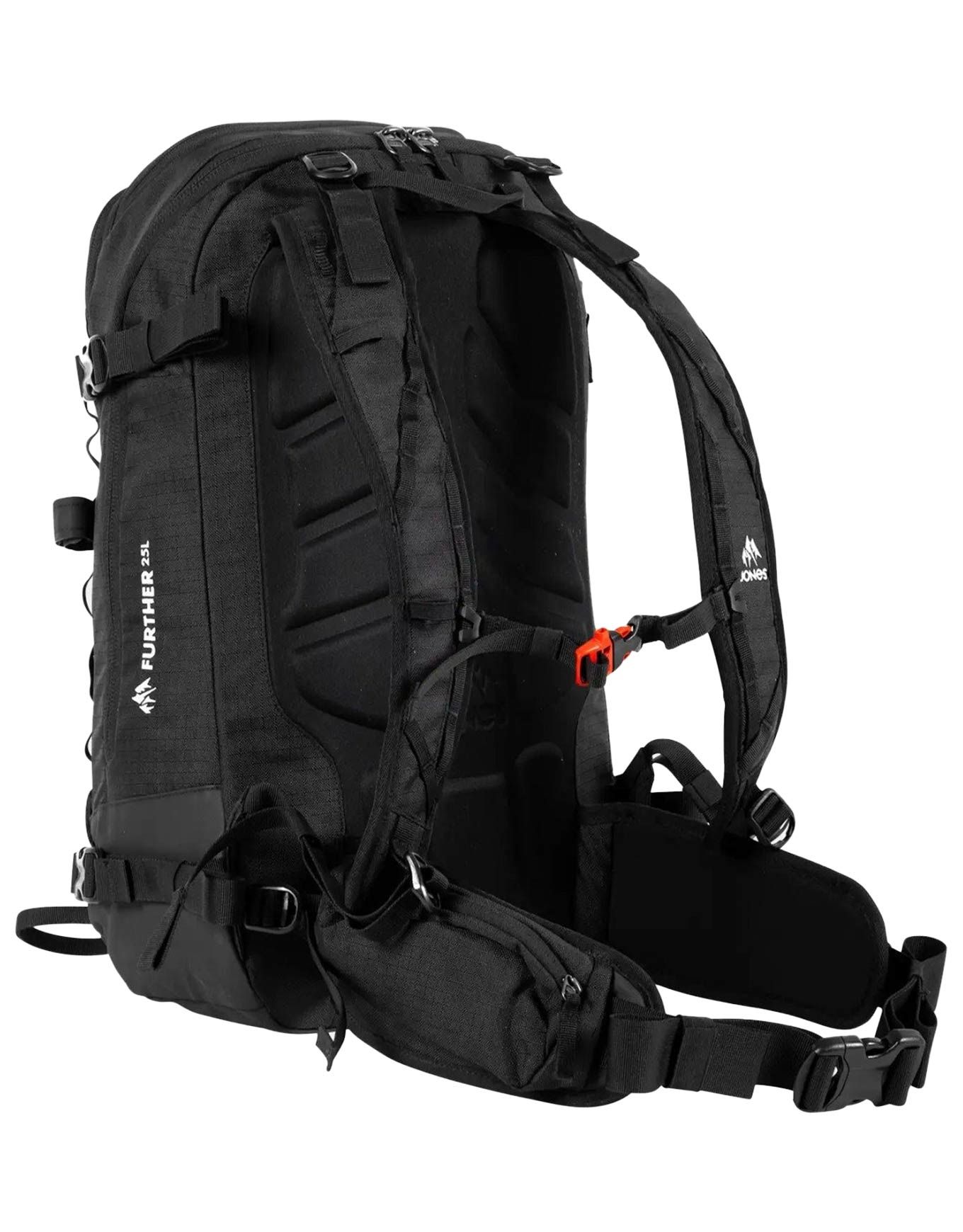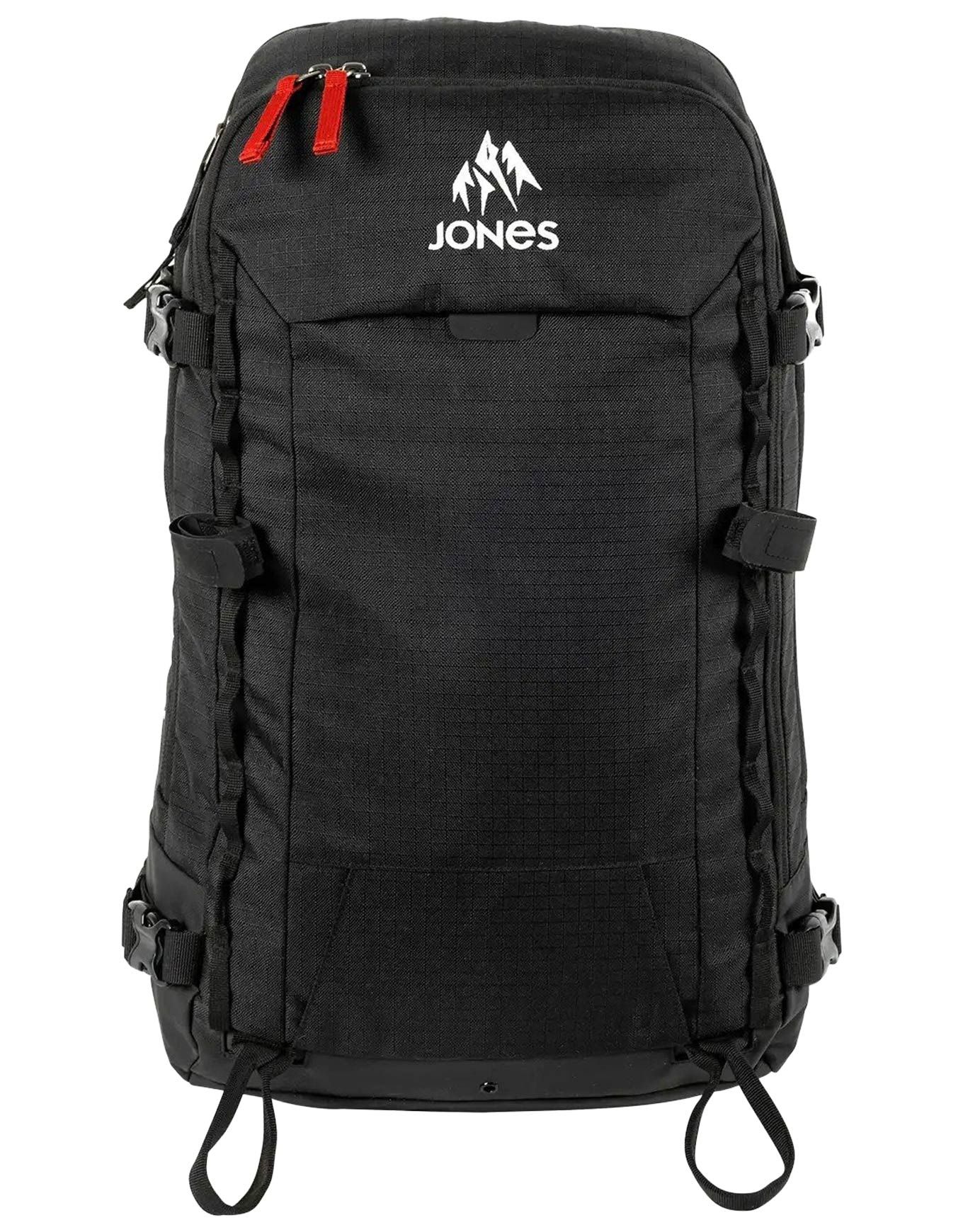 Sac à dos Jones Dscnt 25L Stealth Black conçu pour la randonnée en splitboard, ski et snowboard. Sa structure aluminium stabilise le chargement, les sangles latérales portent les skis et les poches sécurité, casque et piolet organisent l’équipement.
