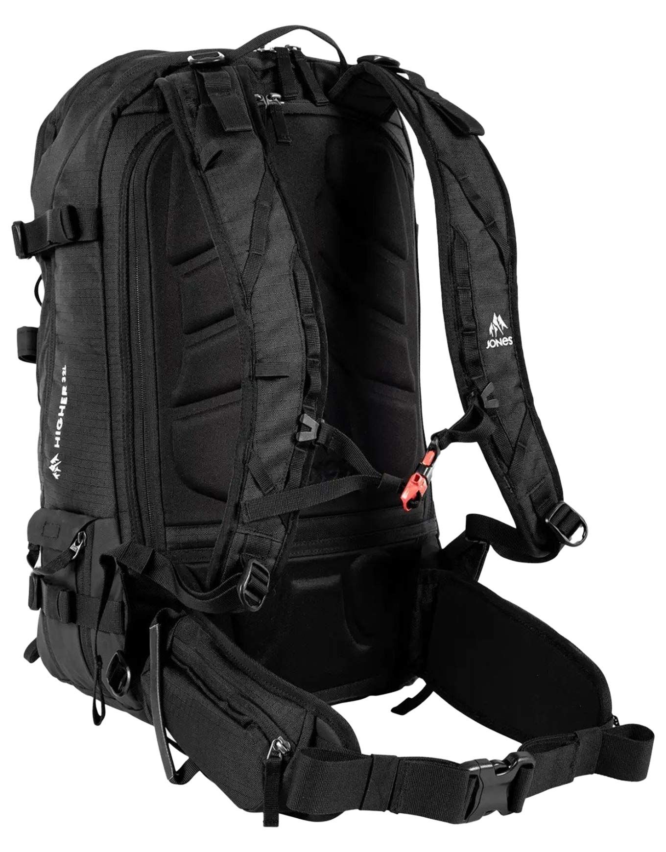 Sac à dos Jones Higher 32L Stealth Black conçu pour le splitboard et le ski de randonnée, offrant 32 L d’espace répartis en poche principale accessible par le dos, compartiment DVA, poche lunettes en polaire, porte-skis latéraux, porte-piolet et compatibilité hydratation.