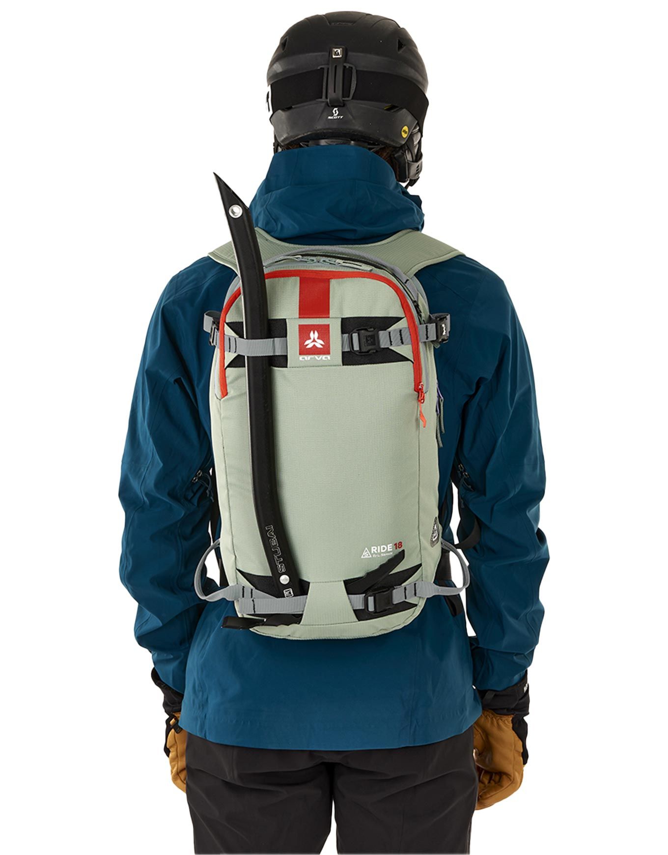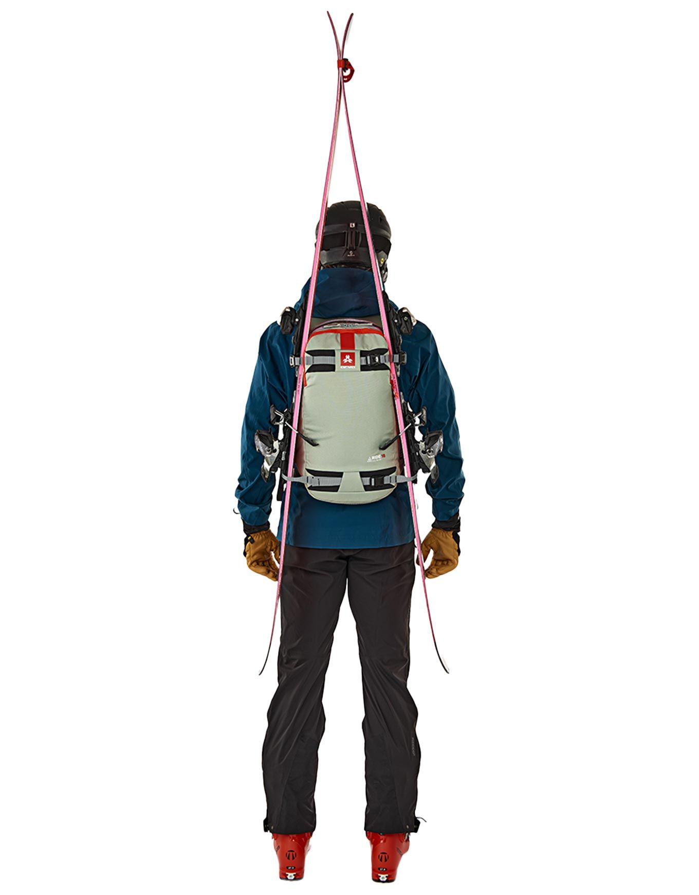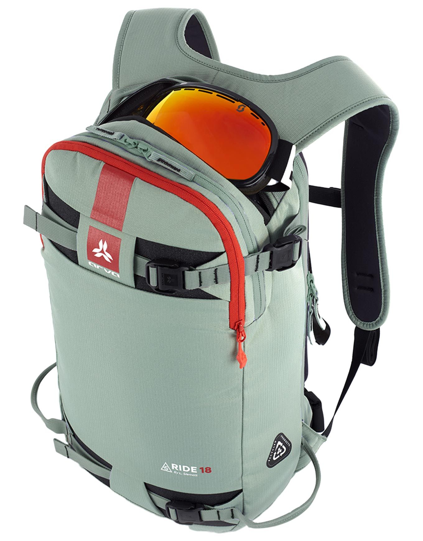 Sac à dos Arva Ride 18 Mousse, 18 L conçu avec Léo Slemett pour le freeride : compartiment dorsal, porte-skis/snowboard, porte-piolets et poche sécurité.