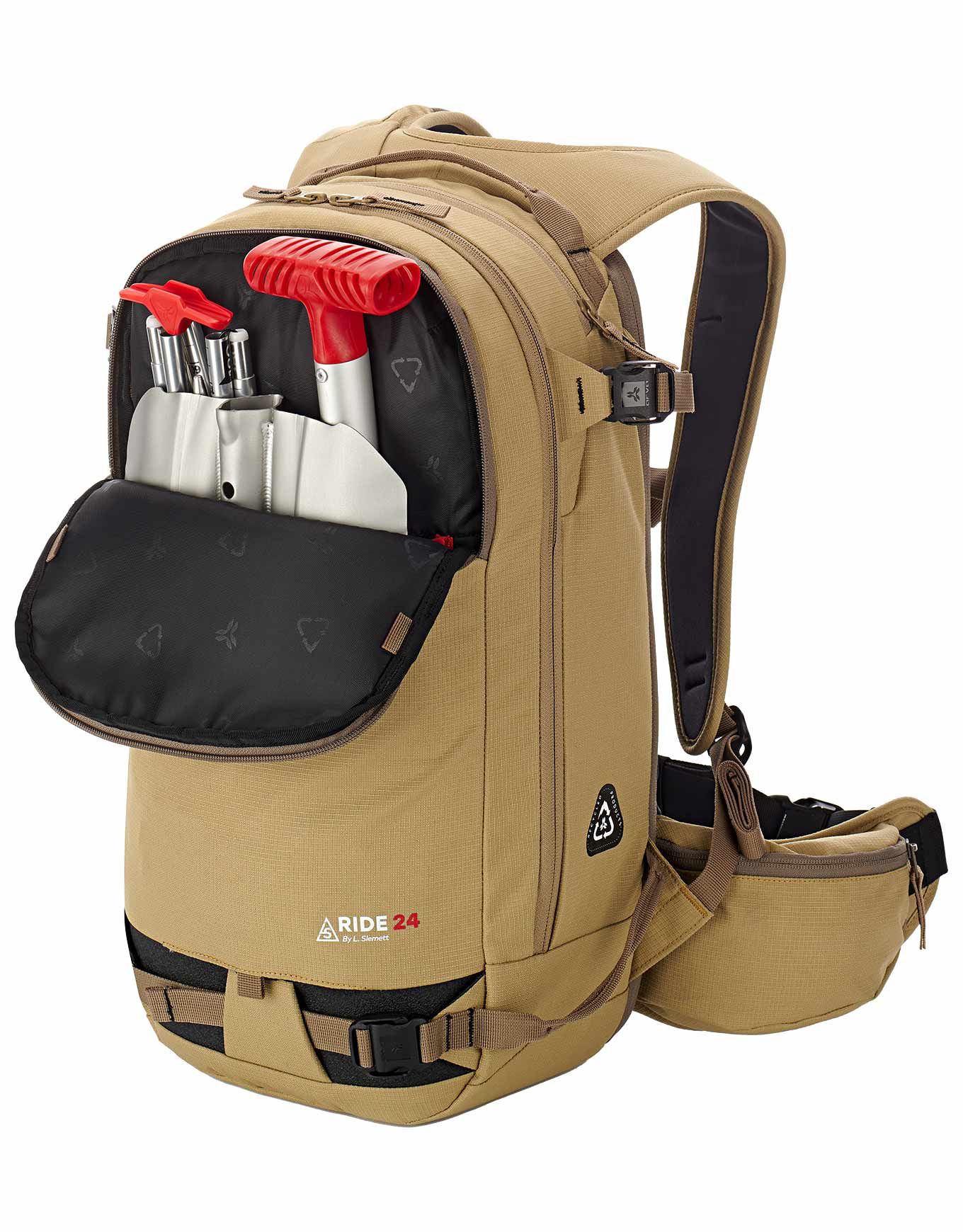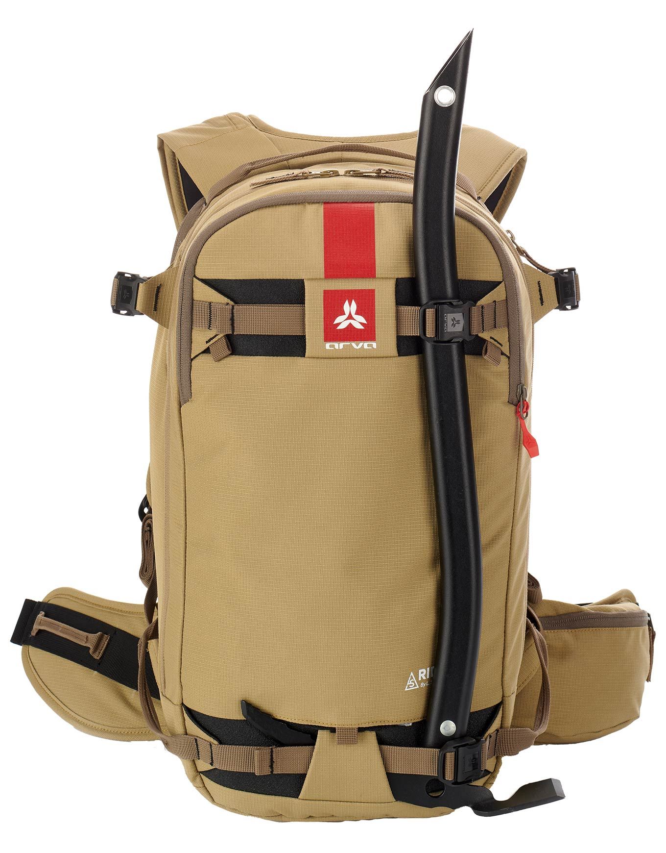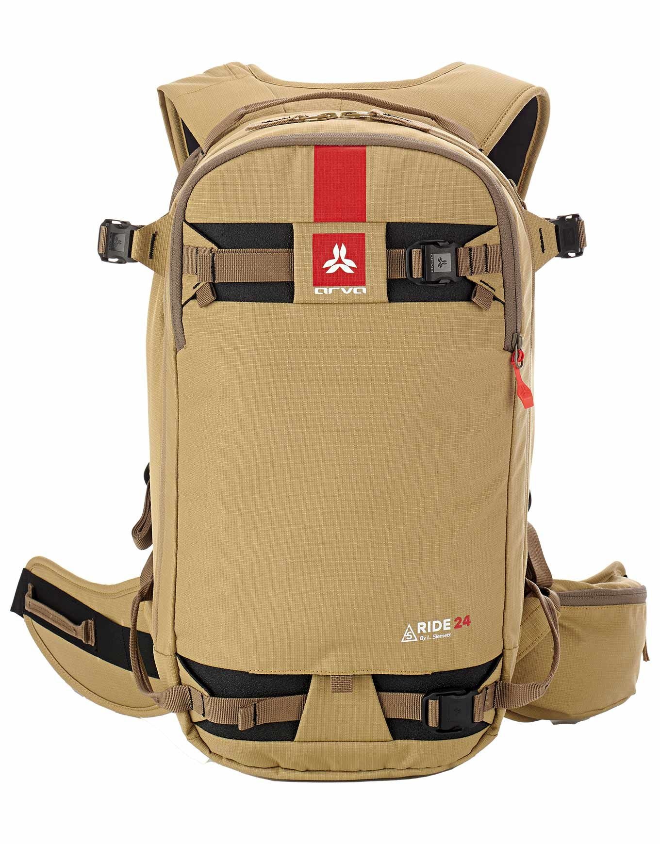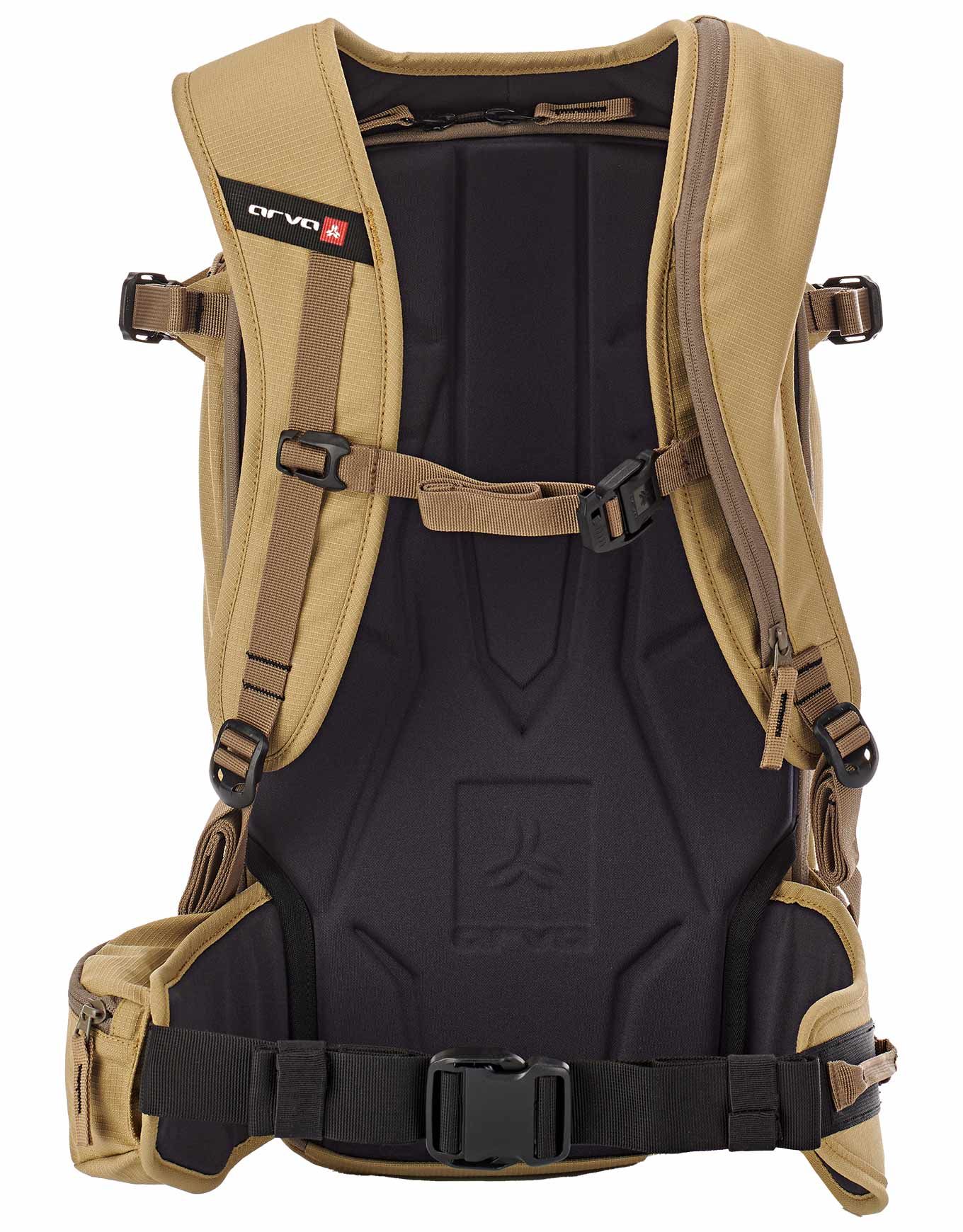Sac à dos Arva Ride 24 Brown 24 l, conçu avec Léo Slemett pour le freeride, compact proche du corps, bretelles et ceinture ergonomiques, accès zip frontal et dorsal, poche sécurité, porte-skis/snowboard, piolet, casque.