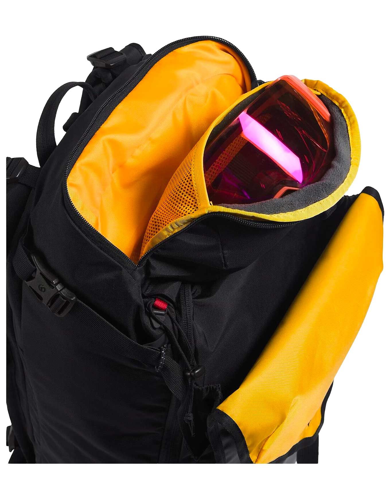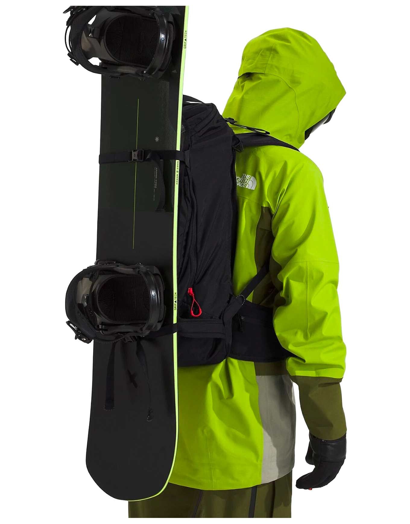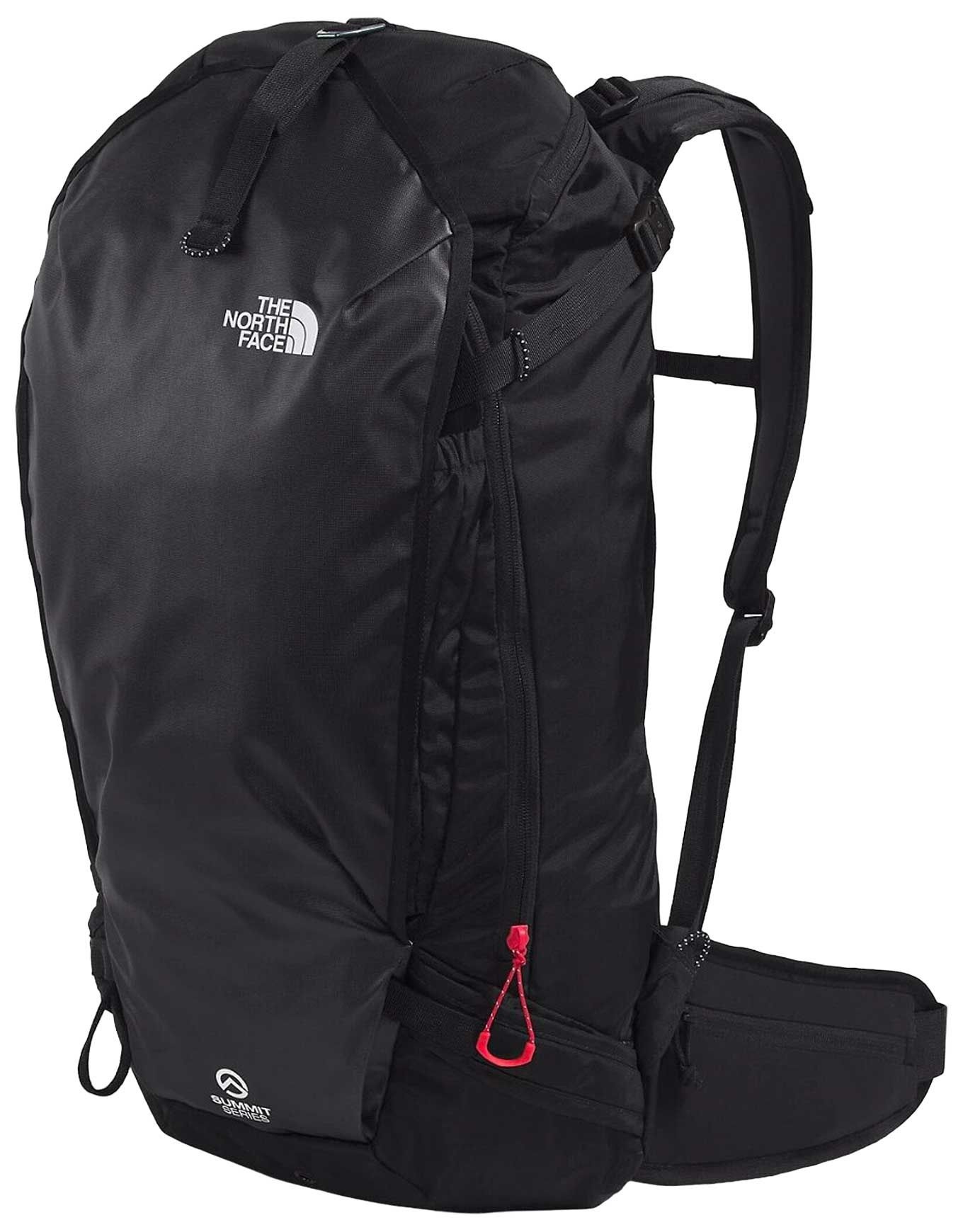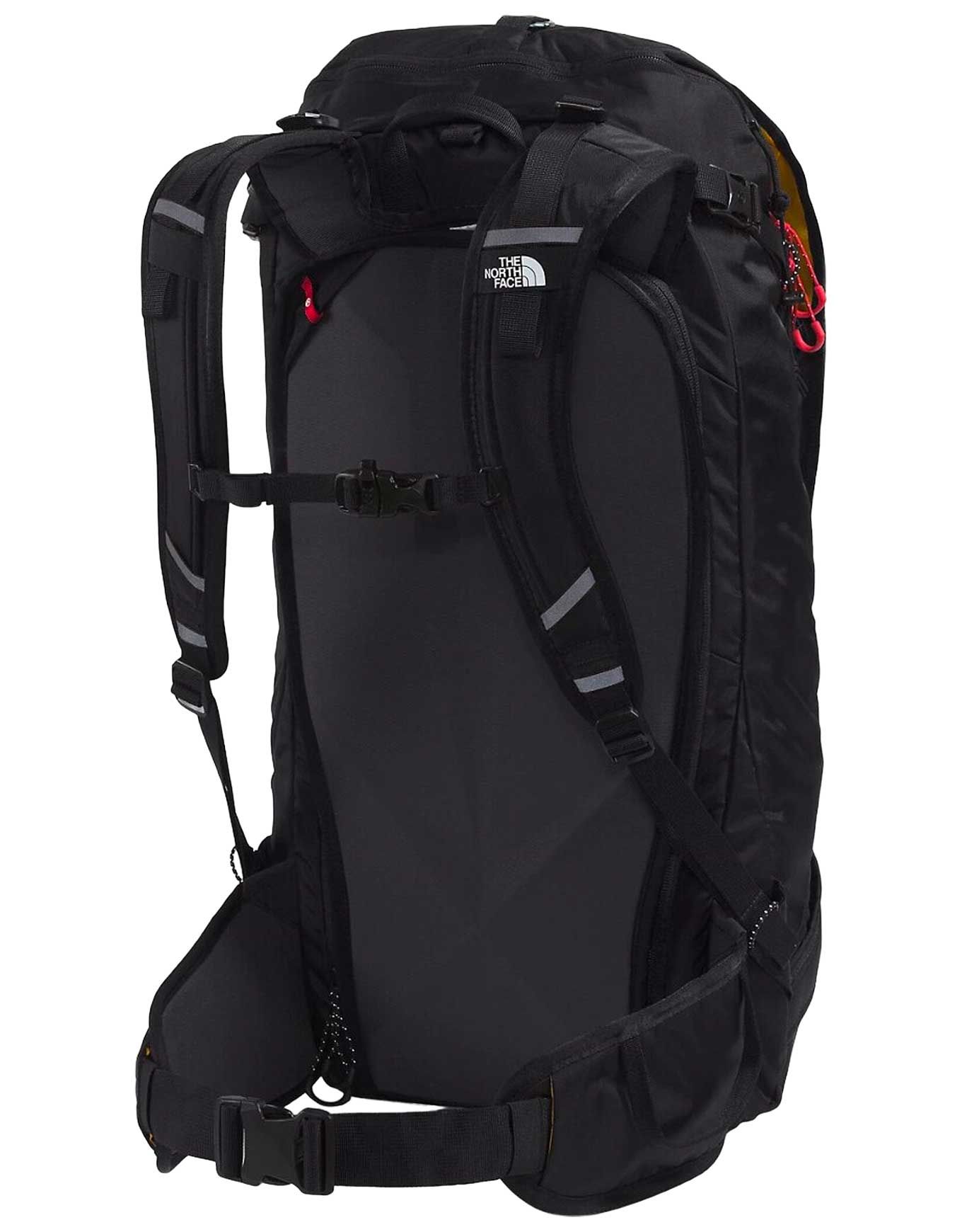 Sac à dos de ski et snowboard The North Face Snomad 34 Black/Red, 34 L en matières recyclées, accès dorsal, porte-skis/snowboard, compartiment pelle/sonde, porte-casque et poche hydratation pour sorties techniques.
