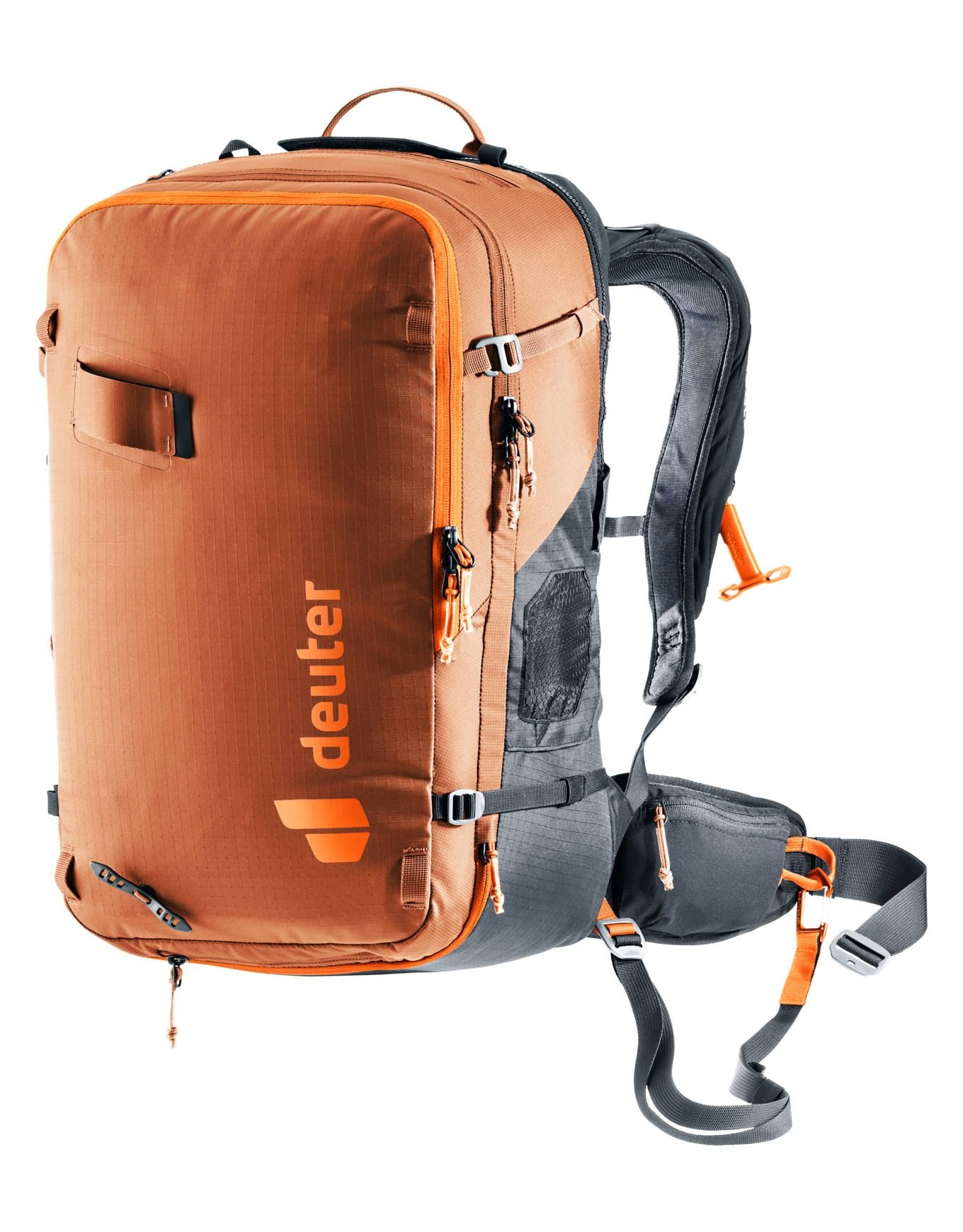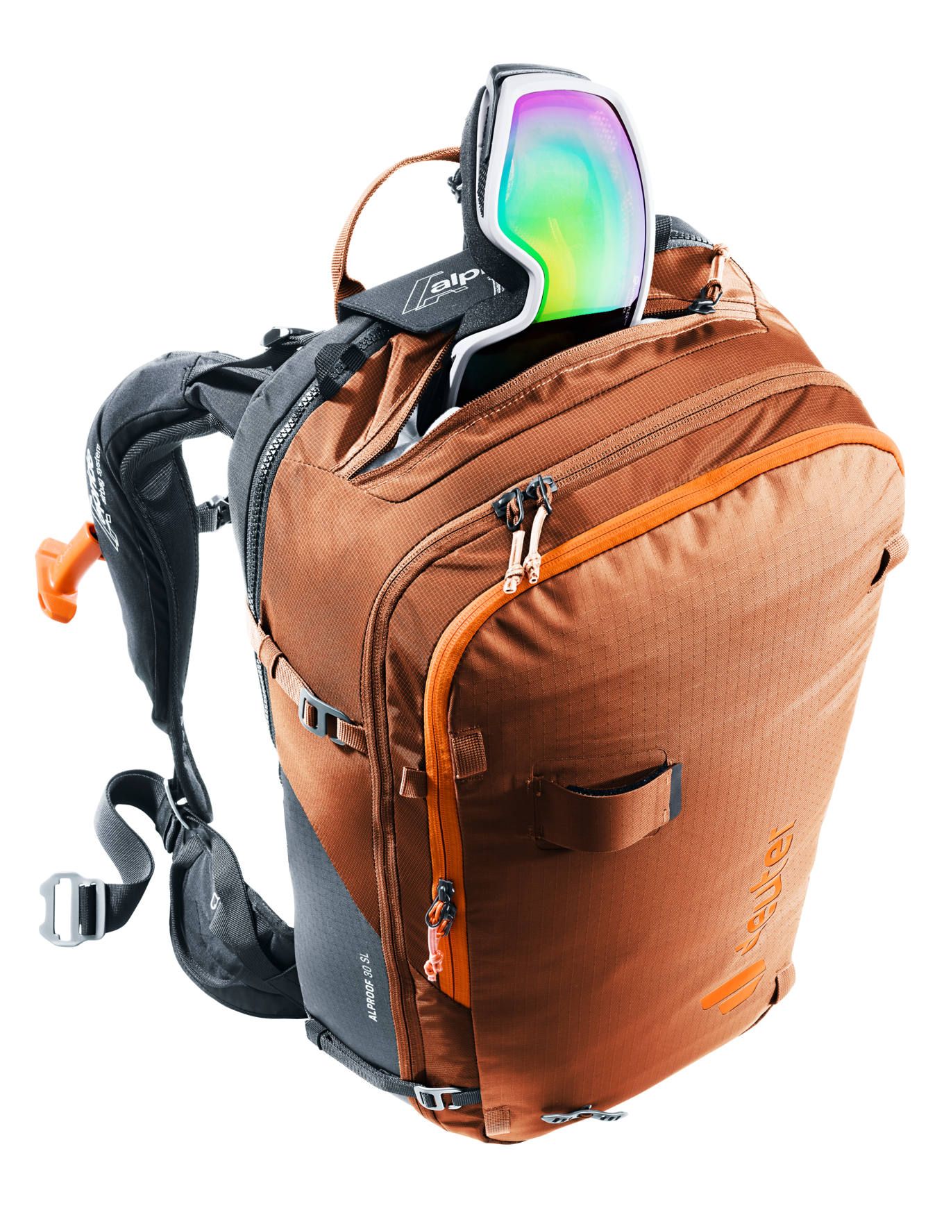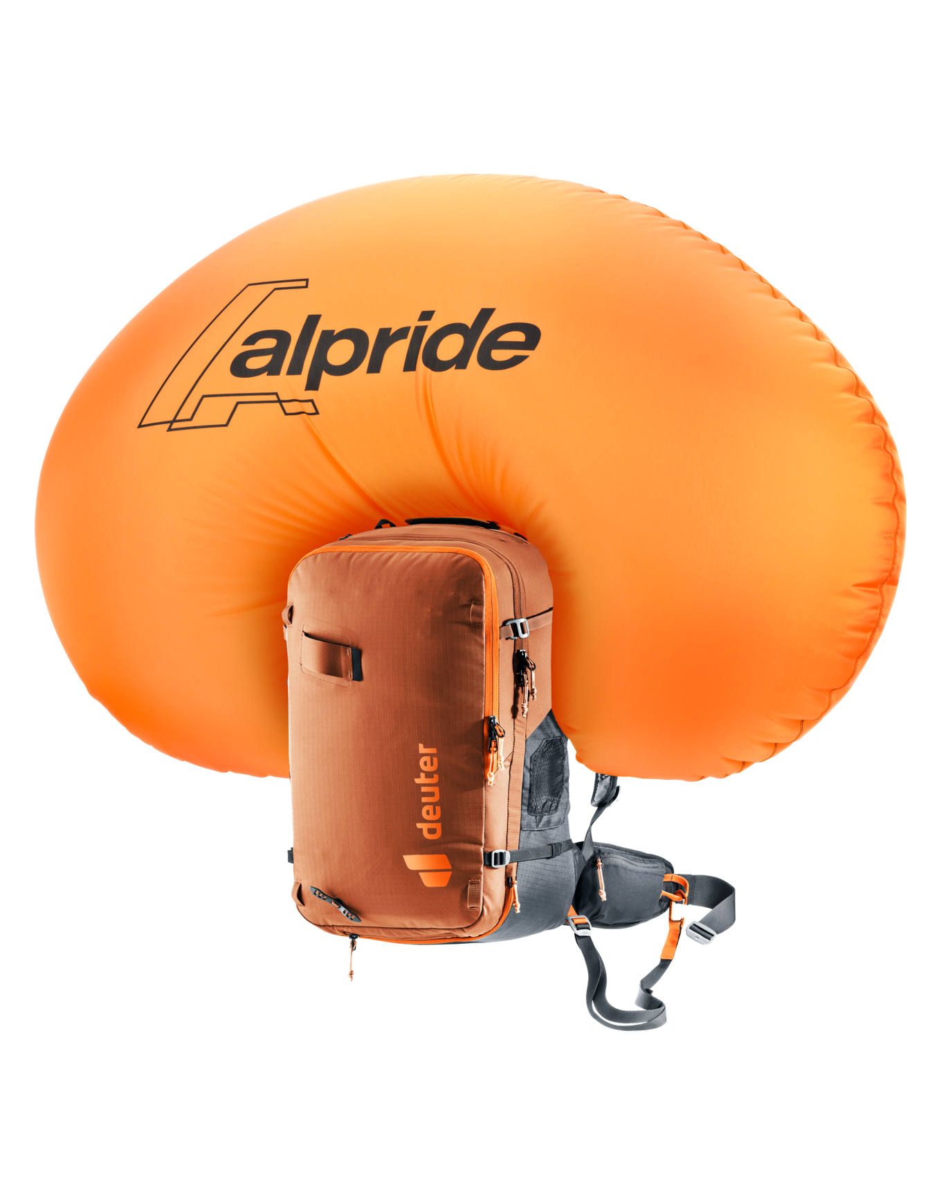 Sac à dos airbag Deuter Alproof 32 Chestnut Black pour homme, équipé du système Alpride E2 superléger gonflant 162 L en 3 s. Dos Alpine aéré, compartiment sécurité, fixations ski/snowboard, boucle jambe.