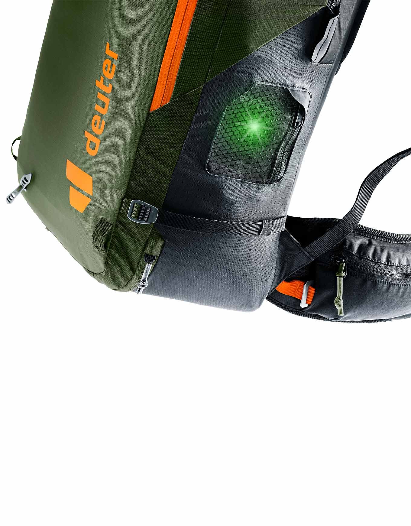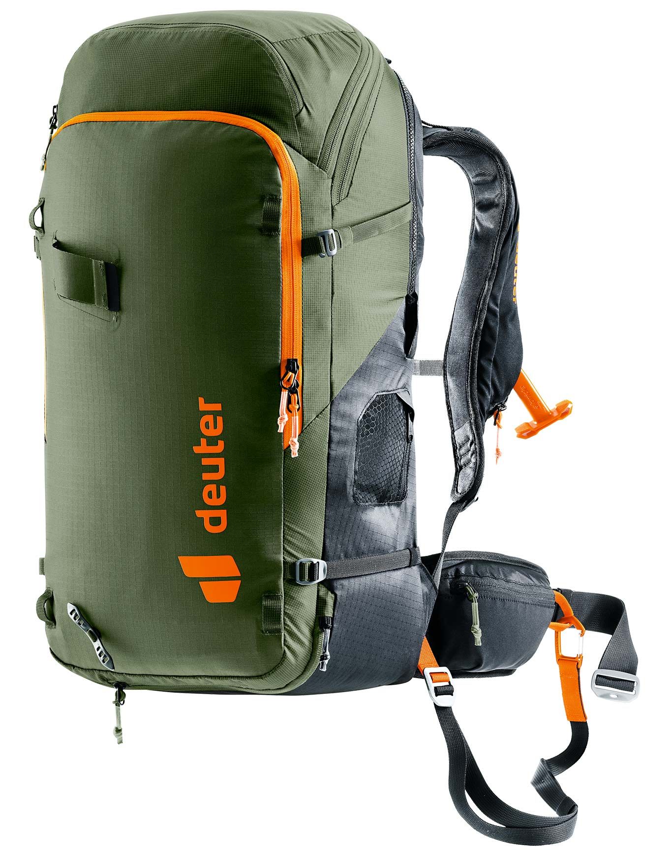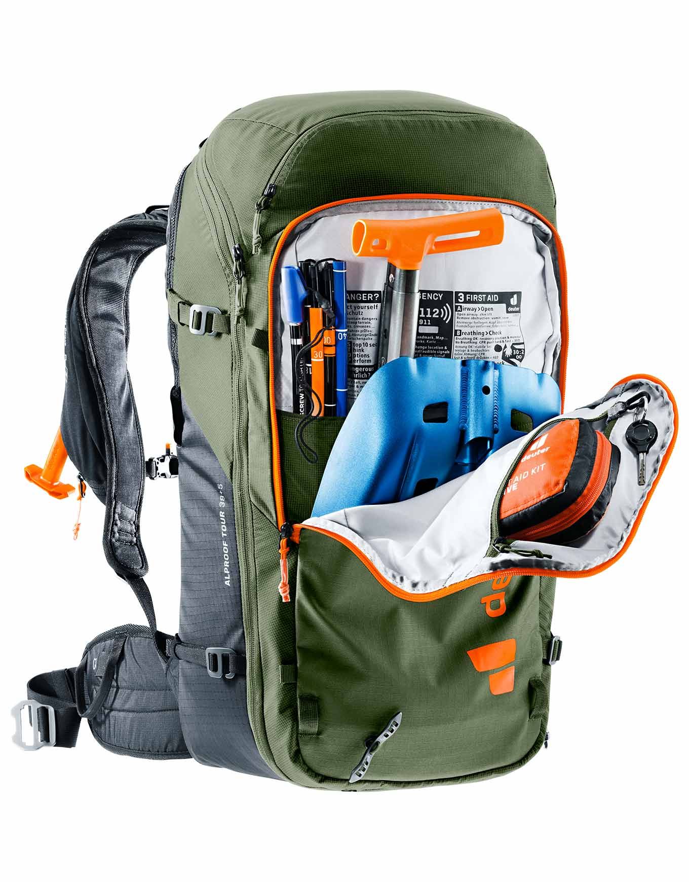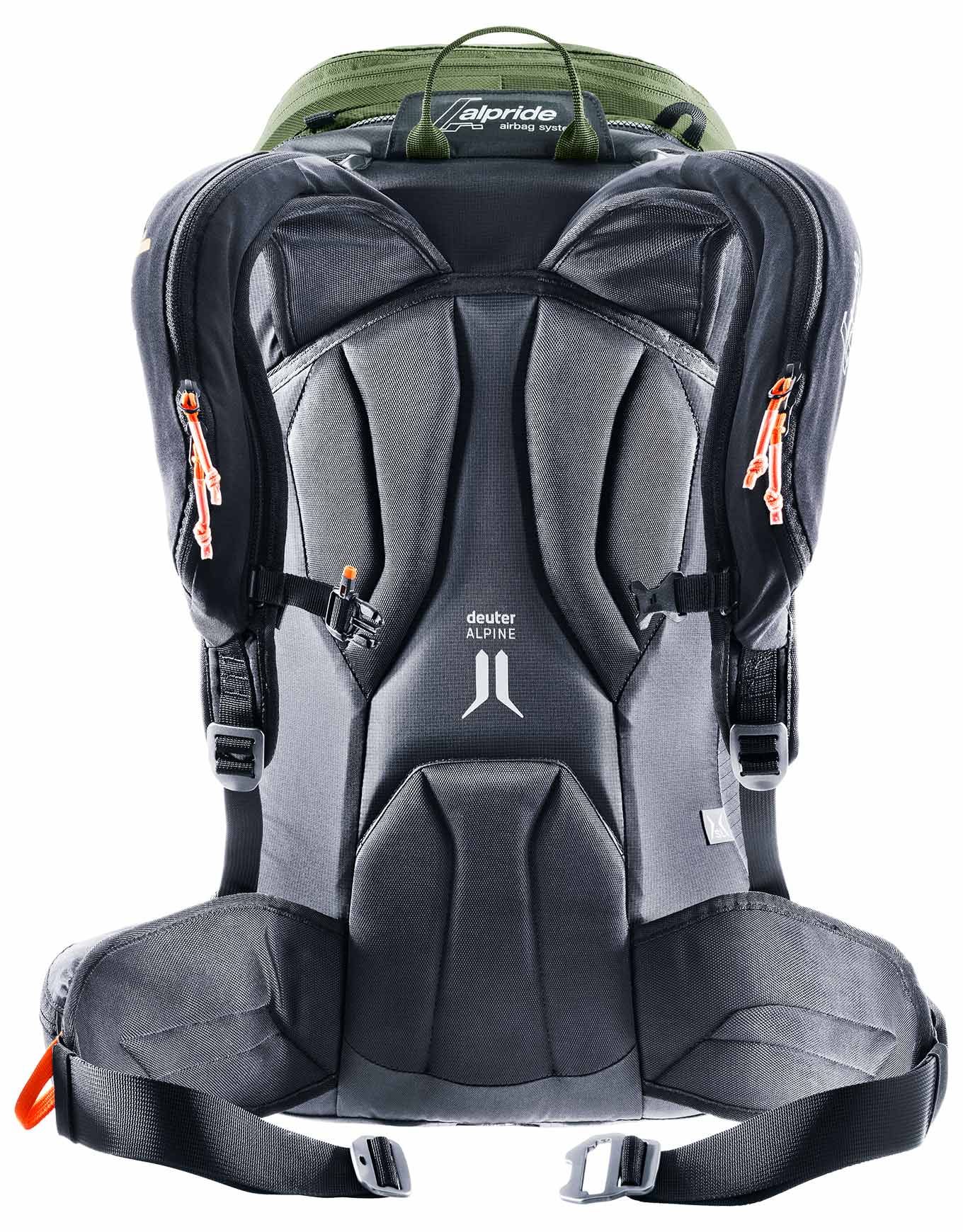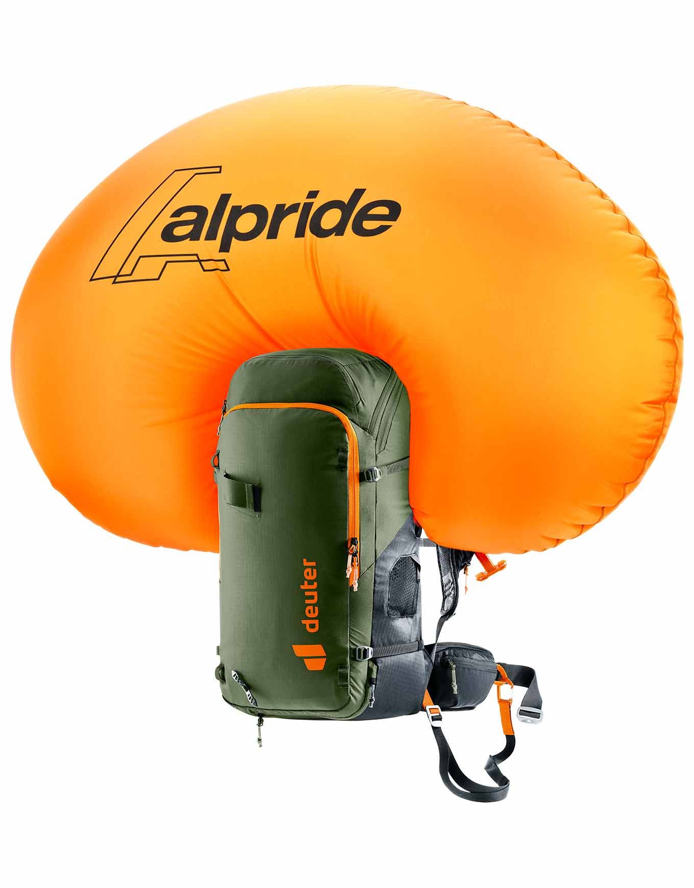 Sac à dos airbag Deuter Alproof Tour 38+5 Khaki Black, système Alpride E2 ultra-rapide 162 L en 3 s, volume extensible 38+5 L, dos Alpine aéré, compartiment sécurité, fixations ski/snow.