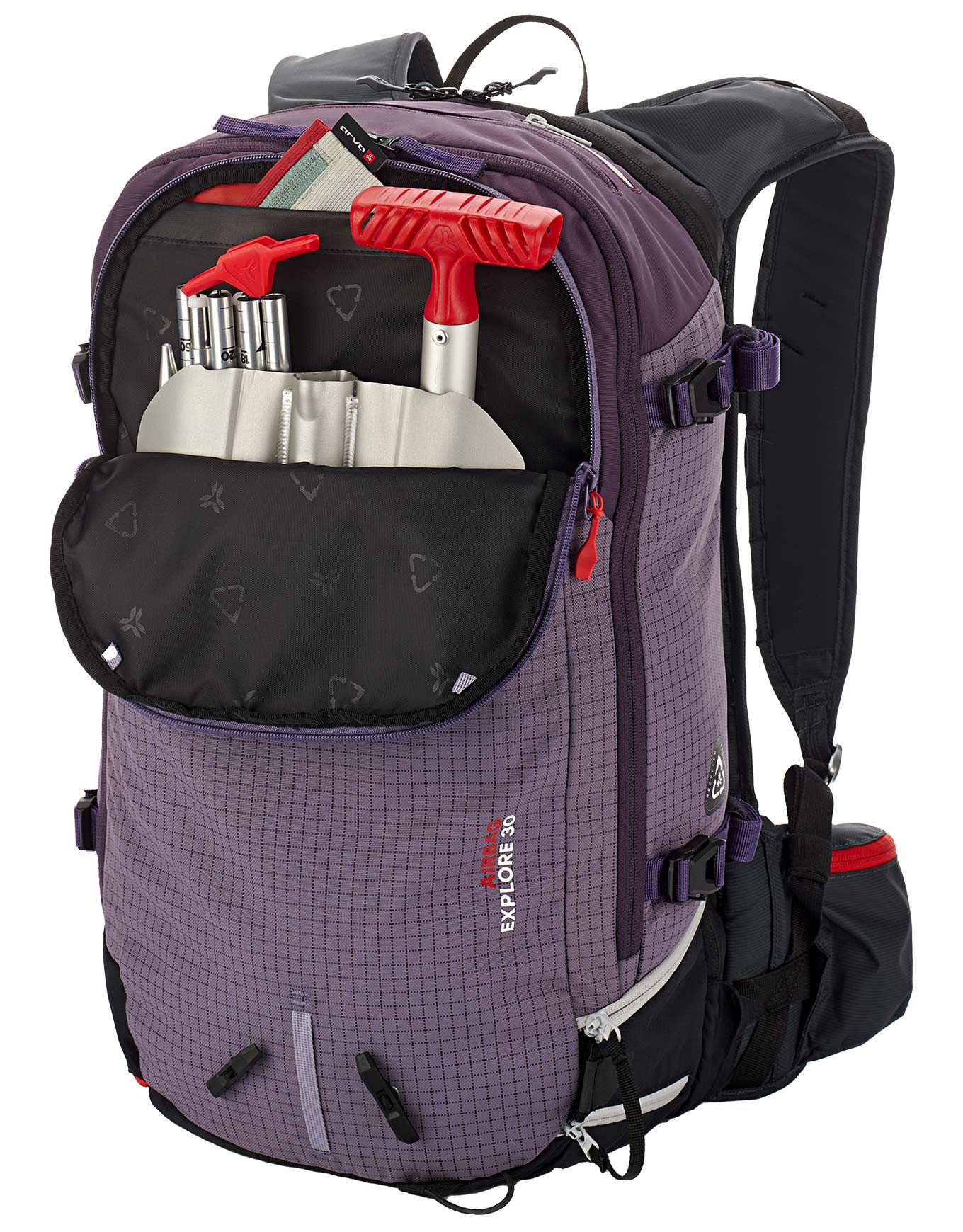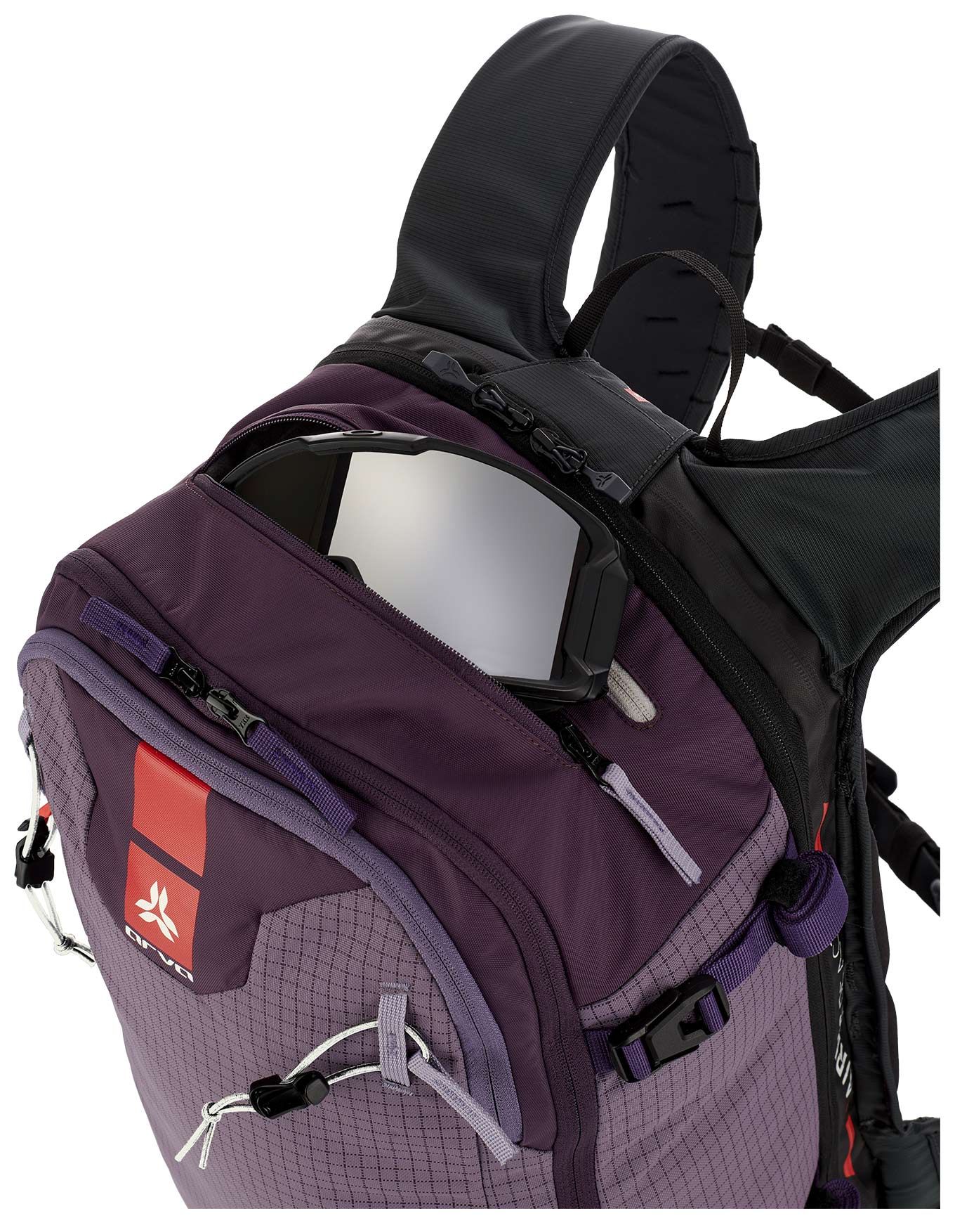 L’équipement principal trouve sa place dans le compartiment central, alors qu’une poche avant dédiée à la « sécurité » donne accès en quelques secondes à la pelle et à la sonde. Les lunettes sont protégées dans une petite poche située sur le dessus, tandis que deux poches zippées intégrées à la ceinture ventrale rembourrée conservent les petits accessoires à proximité. Les porte-matériels incorporés permettent de fixer facilement skis, snowboard, piolets et casque.