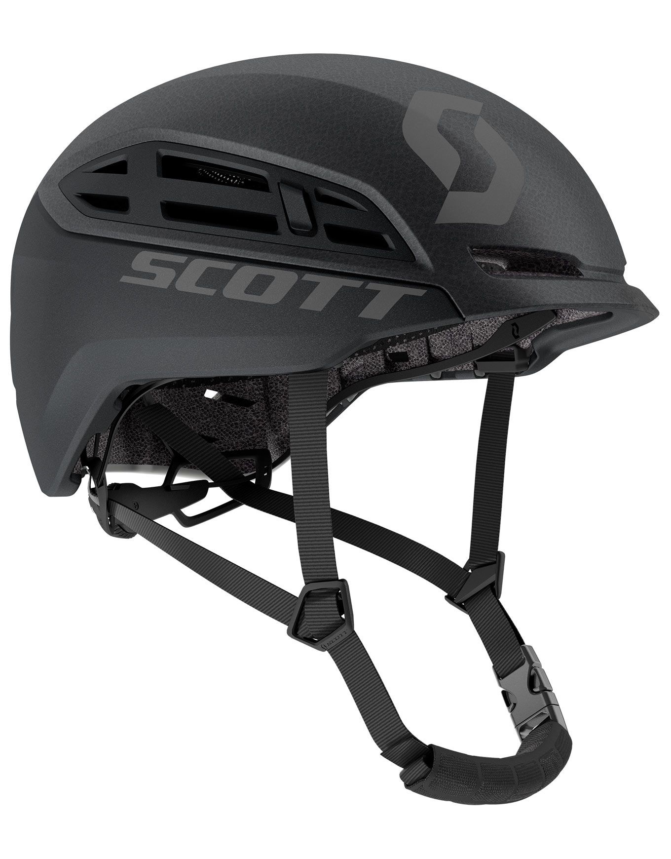 Casque Scott Couloir Tour Raw Black 350 g : coque In-Mold, doublure EPS, rembourrage rando compatible bonnet, aération passive, attache lampe frontale, 55 % matière recyclée.