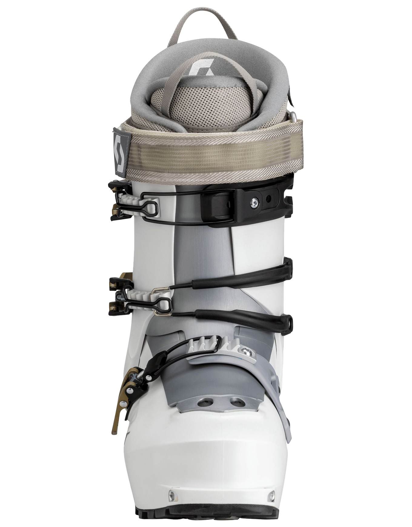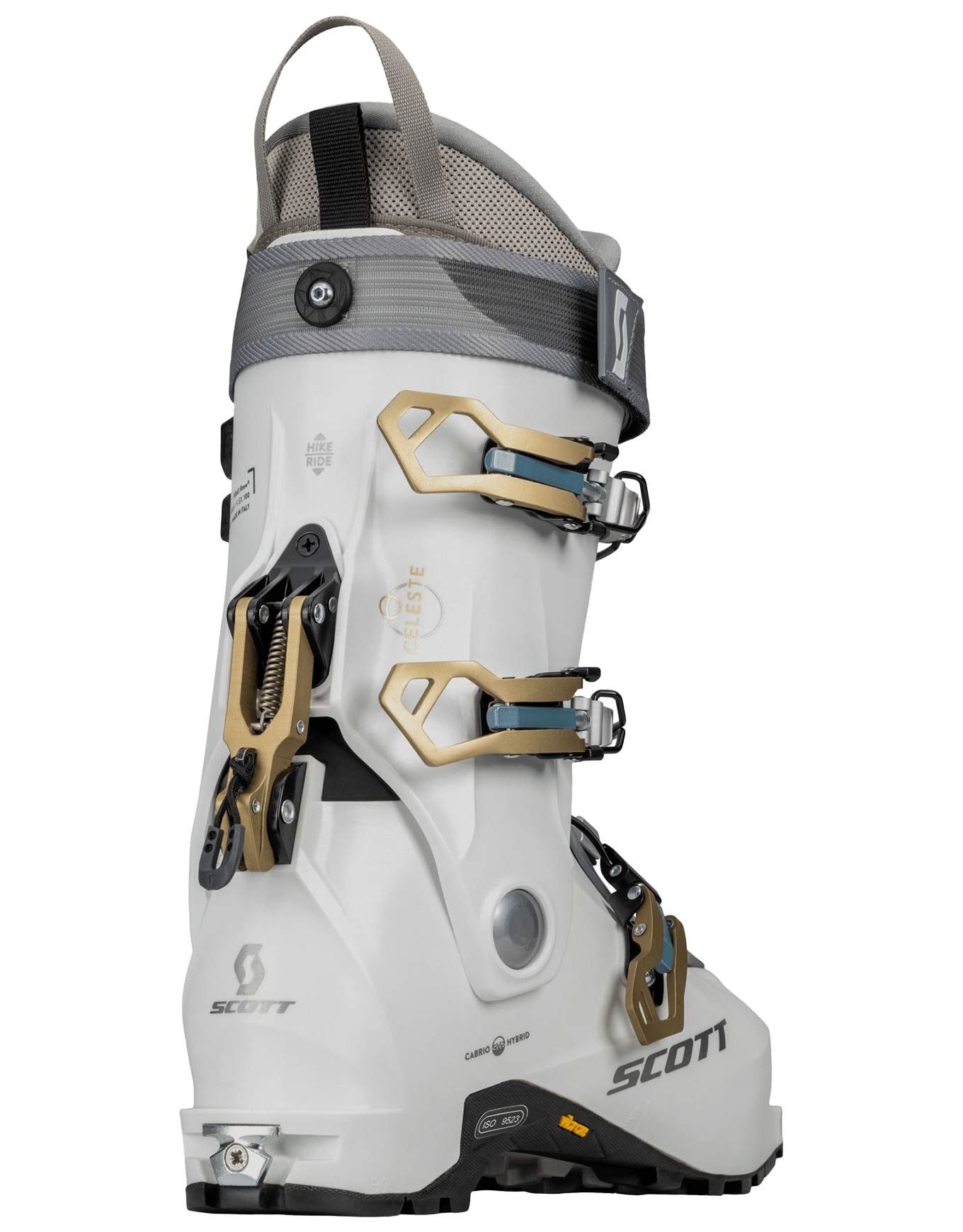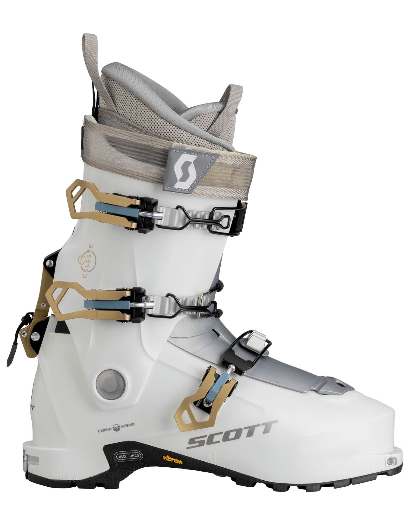 Chaussure de ski de randonnée femme Scott W’S Celeste Ice White, légère 2450 g, flex 100, débattement 60° et construction Cabrio Hybrid pour confort montée et précision descente.