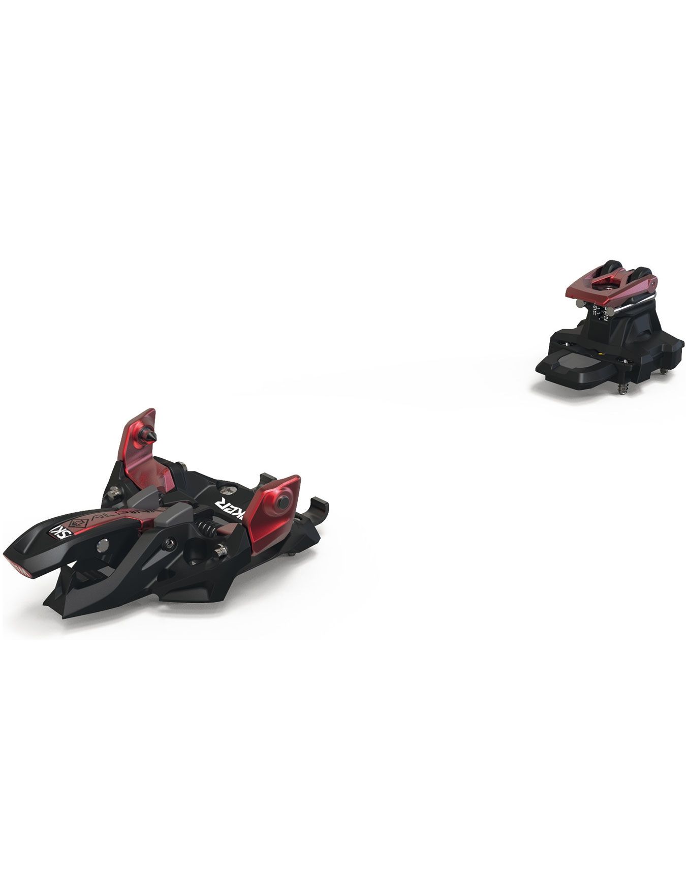Fixation de ski de randonnée Marker Alpinist, 490 g la paire, en aluminium, carbone et polyamide, avec step-in visuel, cales 0°/5°/9°, DIN 6-12 et anti-ice pads.