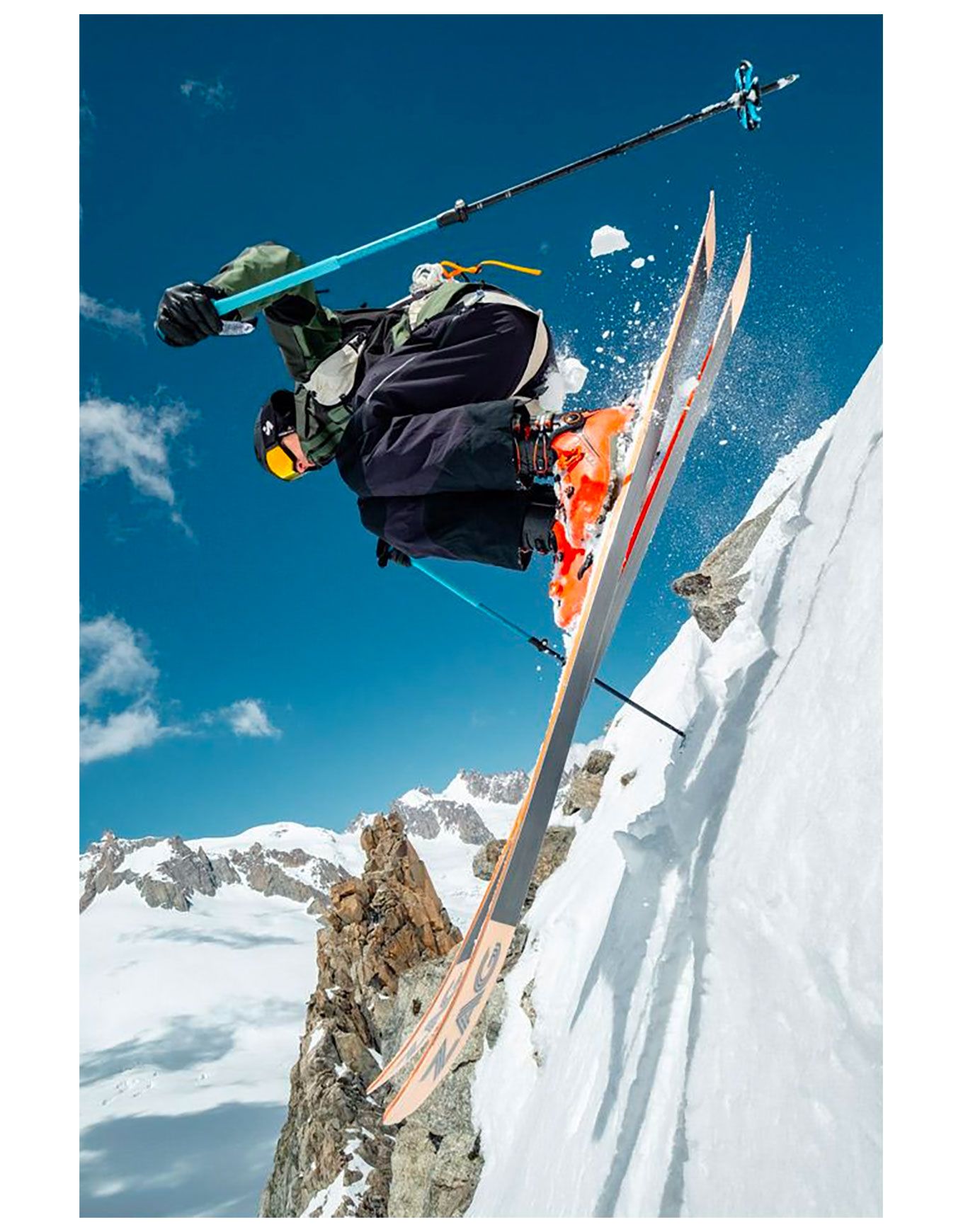 Grâce à son patin de 108 mm, la flottaison en poudreuse est aisée et les virages s’enchaînent rapidement, tandis qu’une maniabilité remarquable est conservée sur terrains variés. La réactivité et la longévité sont assurées par des renforts en carbone et fibres de verre, et l’absorption des vibrations est prise en charge par un insert en caoutchouc, éléments indispensables pour garantir stabilité et confiance à haute vitesse.