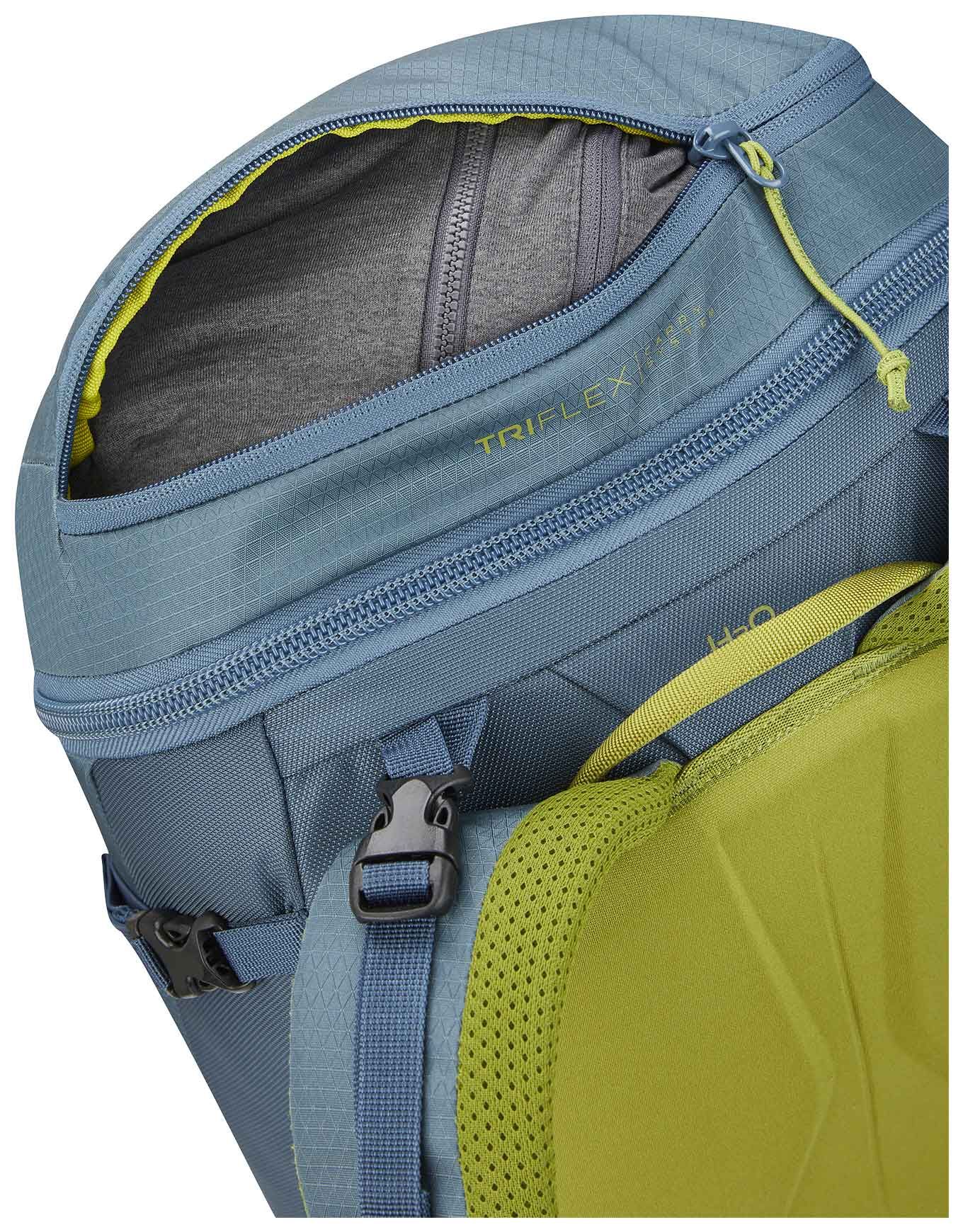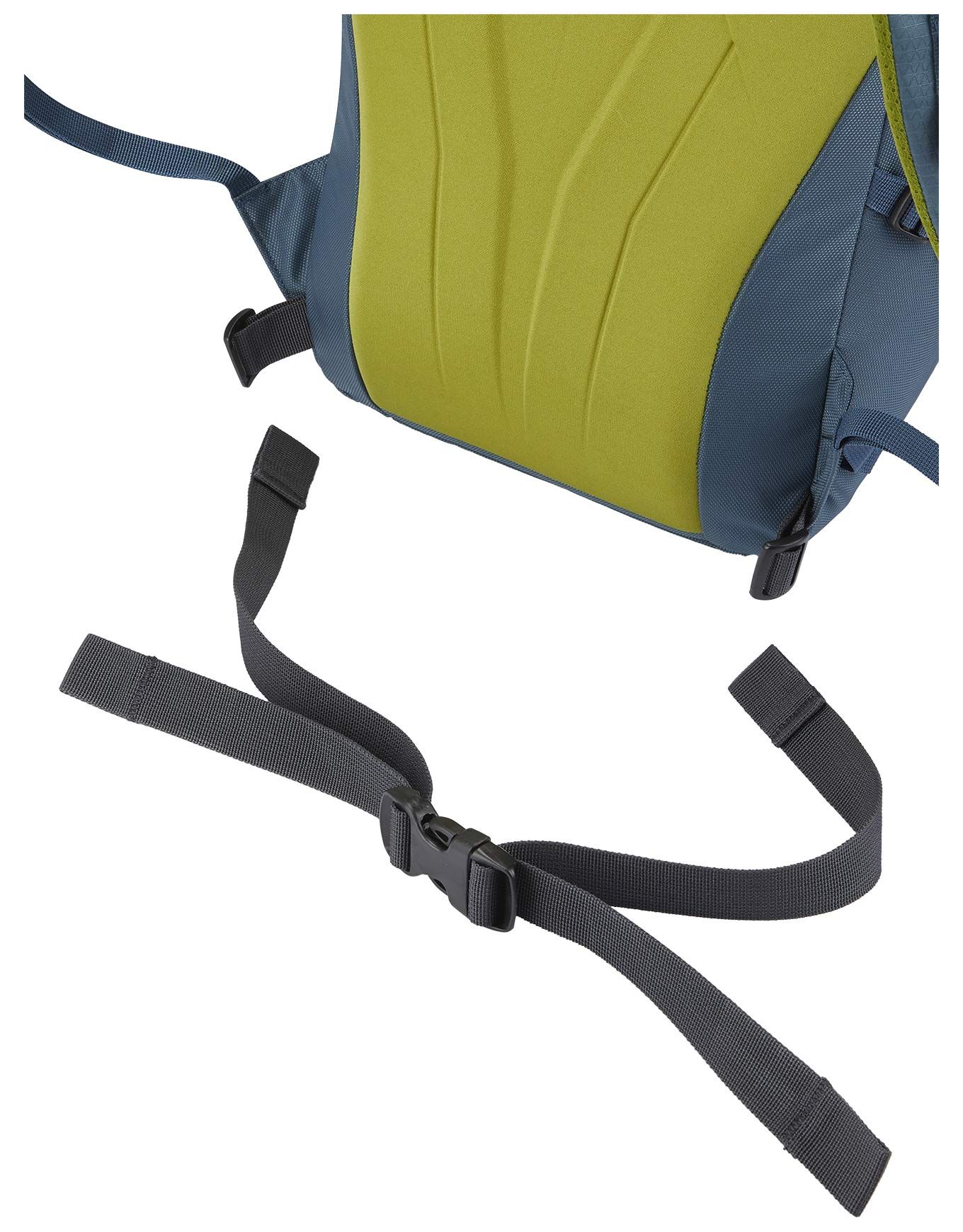 Un sifflet est intégré à la sangle de poitrine, alors que la sangle abdominale peut être retirée pour alléger le portage lors des sorties rapides. L’ajustement du volume et l’optimisation du transfert de charge sont rendus possibles par des sangles de compression latérales et situées sur le haut.