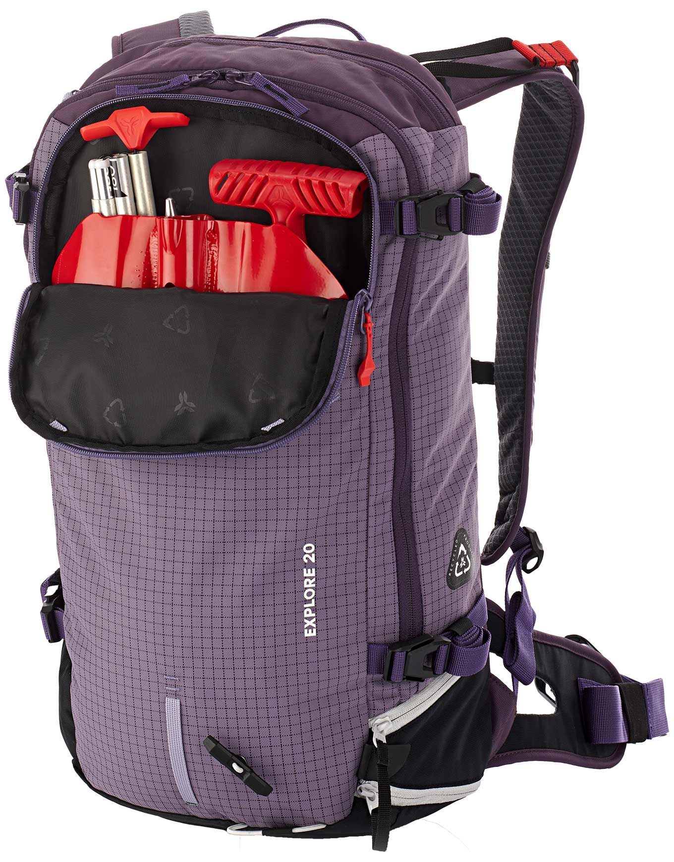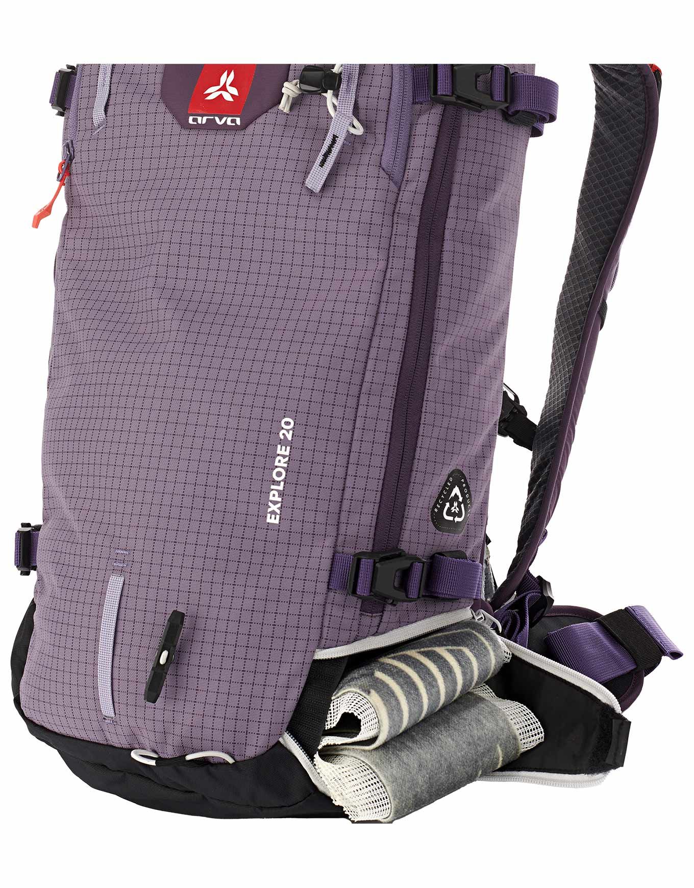 Du point de vue de l’ergonomie, l’Explore 20 propose plusieurs espaces de rangement : une poche frontale externe spécialement aménagée pour un accès rapide au matériel de sécurité (sonde, pelle) en situation d’urgence, une poche dédiée aux lunettes située en partie supérieure, ainsi qu’une poche zippée de grande taille sur la ceinture abdominale. À la base du sac, un compartiment indépendant permet de stocker peaux de phoque, corde ou crampons.