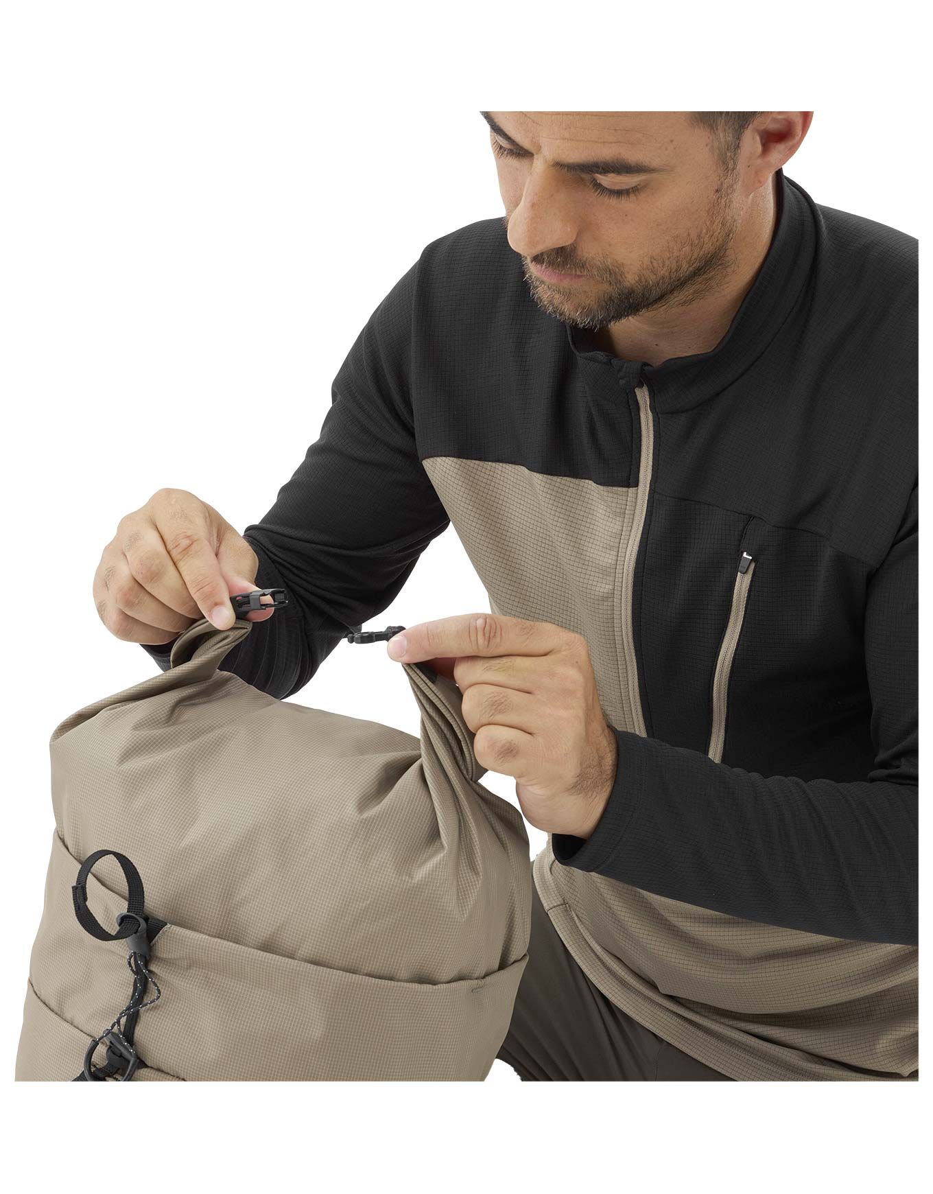 Du côté pratique, plusieurs espaces de rangement sont mis à disposition pour accueillir l’équipement nécessaire, dont le principal s’ouvre par un système d’enroulement à serrage rapide. On trouve notamment un vaste compartiment dédié au système d’hydratation, une poche frontale zippée, une poche mesh zippée intérieure, ainsi qu’une poche pour smartphone positionnée sur bretelle. S’y ajoutent différents porte-matériels permettant d’attacher bâtons, skis, piolets, corde, ou même une flasque. Le volume du Mixt peut être augmenté de 5 L en cas de besoin. En cas d’accident, l’atelier de la marque se charge des réparations.