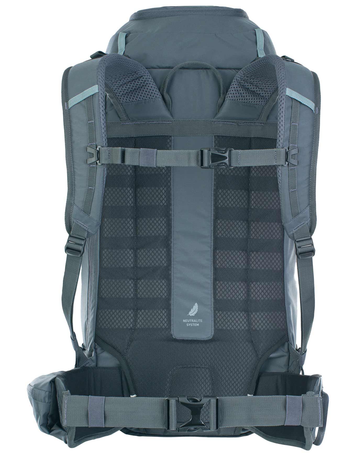 NEUTRALITE SYSTEM L’ajustement au dos et la distribution de la charge s’effectuent grâce à des stabilisateurs souples qui acheminent les forces du poids vers une ceinture spécifiquement profilée par des coussinets segmentés stratégiquement disposés. Cette configuration répartit la masse au centre de gravité via les hanches de manière neutre. Les bretelles larges, épaisses et profilées avec découpe cervicale maintiennent le sac en position optimale et évitent tout glissement, même en effort intense.