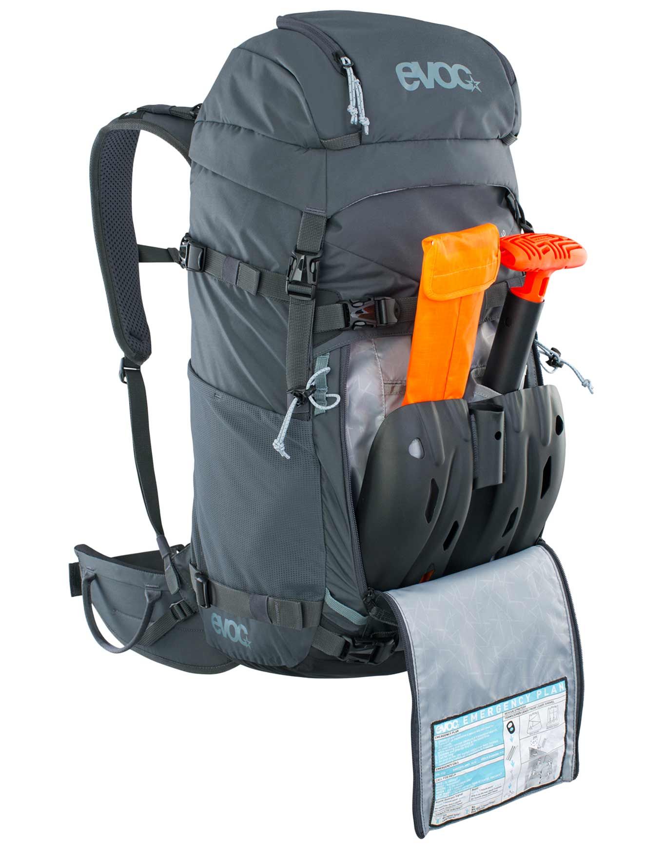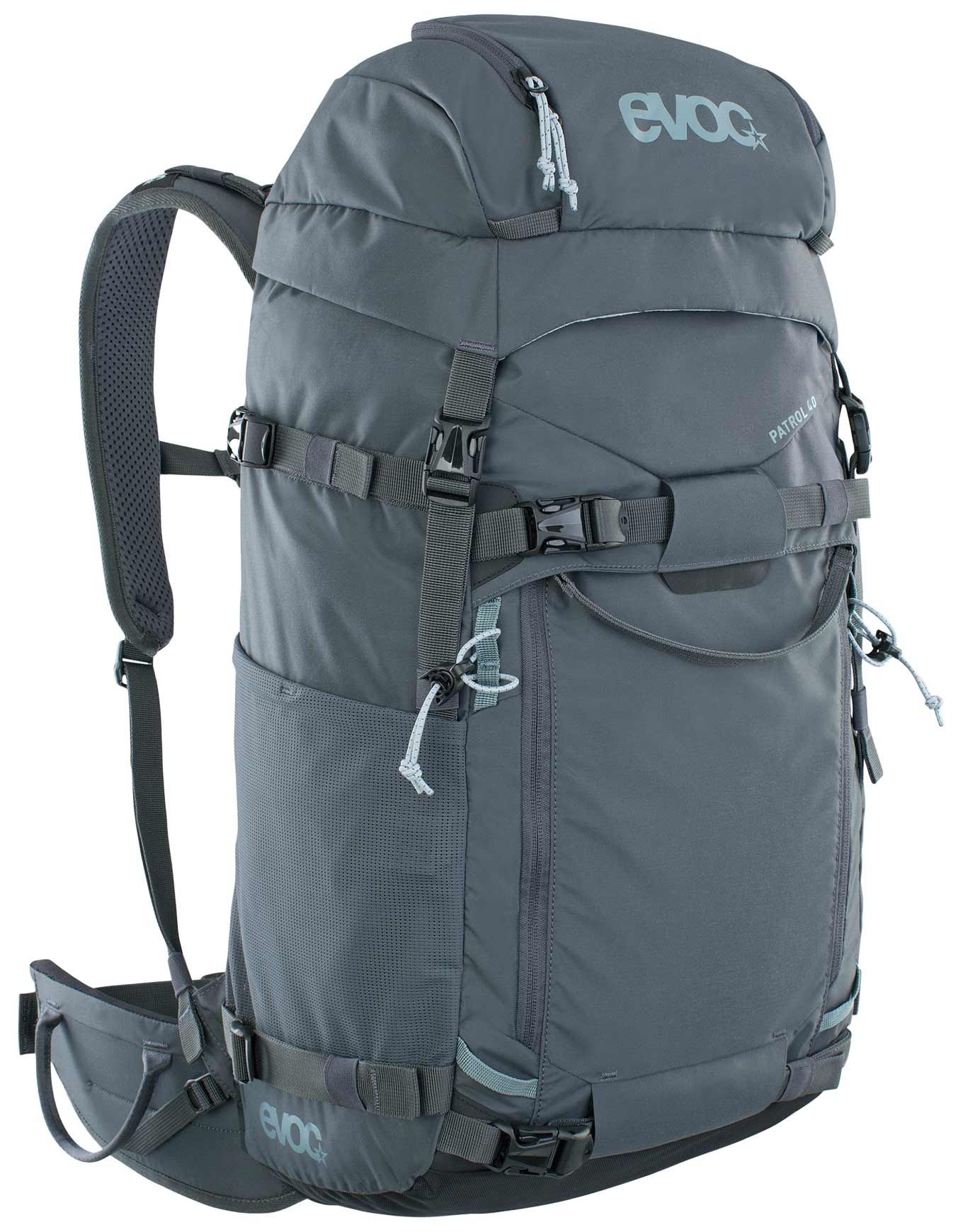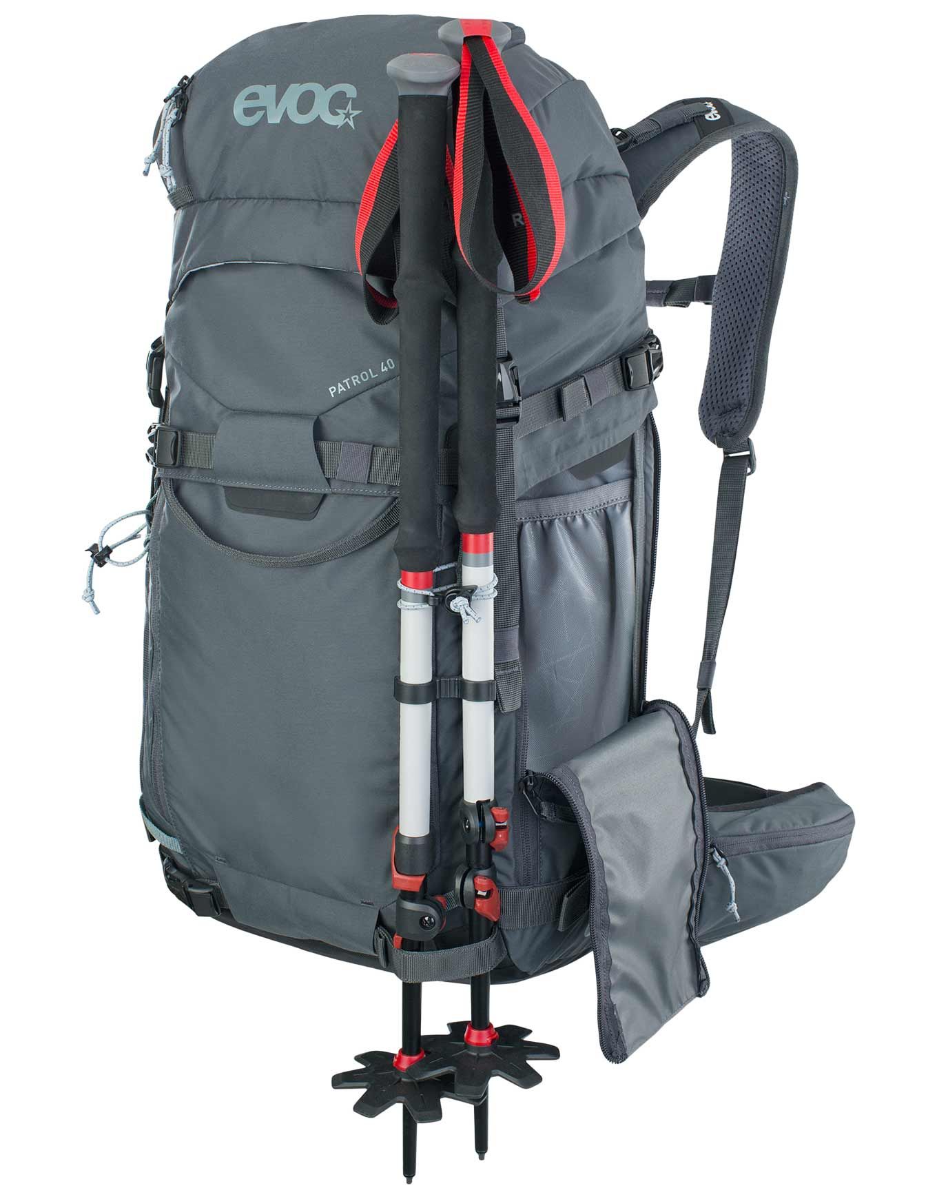 Sac à dos technique freeride Evoc Patrol 40 Carbon Grey, 40 L, avec ceinture hanche réglable Système Neutralite, compartiment avalanche, accès latéral rapide et rangements dédiés peaux/hydratation.
