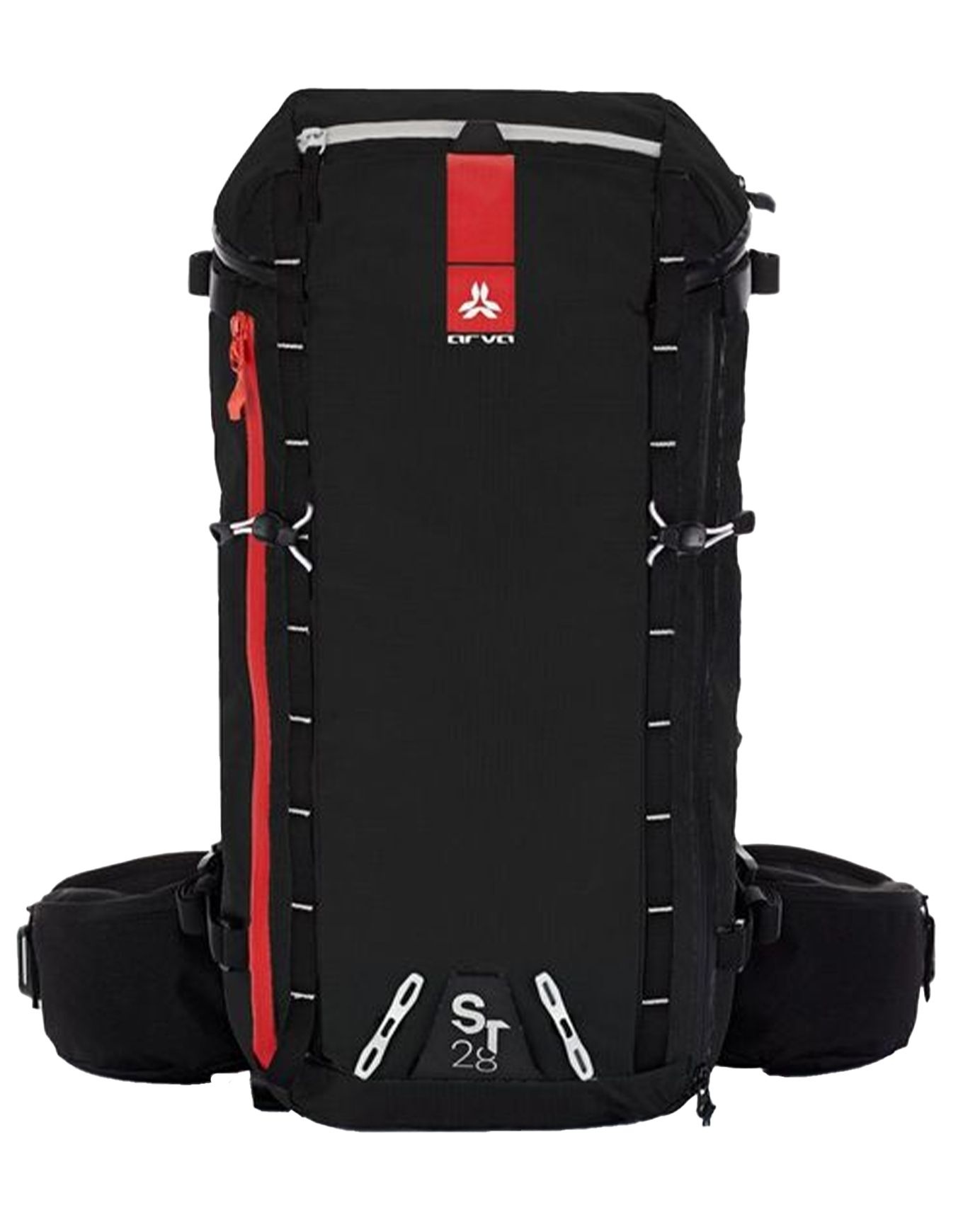 Sac à dos Arva ST28 Black 28 L pour ski de rando, freerando et alpinisme, avec dos Aero-Frame respirant, ceinture ergonomique à poches, compartiment sécurité dédié, porte-skis, piolets, casque et fixations raquettes/snowboard, en matériaux recyclés.
