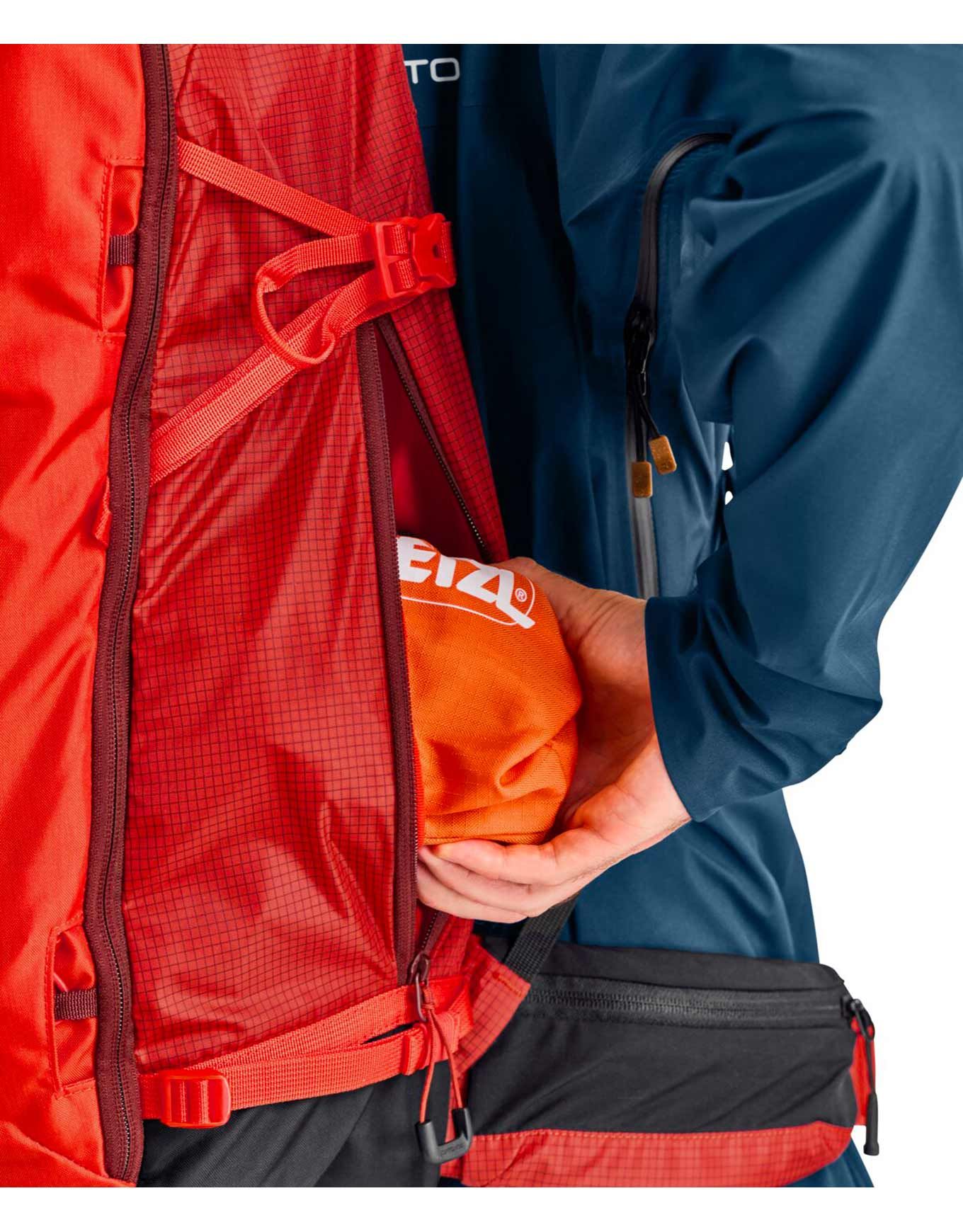 Que ce soit les poches situées sur les épaules et les hanches, le compartiment latéral destiné aux crampons, peaux et couteaux, ou encore les porte-skis, l’ensemble des rangements est pensé pour l’efficacité ! Un compartiment séparé pour le matériel de sécurité permet d’emporter l’essentiel et d’y fixer un piolet léger, alors que les multiples supports accueilleront votre casque, des bâtons, une corde, entre autres équipements.