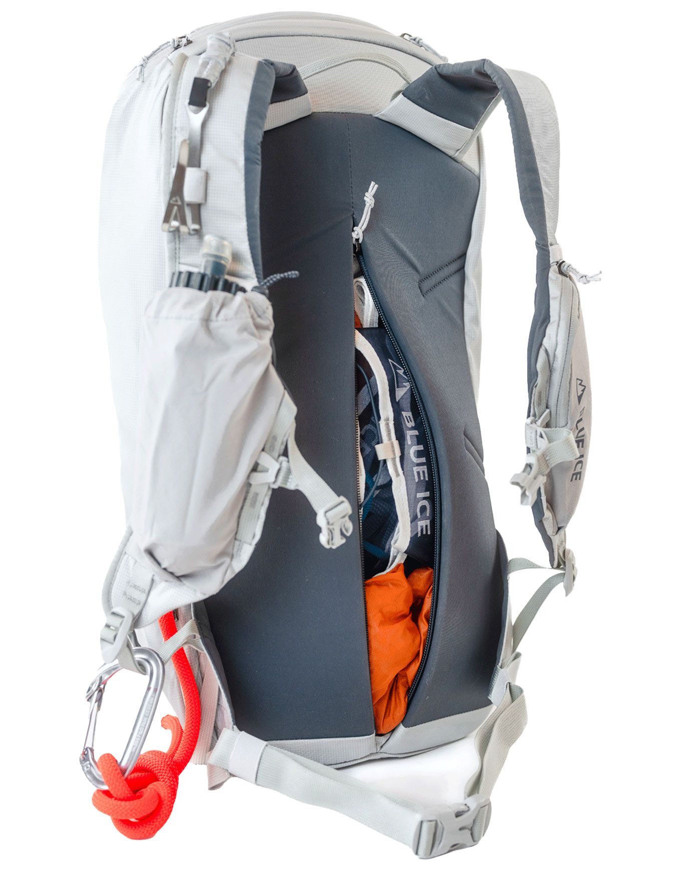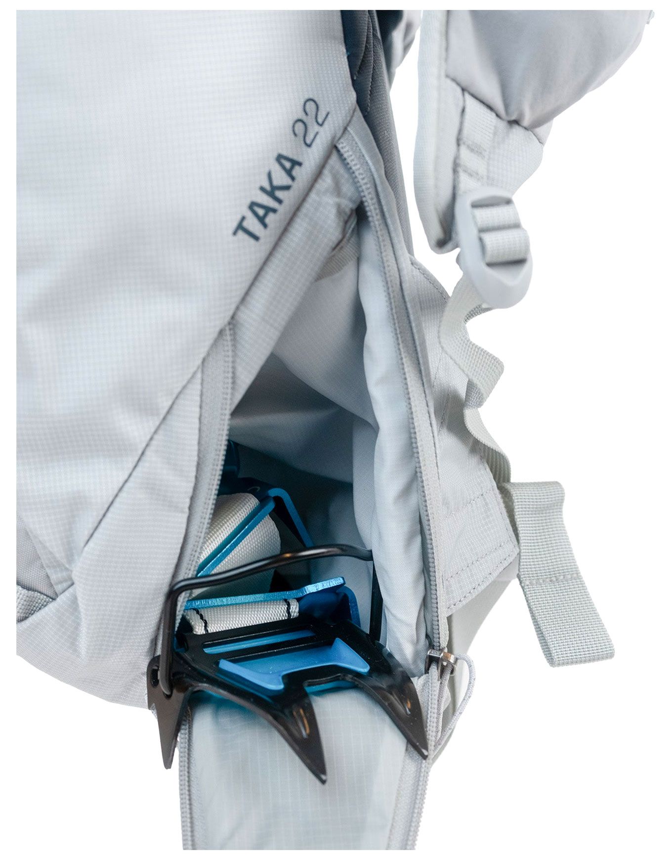 Le sac à dos Blue Ice Taka 22 Glacier Grey est conçu pour le ski de randonnée avec porte-skis diagonal/latéral, poche avalanche, accès dorsal et top, bretelles ergonomiques et éléments amovibles pour alléger 100 g.
