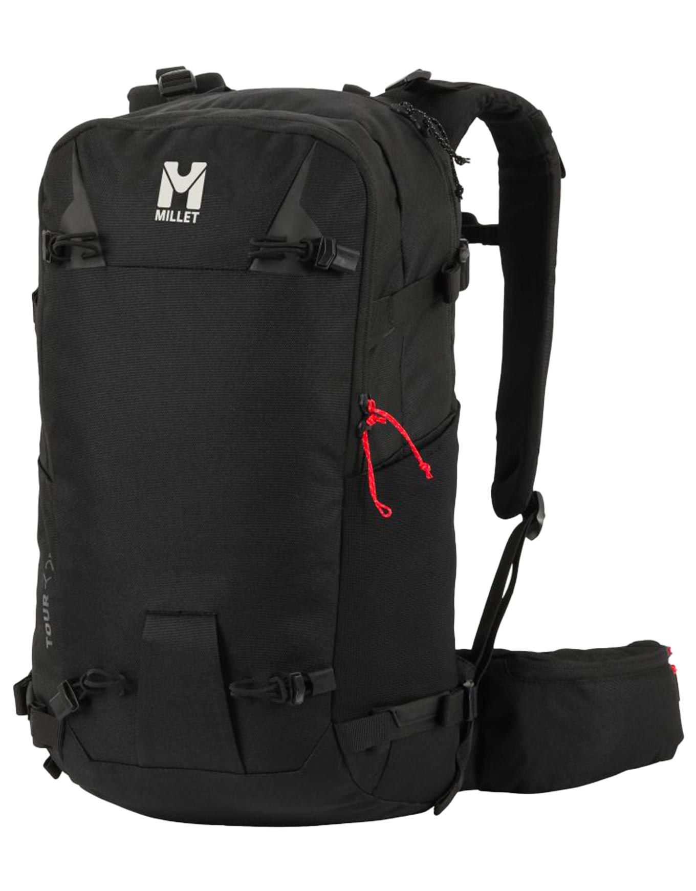 Sac à dos de ski de randonnée Millet Tour 25 Black, 25 L compressibles, accès latéral skis, porte-piolets, compartiment pelle/sonde, bretelles et ceinture ergonomiques ajustables pour le confort en sortie journalière.