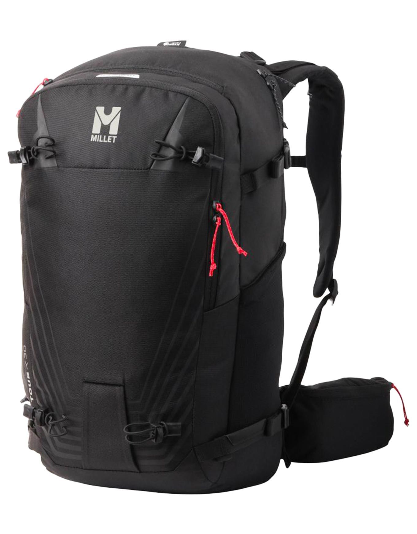 Sac à dos de ski de randonnée Millet Tour 30 Black, 30 L en tissus 100 % recyclés, accès rapide au kit sécurité, porte-skis diagonal/latéral, bretelles ergonomiques et ceinture ajustable pour un confort stable sur 2-3 jours.