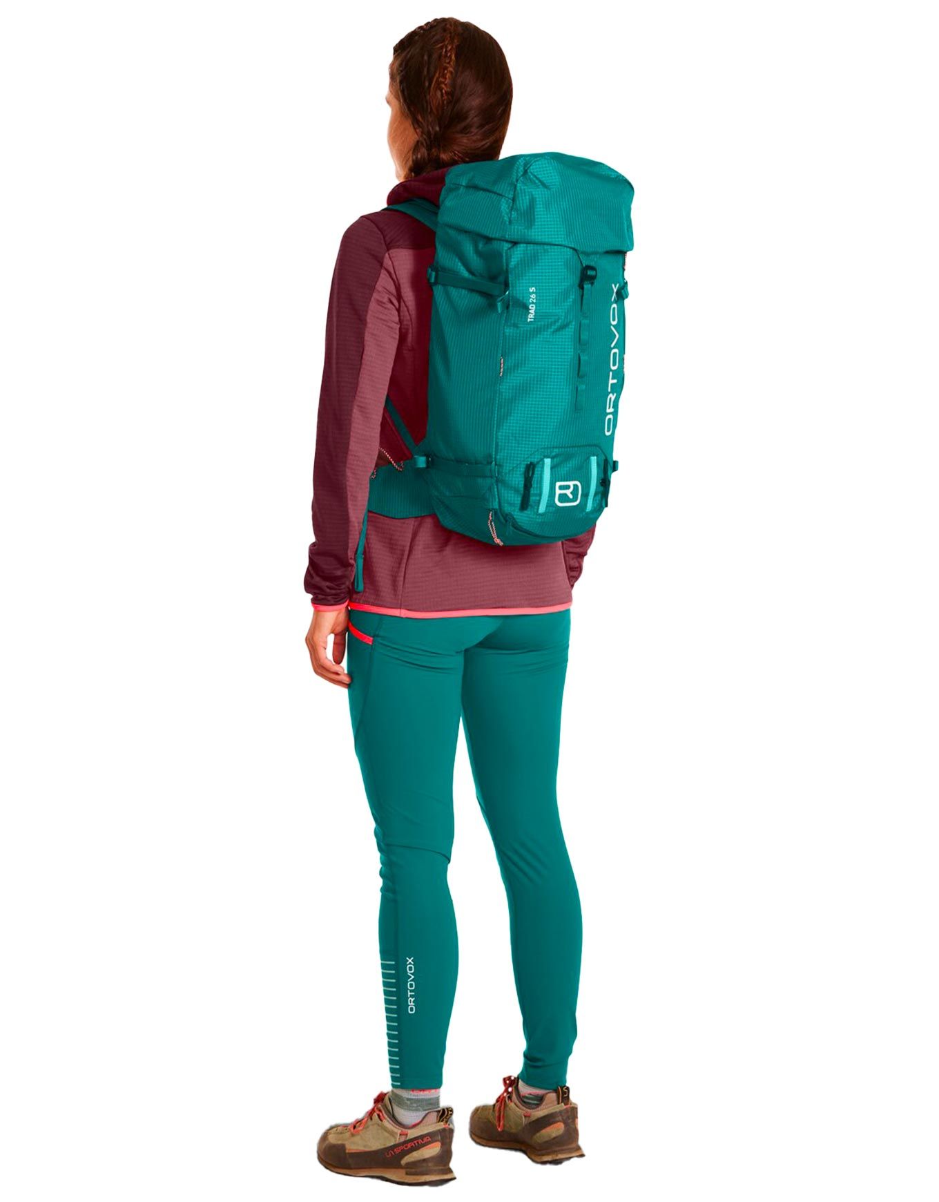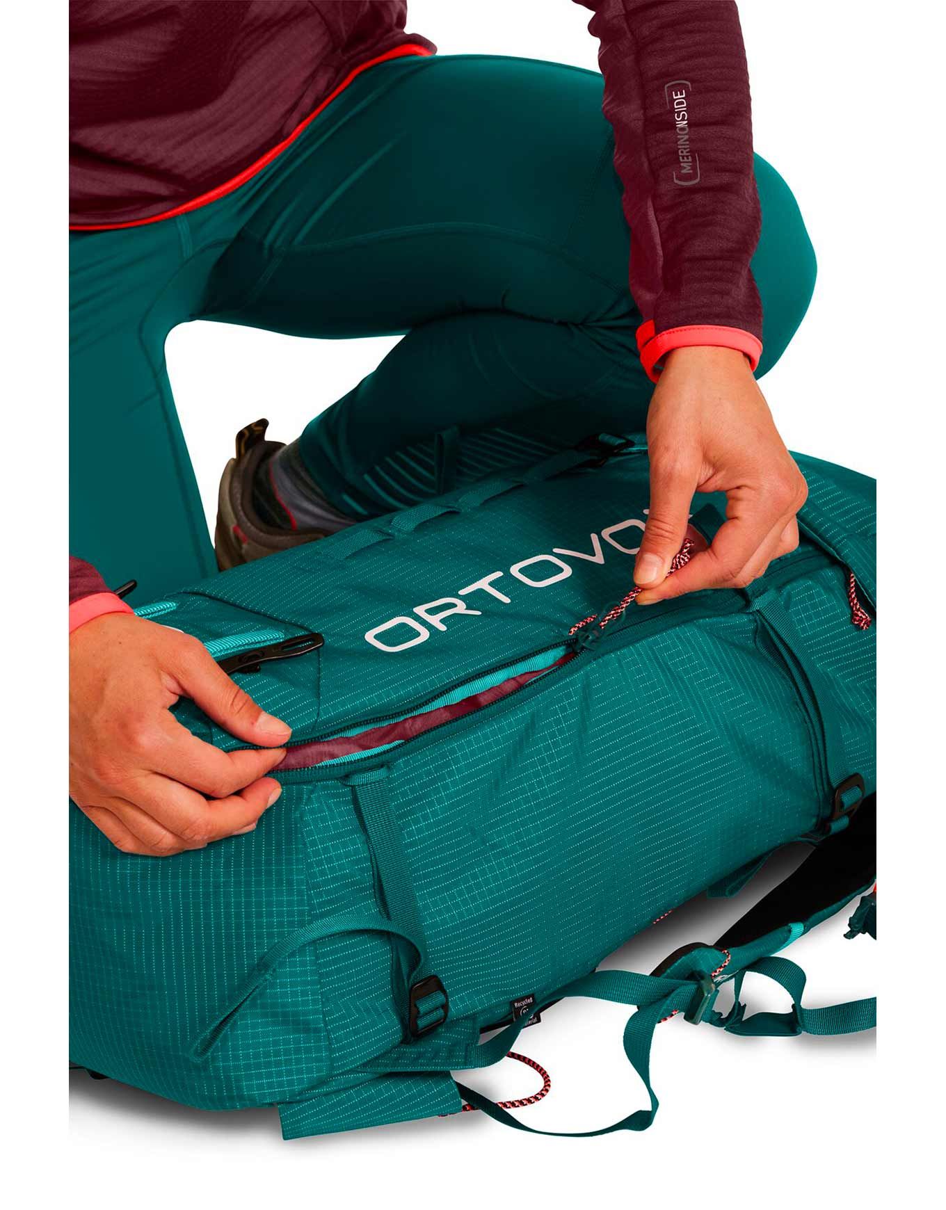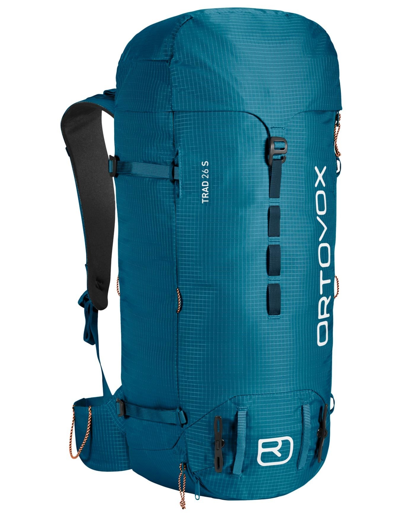 Sac d’alpinisme Ortovox Trad 26S Petrol Blue, 26 L, dos ergonomique court, ouverture haut + avant, 3 compartiments, système dorsal 3D aéré, structure aluminium amovible, polyamide ripstop recyclé 88 %.
