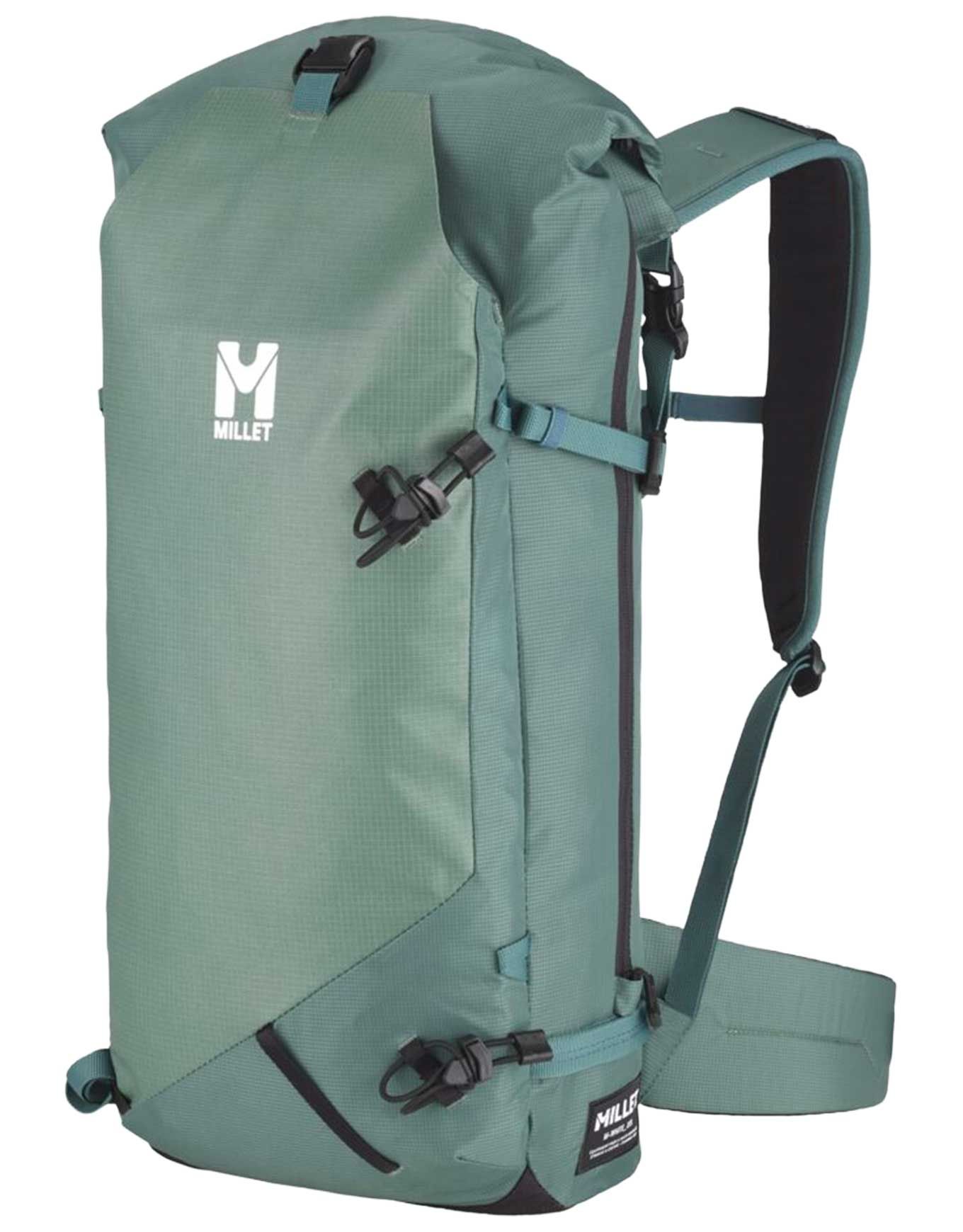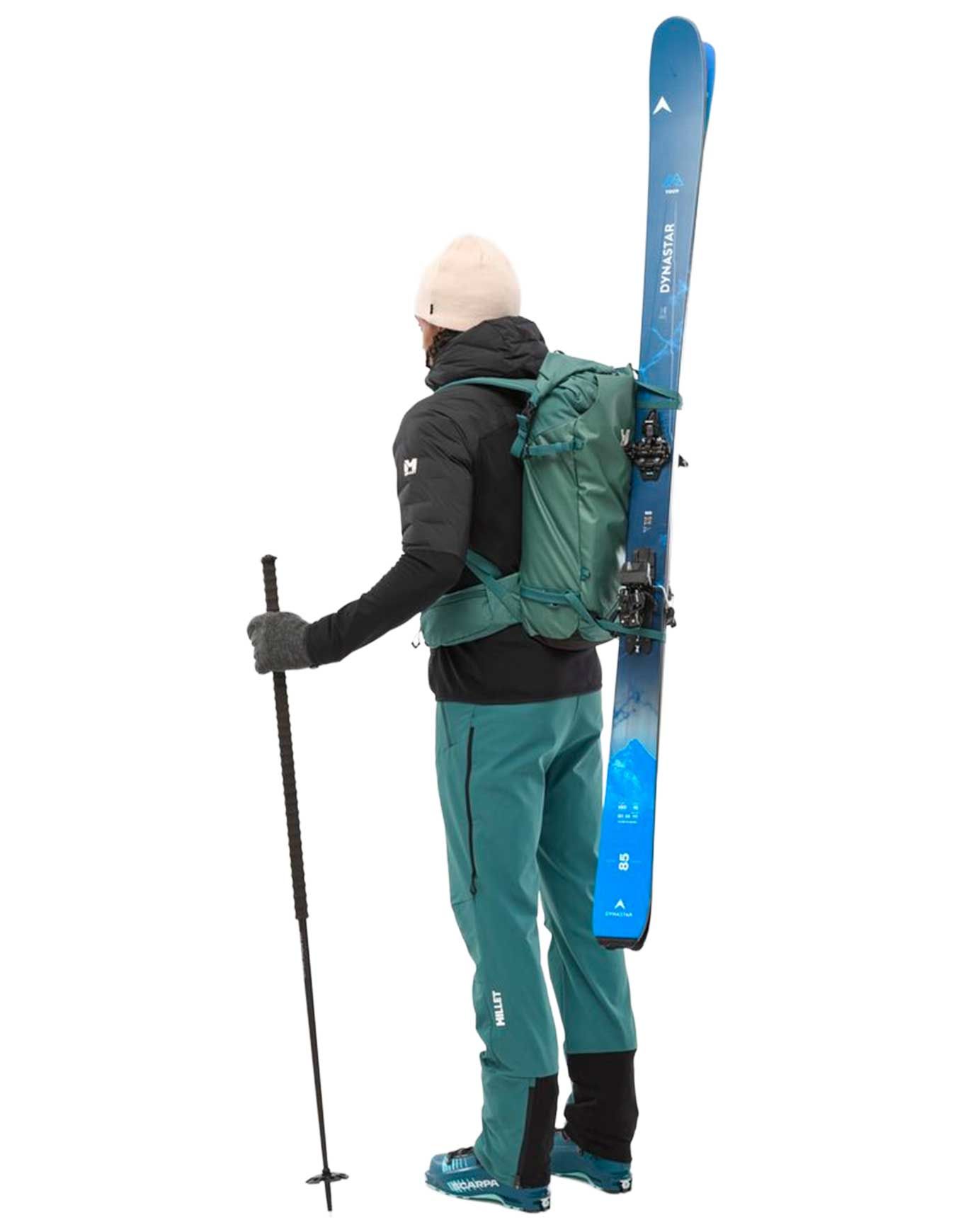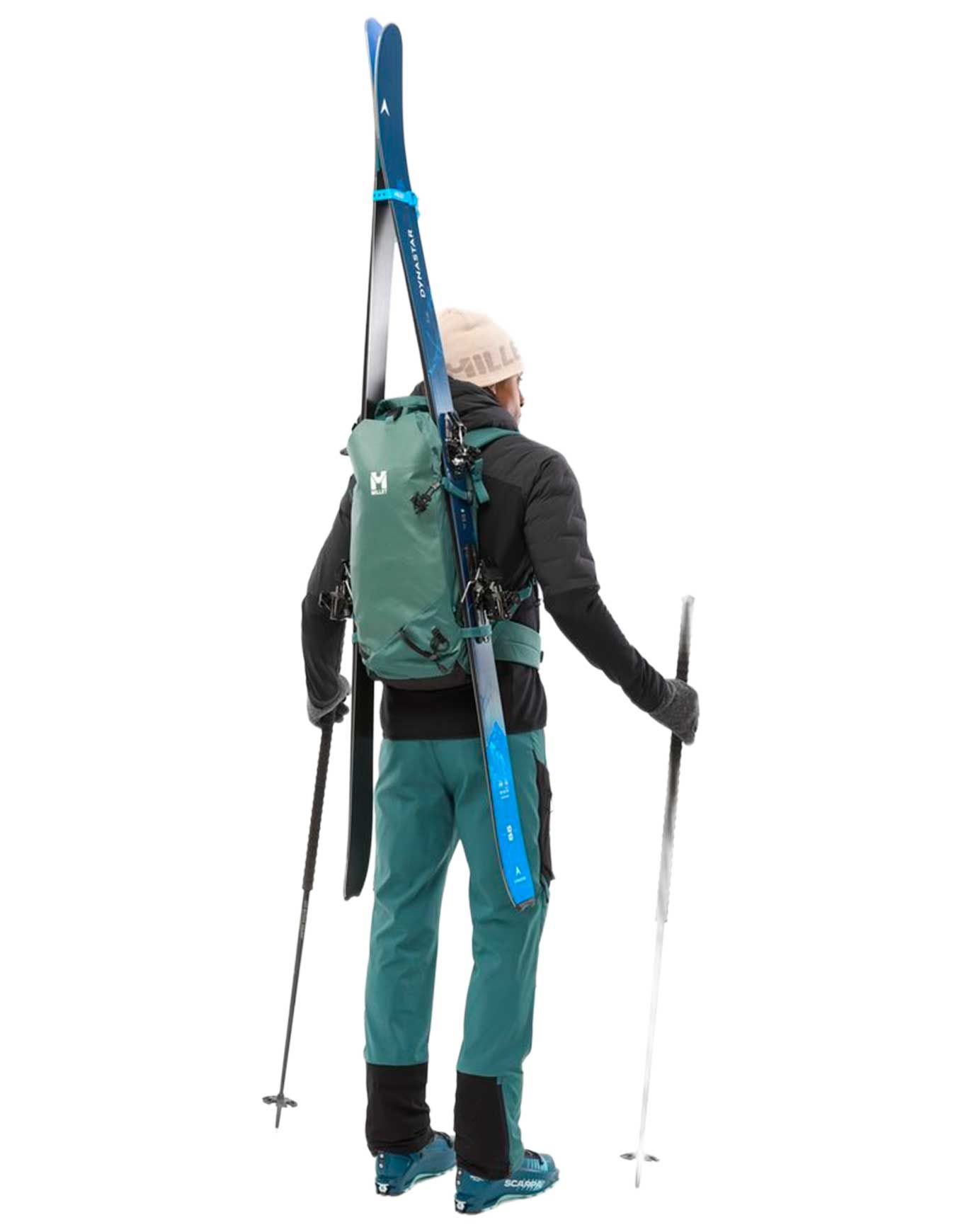 Sac à dos de ski de randonnée Millet White 22 Bottle en polyamide recyclé résistant, avec porte-skis diagonal/latéral, porte-piolets, casque amovible et compartiment sécurité pour un accès rapide.