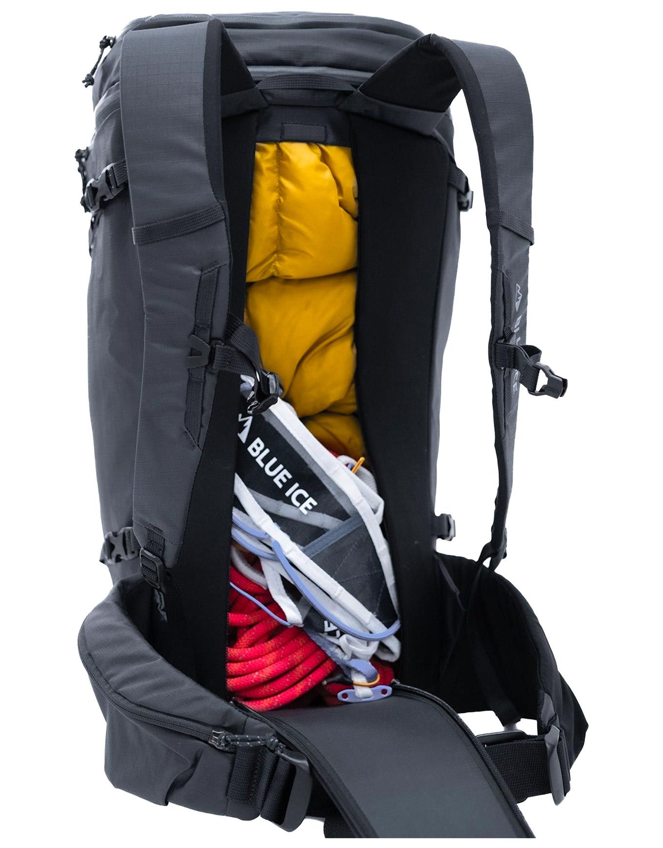 Sac à dos Blue Ice Yagi 28 Vulcan 28 L pour ski de rando et freeride, accès rapide sécurité, poche ceinture, portage ski/snowboard, porte-piolet et casque inclus.