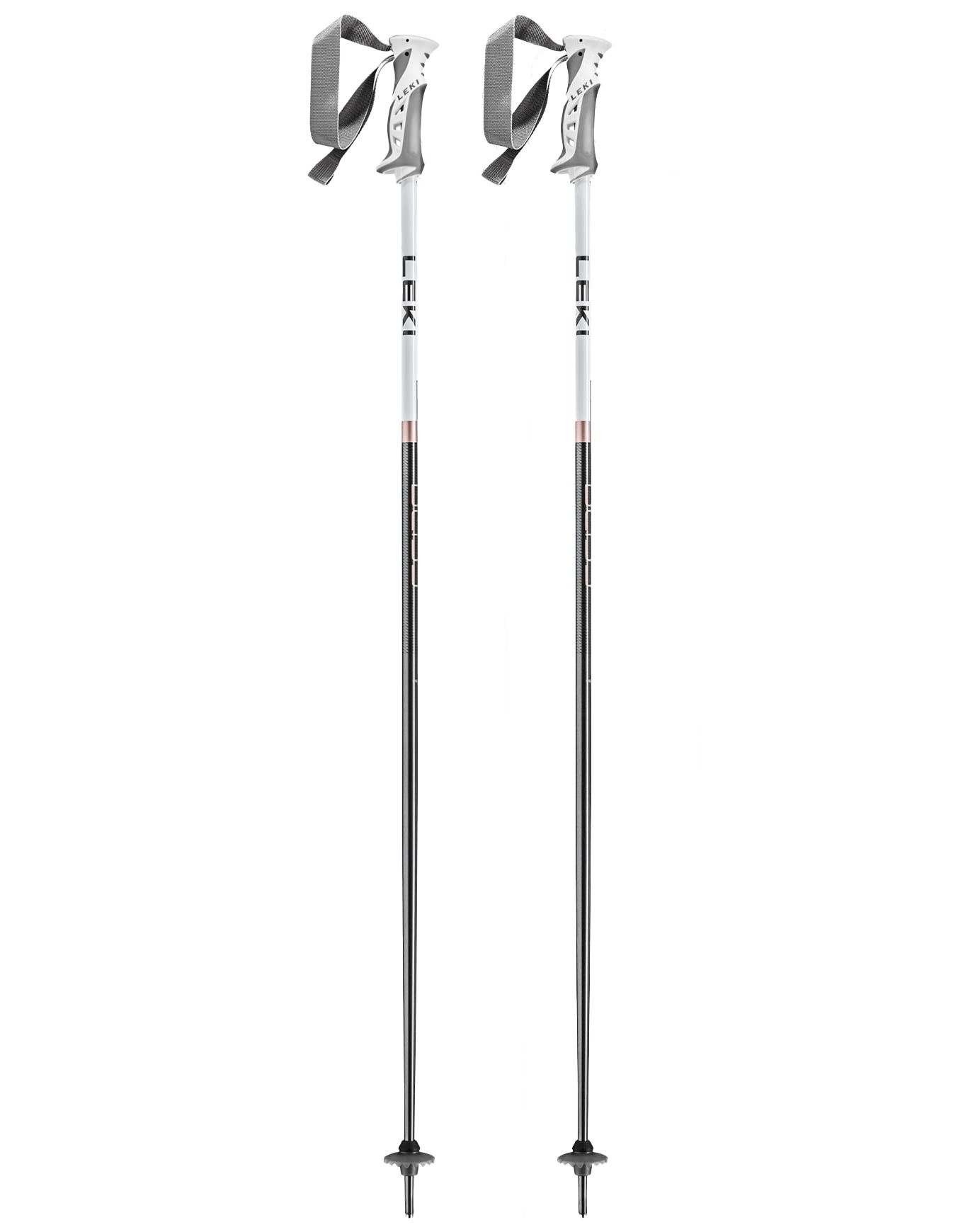 Bâtons de ski alpin Leki Bliss Lady en aluminium léger, poignée Pas V2 avec système de sécurité PA, dragonne Lock Security respirante, rondelles Racing/Trekking et pointes acier pour accroche fiable.