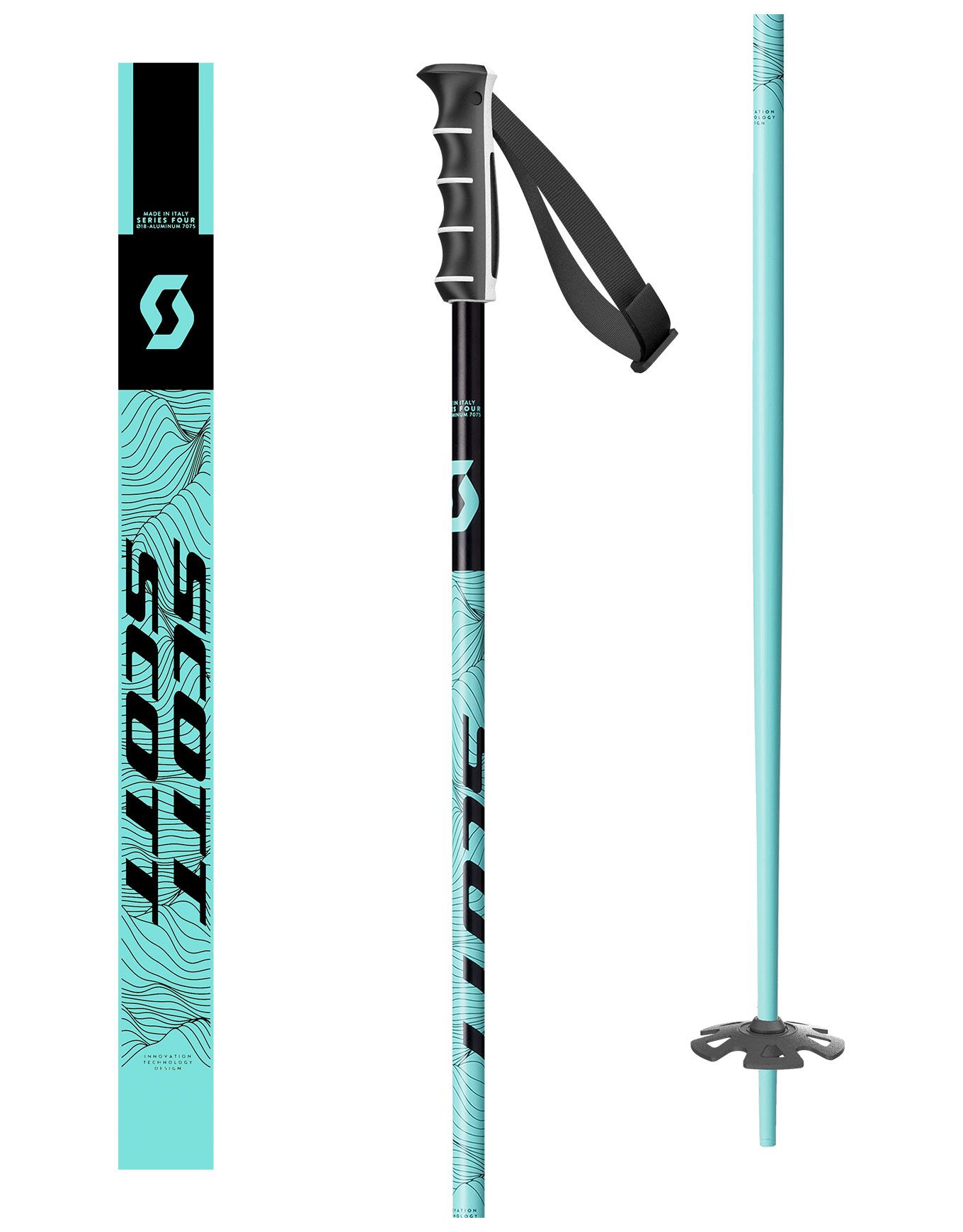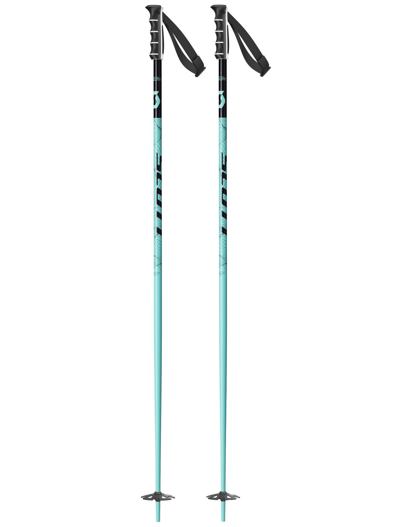 Bâton de ski freeride Scott Sea Mint Green en aluminium 18 mm avec poignée Notch 2.0, dragonne réglable FX15x25, pointe acier facettée et rondelle neige fraîche pour stabilité et maniabilité optimales.