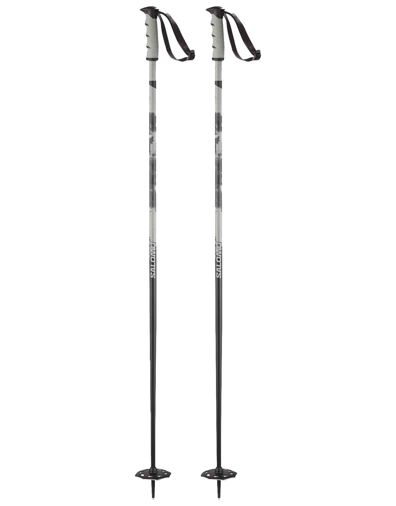 Bâton de ski Salomon Steep Black/Grey 18 mm en aluminium, 250 g, avec rondelles larges interchangeables pour neige profonde et poignée caoutchouc double matière pour prise fiable en freeski et randonnée.