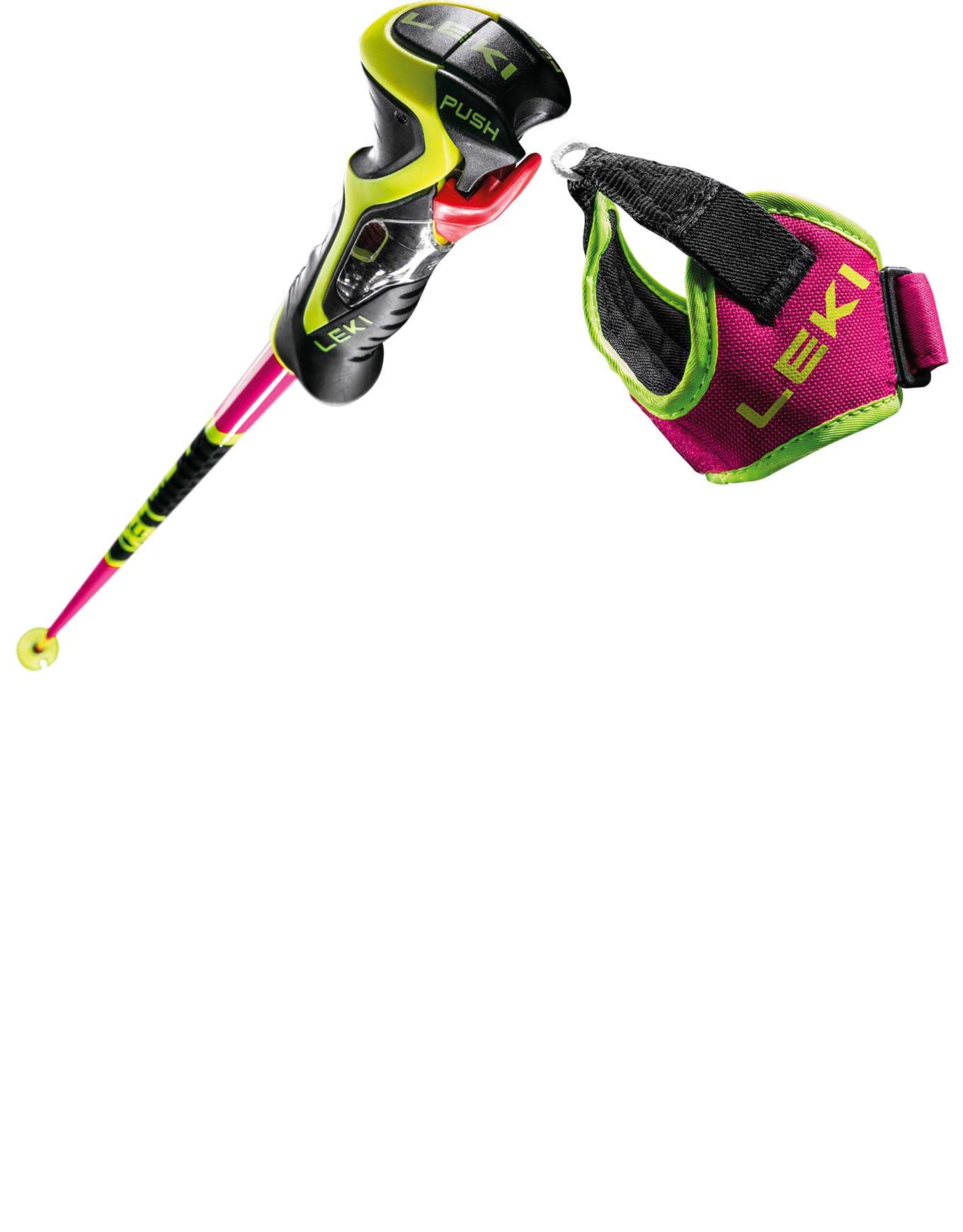 Bâtons de ski Leki Venom SL 3D Pink Neon pink femme, construction aluminium HTS 6.5 et carbone pour robustesse et légèreté, poignée Trigger 3D Sl avec déclenchement sécurisé, dragonne réglable, rondelles interchangeables et pointes Flex Tip carbure pour précision sur neige.