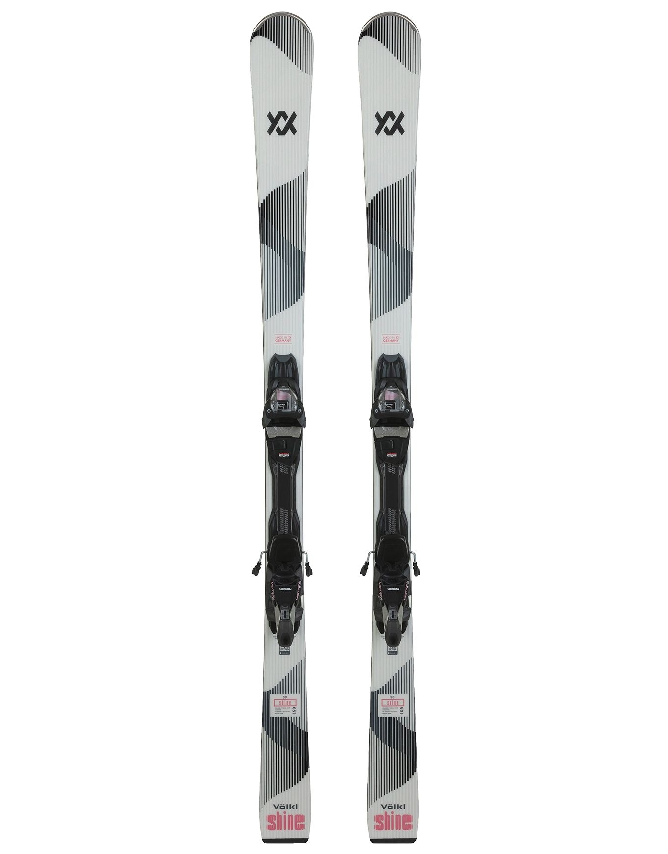 Ski de piste sportif Völkl Shine SC W 2026 pour skieuses intermédiaires à confirmées, avec fixations Vmot 11 Tcx. Noyau bois, chants latéraux intégraux et bande centrale Titanal pour virages courts rapides, glisse P-TEX 2100 durable.