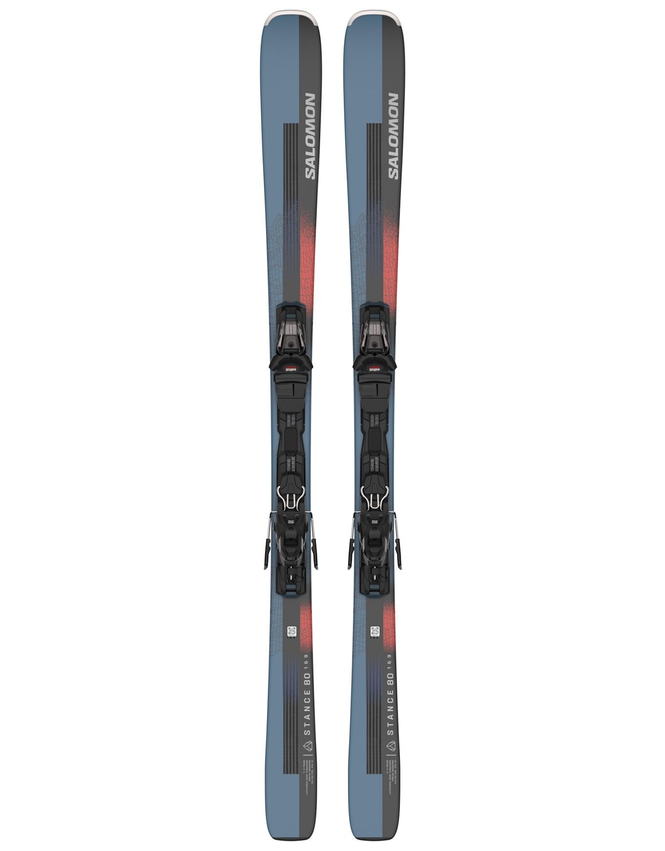 Skis all-mountain Salomon E Stance 80 Pm + M11 Gw unisexe, idéal débutant à intermédiaire. Noyau bois et titane pour stabilité, accroche et dynamisme sur piste damée ou glacée.
