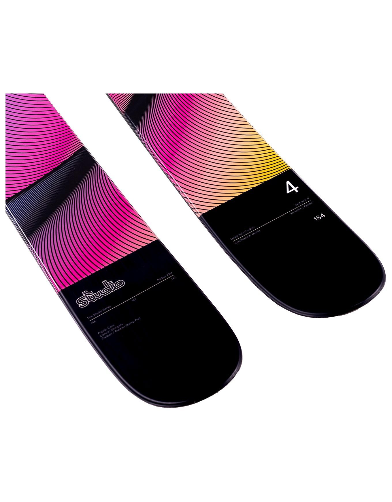 Malgré cette diversité de largeurs, une architecture identique structure l’ensemble de la gamme Studio. Un âme en peuplier constitue le cœur de ces skis, renforcée par des fibres de carbone qui confèrent à la fois maniabilité et excellent amorti des vibrations. Des profils à rocker prononcé équipent également ces modèles, complétés par des spatules et talons robustes dotés d’une rigidité notable, sans oublier des flex élevés. Le résultat ? Un ski garantissant des réceptions optimales, une précision remarquable et une tenue de route irréprochable.