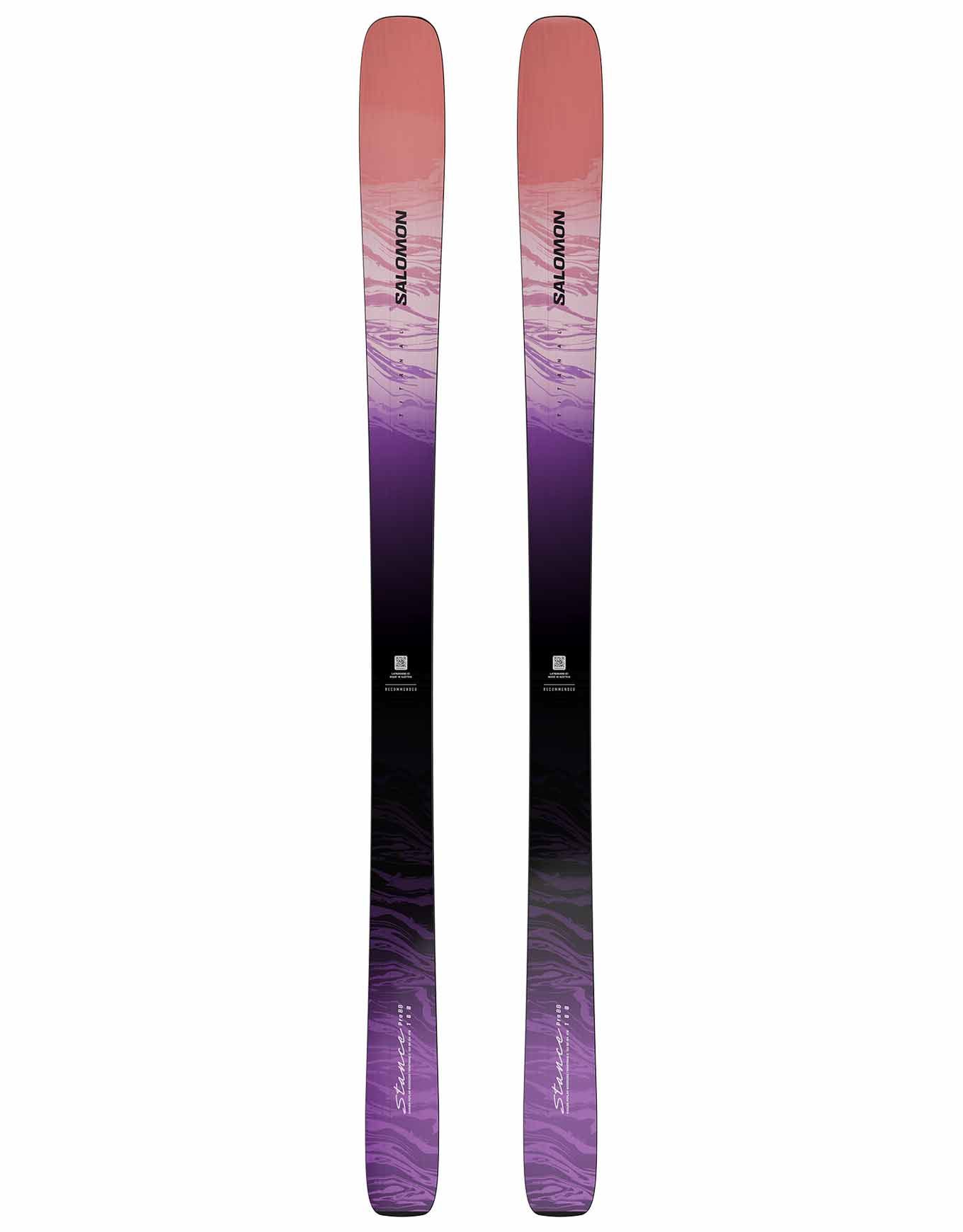 Salomon Stance Pro 88 2026, ski all-mountain femme 88 mm au patin, allie carres tenaces sur piste et double rocker pour la poudreuse. Noyau karuba/peuplier et double titanal : puissance, absorption des vibrations, maniabilité confirmée.